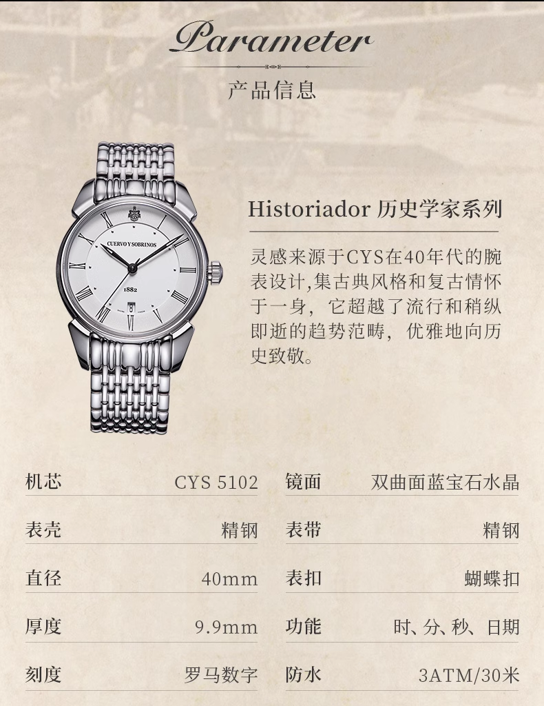 瑞士库尔沃 CYS-Historiador 历史学家系列 pequenos segundos 3195B.1CS.AR 机械男表 ¥24200