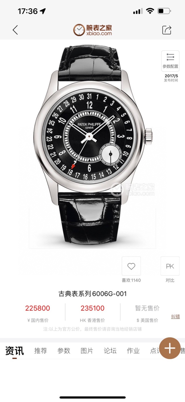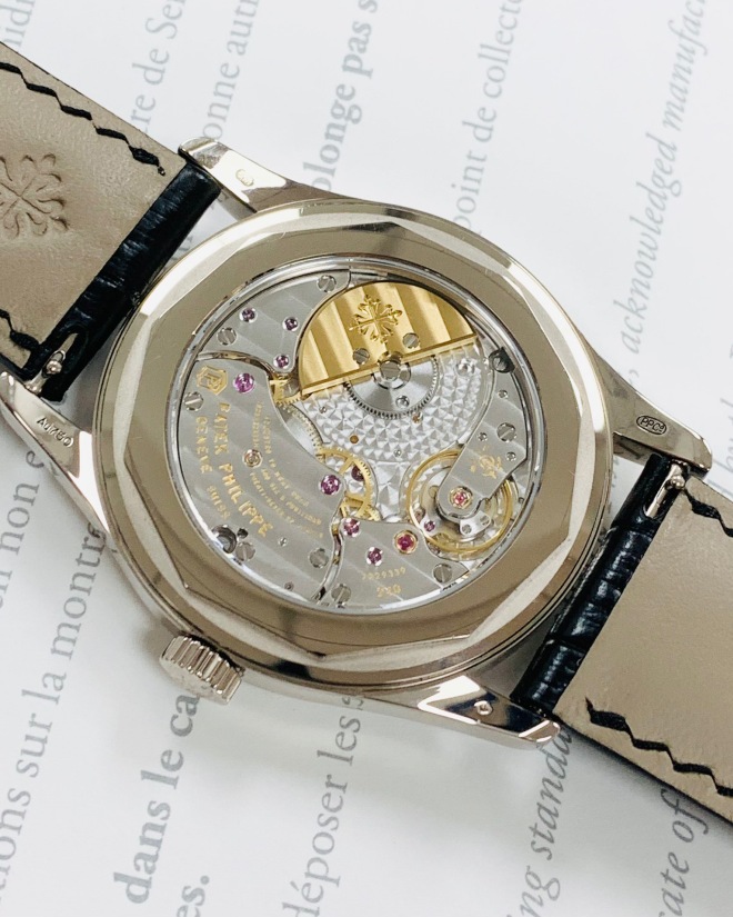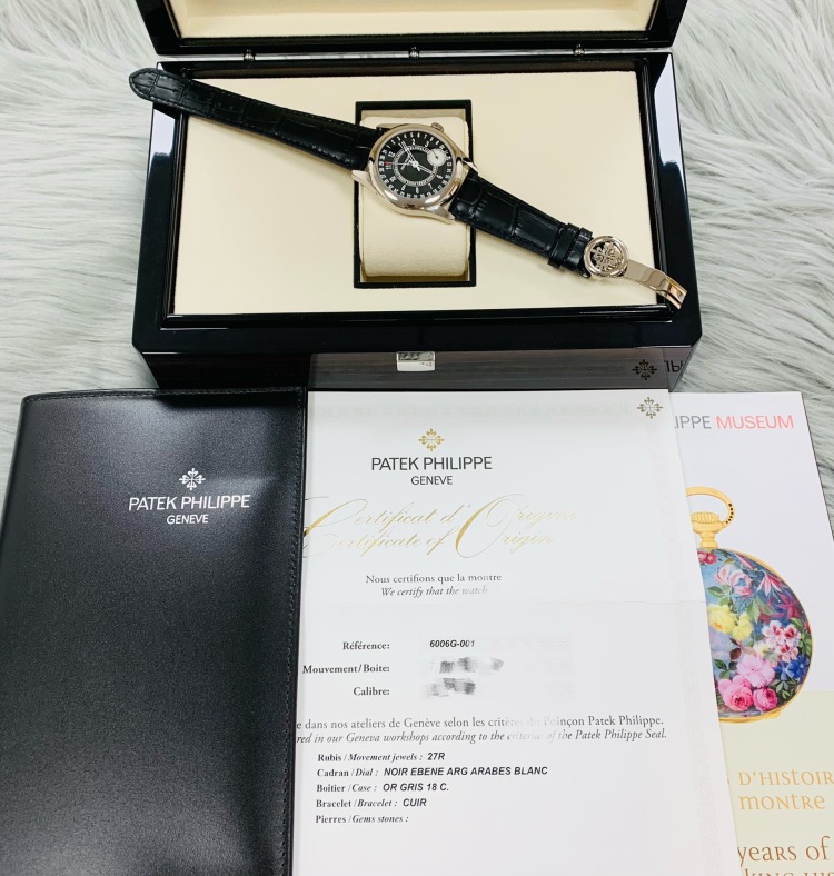 2019年5月全套PP/百达翡丽古典表系列6006G-001腕表,表径39MM,白金表壳,自动机械机芯双P印记,日期显示,公价225800元。