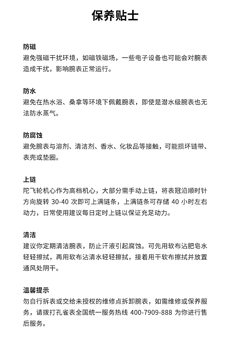 温馨提醒:任何手表都不建议佩戴淋浴(禁止高温),避免加速防水胶圈老化。为确保手表正常防水,建议1-2年检验一次防水功能,更多手表使用注意事项,详见手表品牌说明书。
