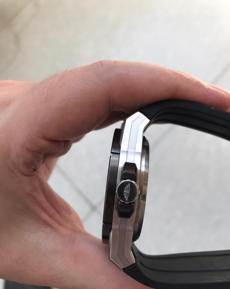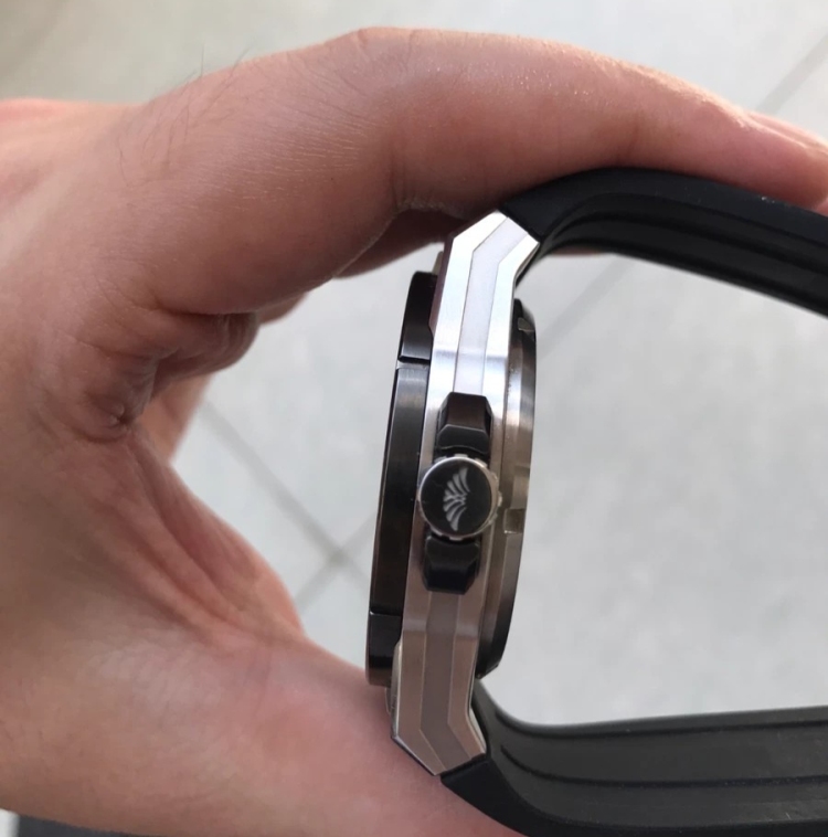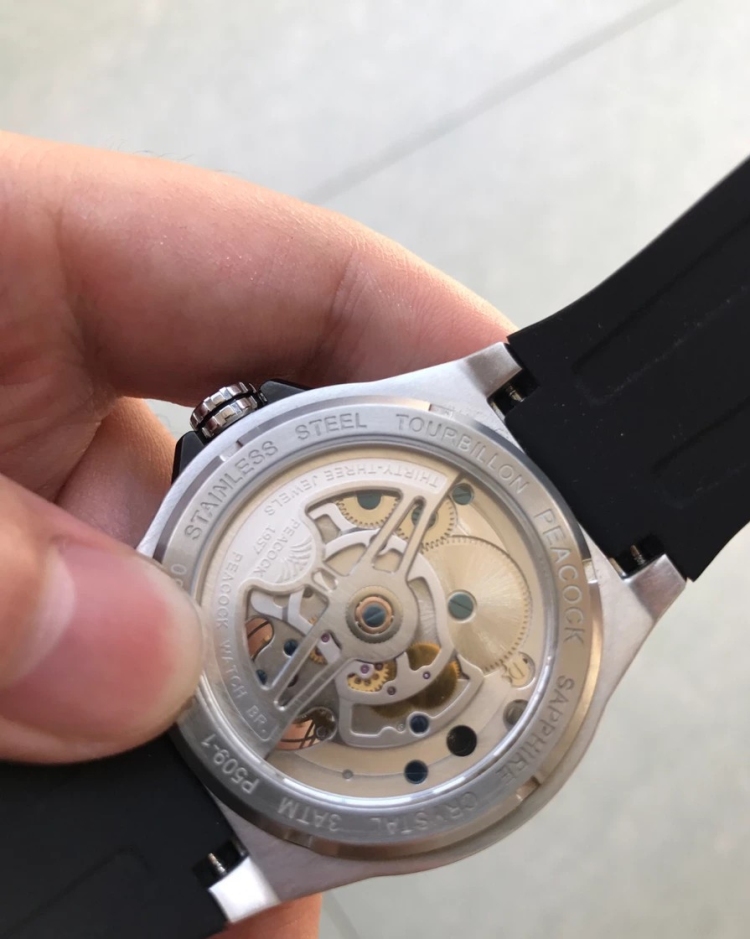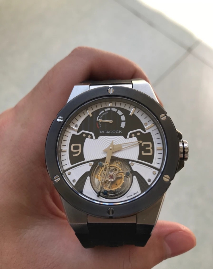 孔雀同轴自动陀飞轮,Peacock行者系列远航者P509-1,间枪色。该系列使用传统镂空工艺,赋予表盘以精致纹理与立体质感。表盘采用了双层油压纹工艺,上下两层配以不同颜色,突出表款的色彩个性。动显盘底纹油压条形纹路,产生动感的视觉弧度效果,7条钢色条钉指示整点,重点突出了“3”和“9”点位钢色金属质感。表盘内部拼接美学令读时更加精准,而中央表耳经过抛光与锻面交替打磨,壳身棱角均抛光处理,透露出时间与历史的痕迹。表壳采用精钢材质,直纹拉沙效果,壳身凹槽内喷砂,极致电镀工艺,则加工出不同的表壳及圈口颜色。贴合手腕的橡胶表带搭配一颗经手工润饰的自产机芯,时间温度被赋予了。保卡、盒子