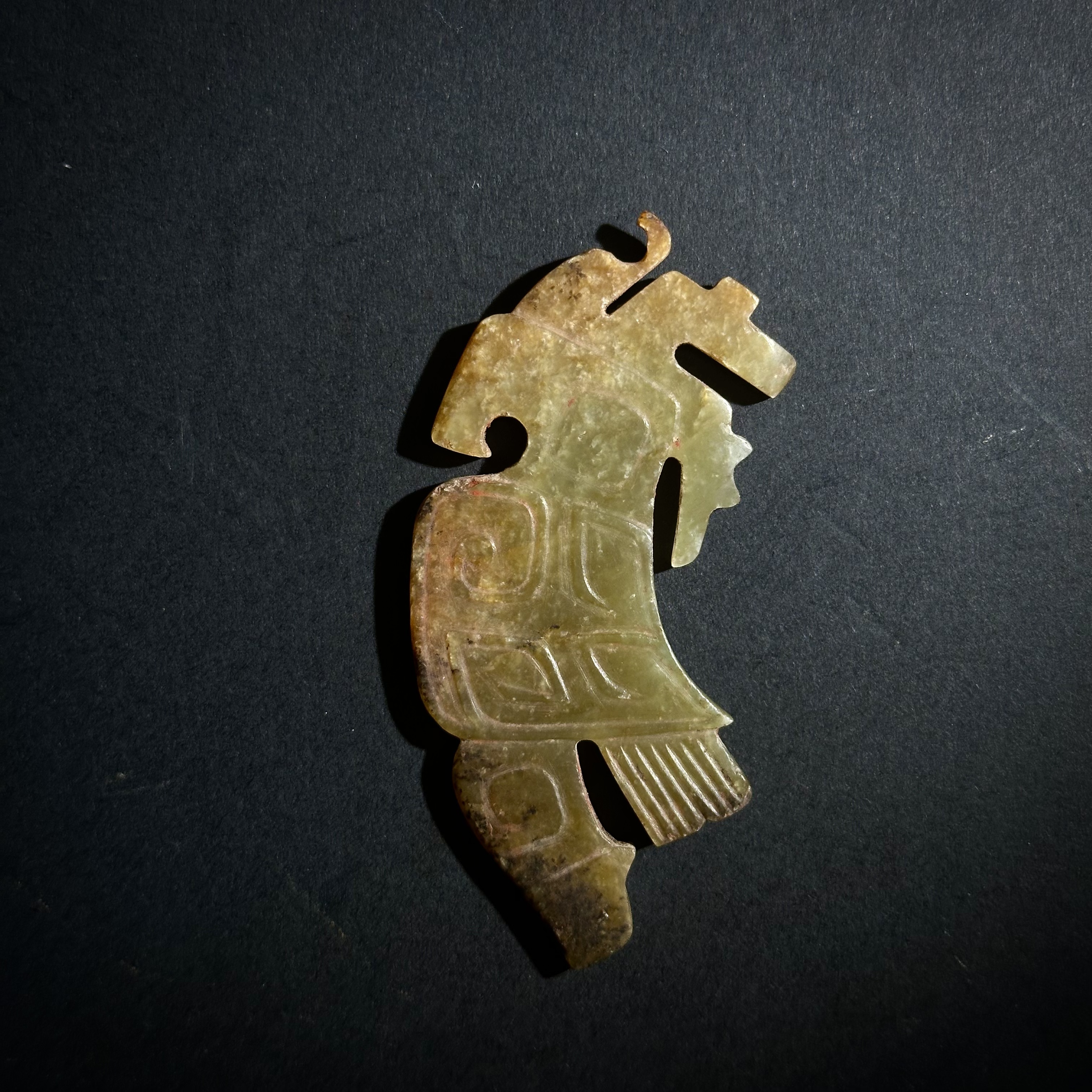 西周凤鸟玉佩,和田白玉为质,莹润如脂,局部带浓郁红土沁,色泽古雅。凤鸟造型灵动,线条婉转流畅,刀工精准传神,兼具雄浑与秀美,尽显西周玉雕之高超技艺与神秘气息.