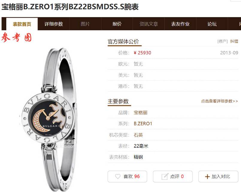 宝格丽B.ZERO1系列精钢原镶时标钻石英女表 腕周165mm 参考型号:BZ22BSMDSS.S 表径:28mm 附件:无----市场参考价:25930元