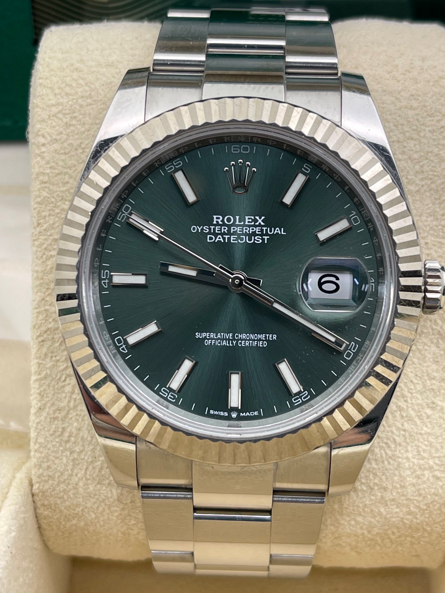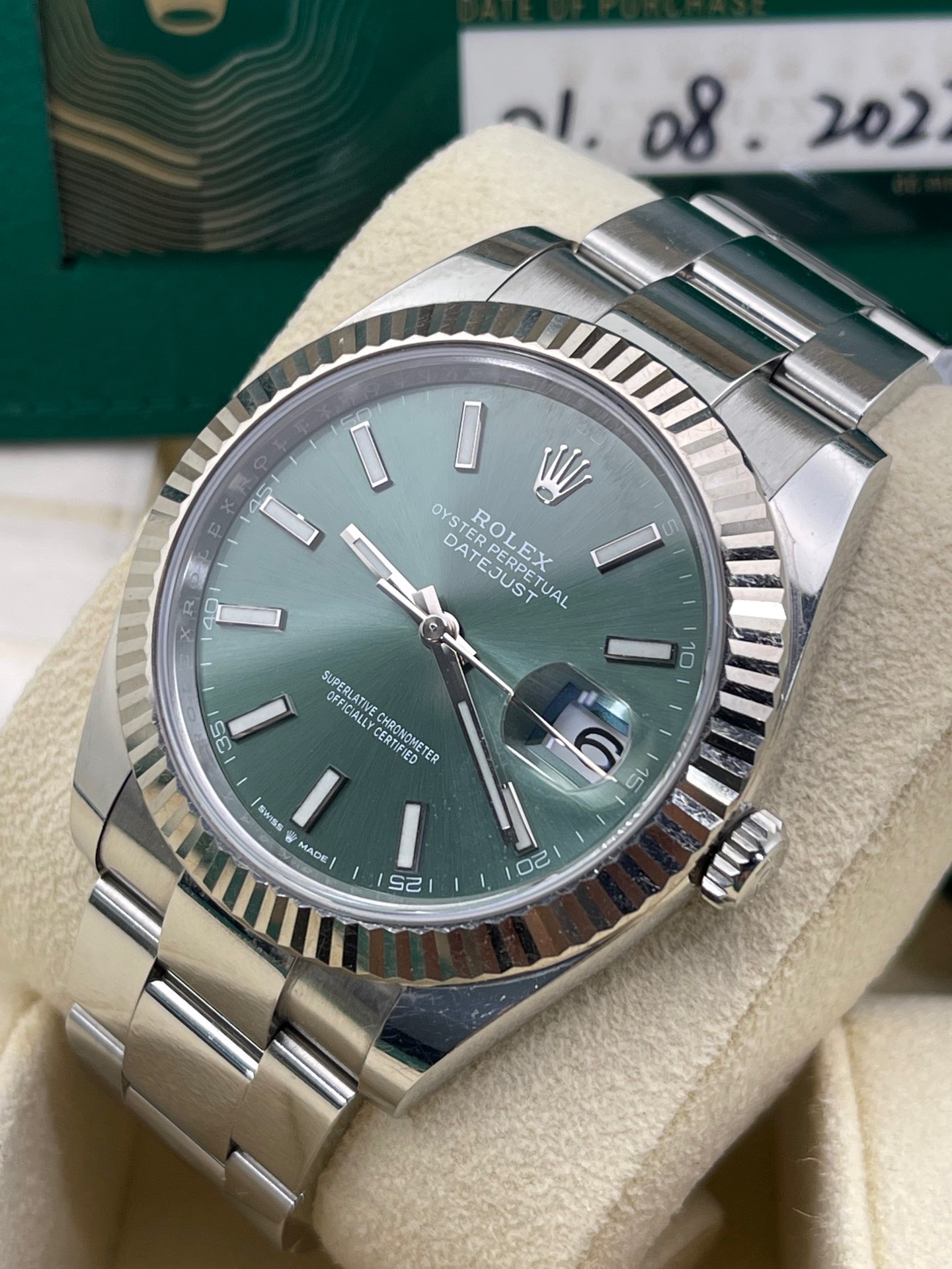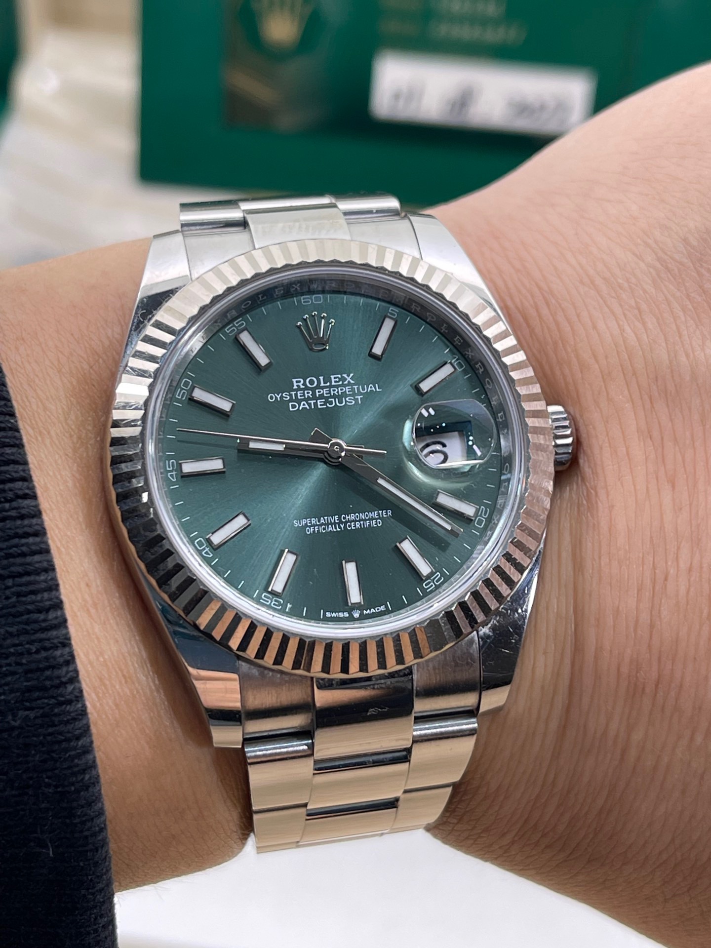 劳力士日志型系列126334-0027最新款薄荷绿盘面条刻 板带41mm表径,2022年8月卡国行大全套全长双吊牌 完美极品九九新成色 全新超公价热门款 店里现货好价️️同行可接 欢迎转发