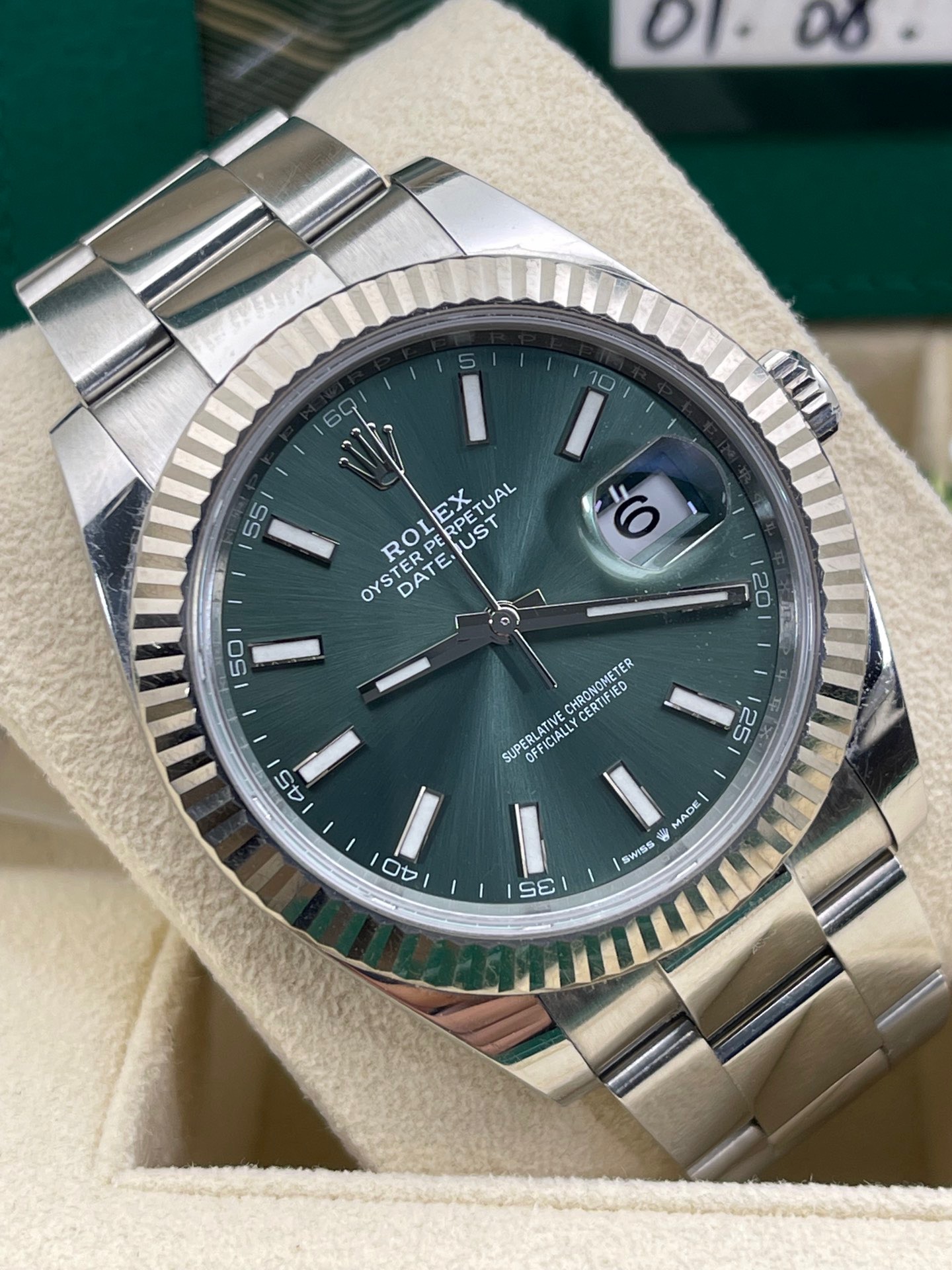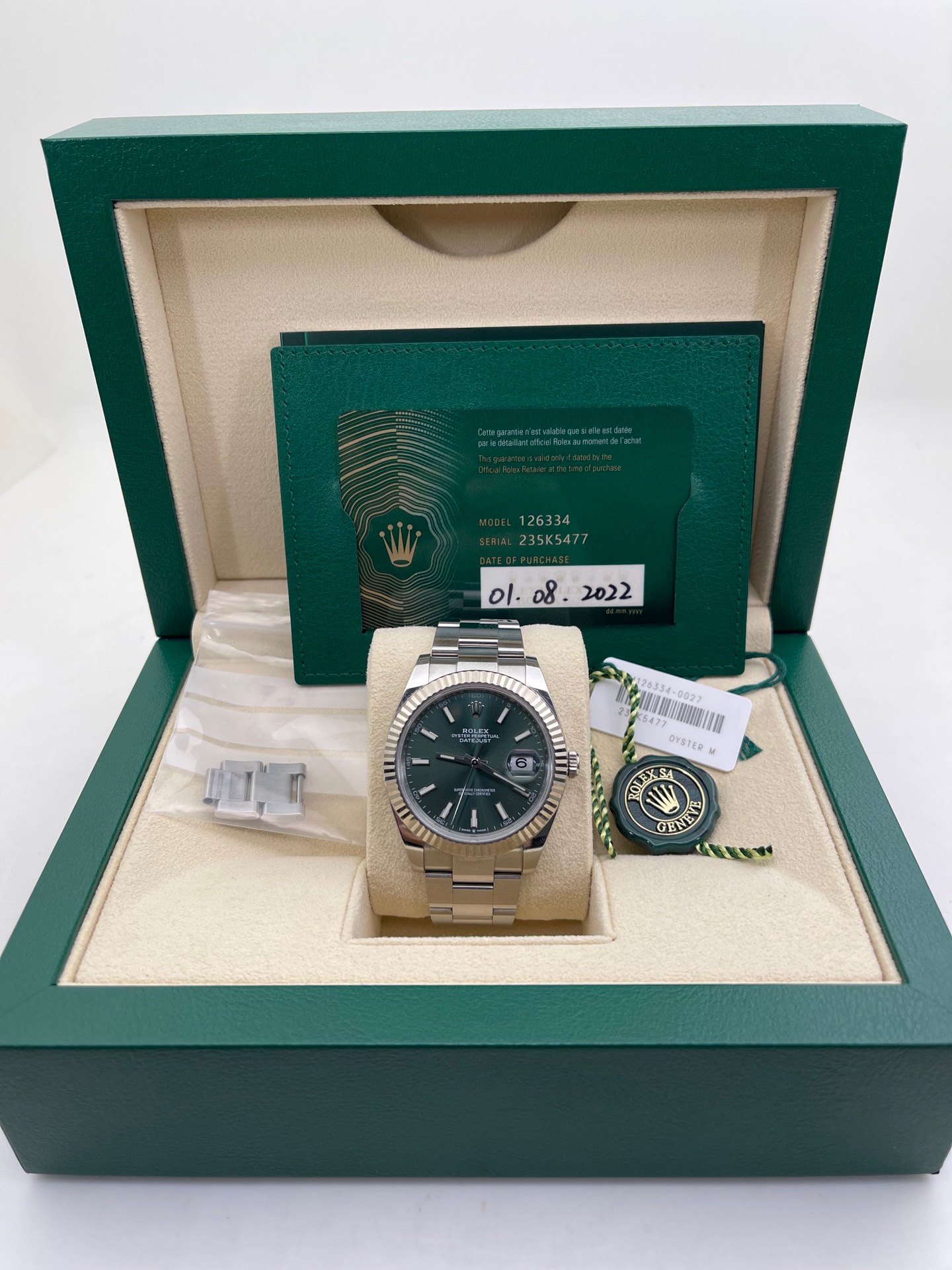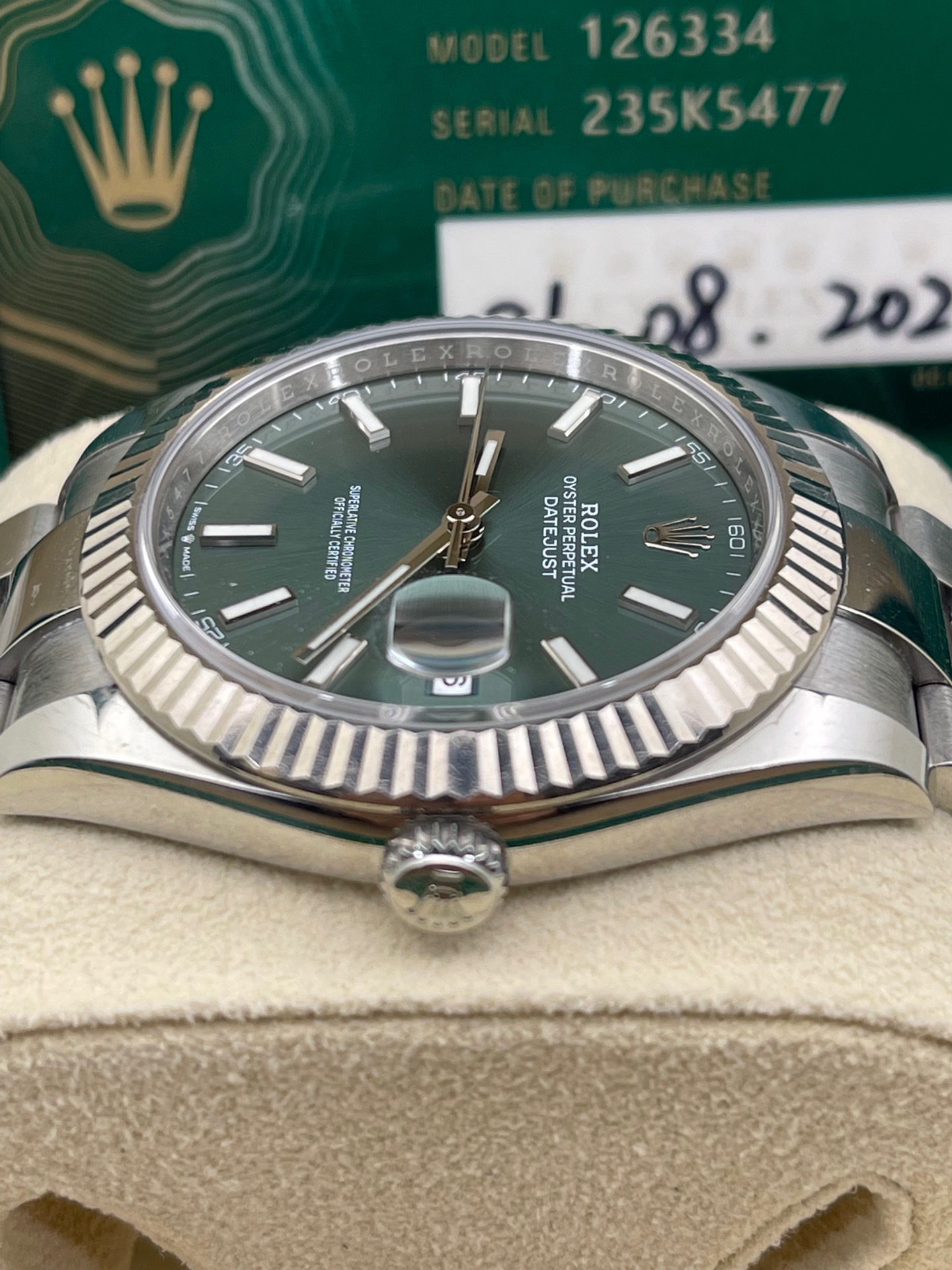 劳力士日志型系列126334-0027最新款薄荷绿盘面条刻 板带41mm表径,2022年8月卡国行大全套全长双吊牌 完美极品九九新成色 全新超公价热门款 店里现货好价️️同行可接 欢迎转发