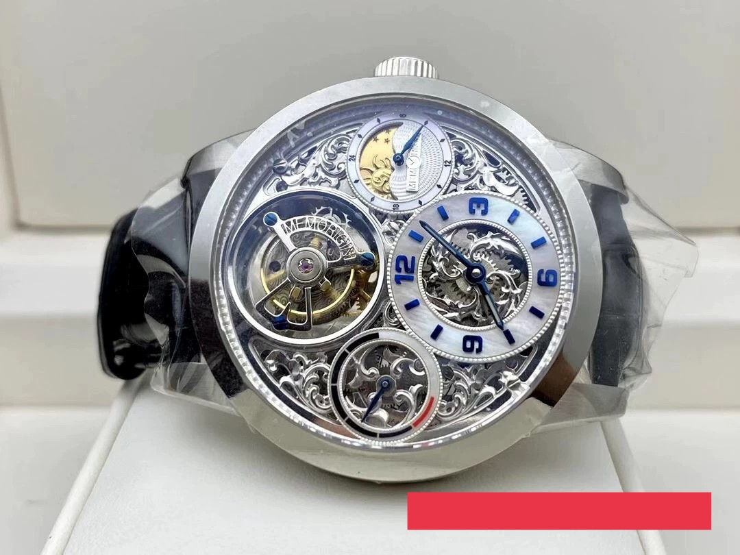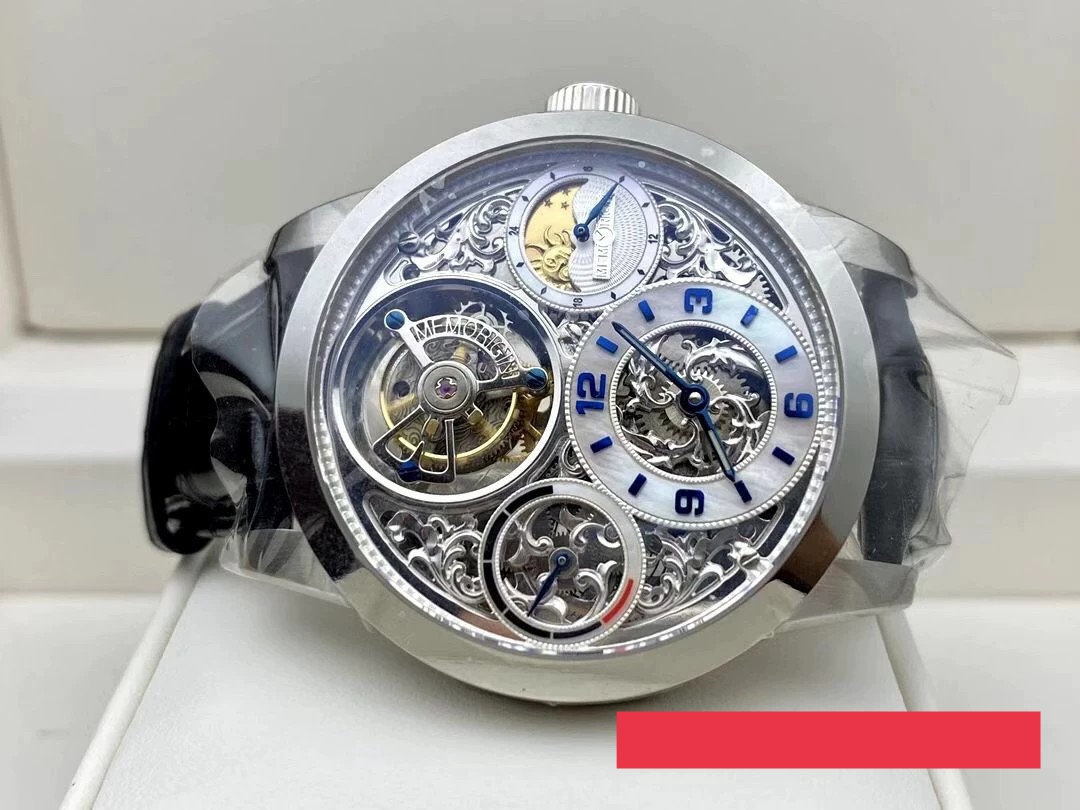 万希泉 星空传奇陀飞轮 [得意]戴着星空,带出动感,散发低调美感。43表经 3时位日月星辰,6时位时钟,9时位动储,12时位陀飞轮。亦是时尚、低调、沉实的代号。用实力去让人另眼相看,犹如流星划过的夜空,瞬间慑住你的心灵。