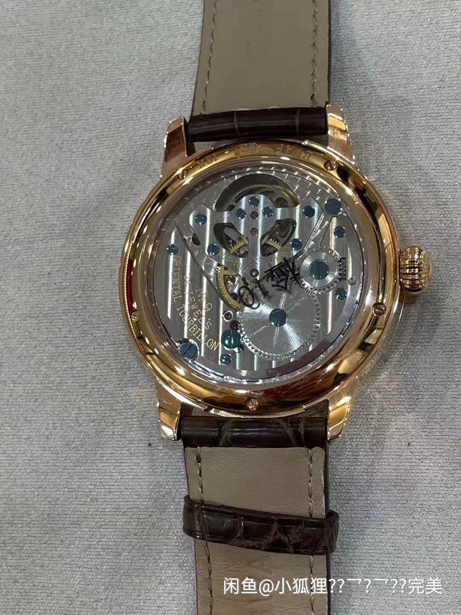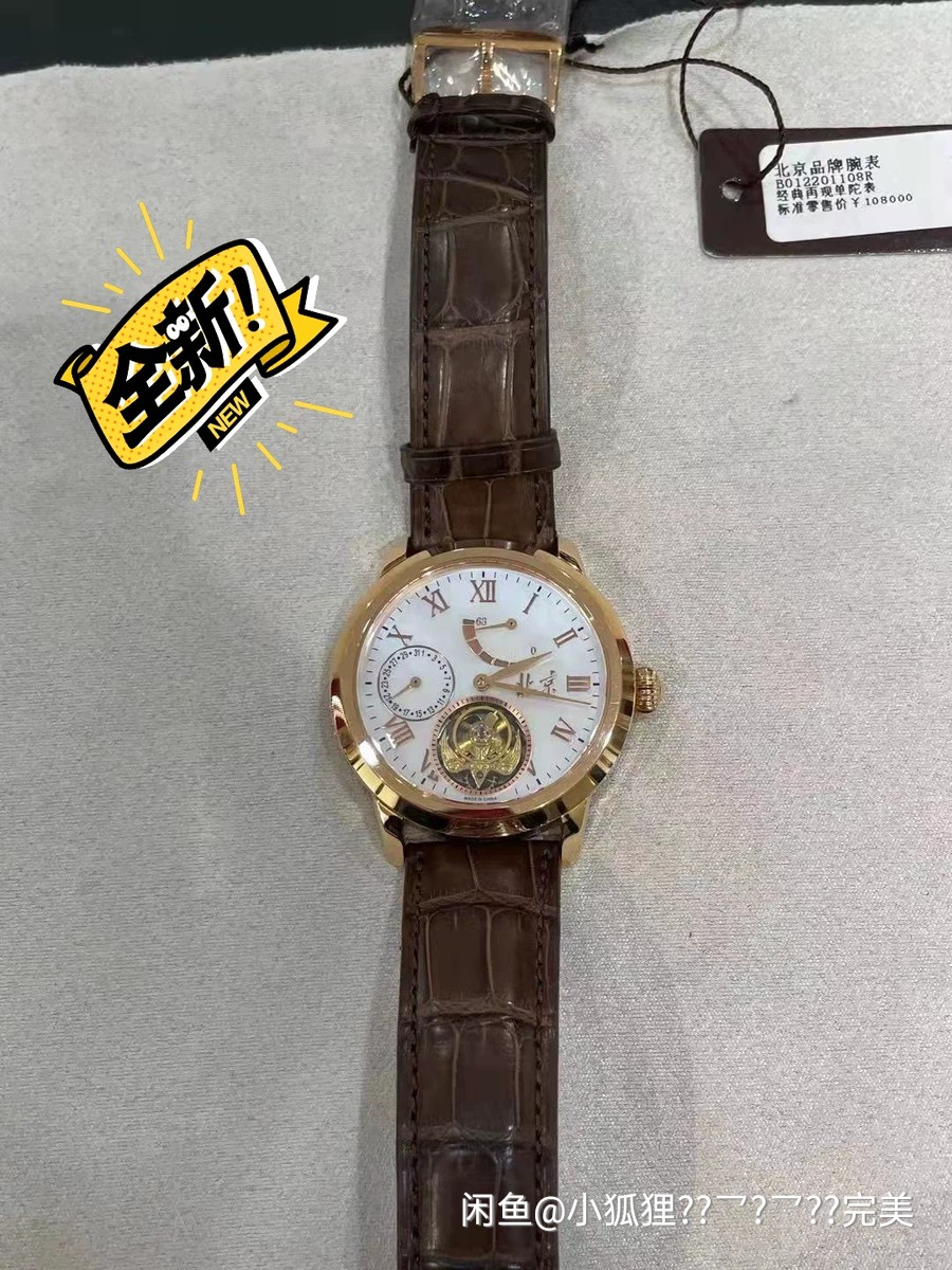 北京牌手表,表径:40毫米,18k金,中华灵燕陀飞轮,低温搪瓷表盘,动能显示,日历指针,附件全。