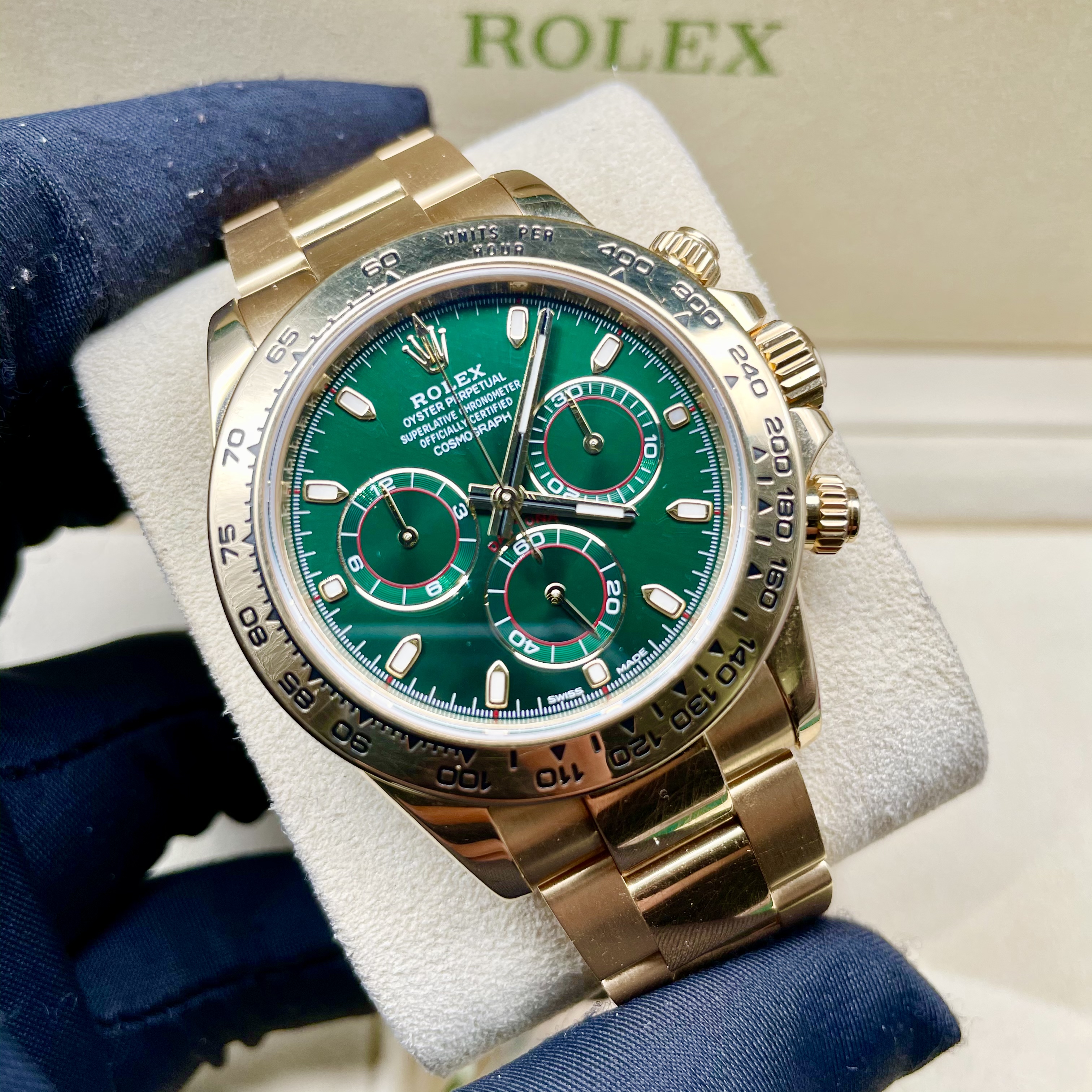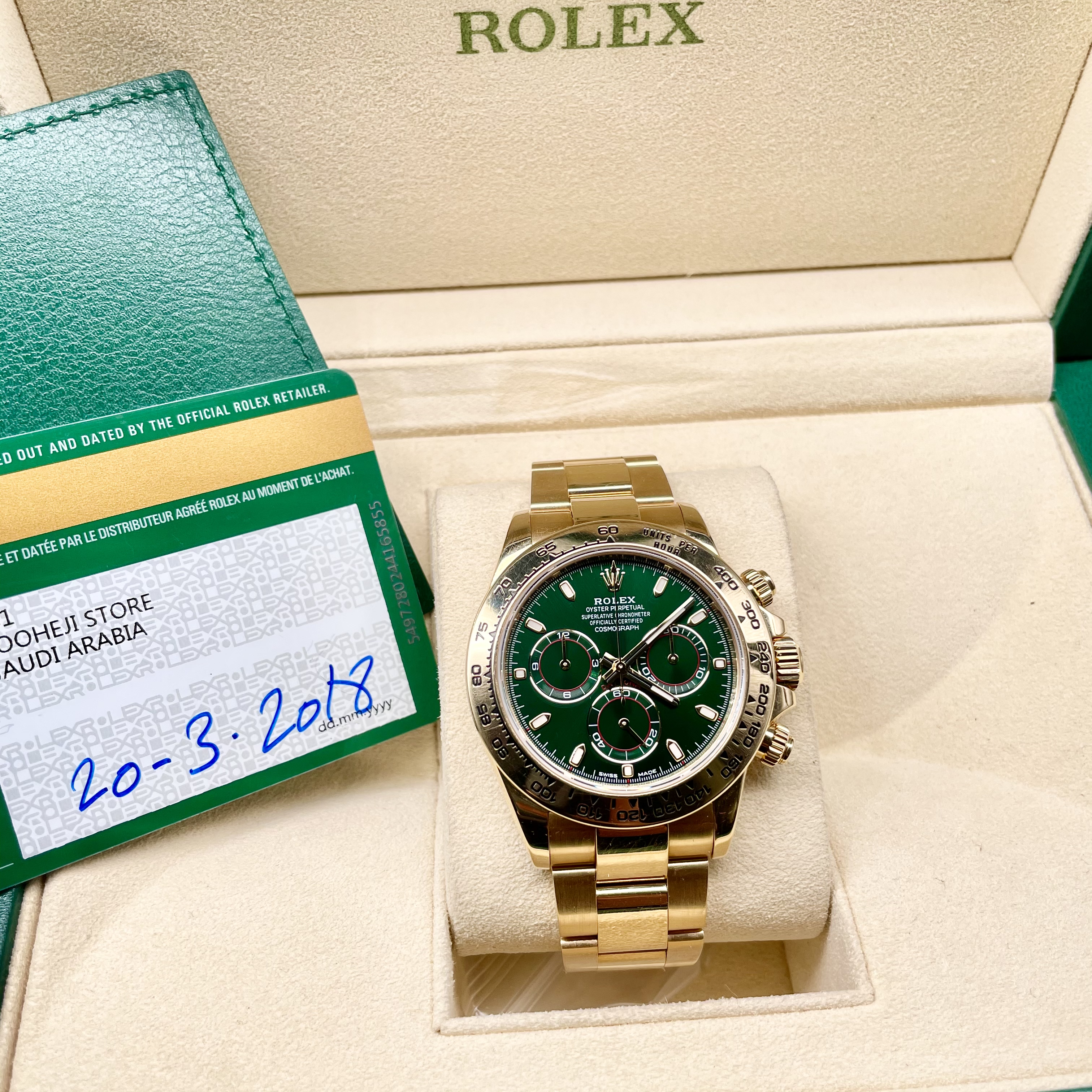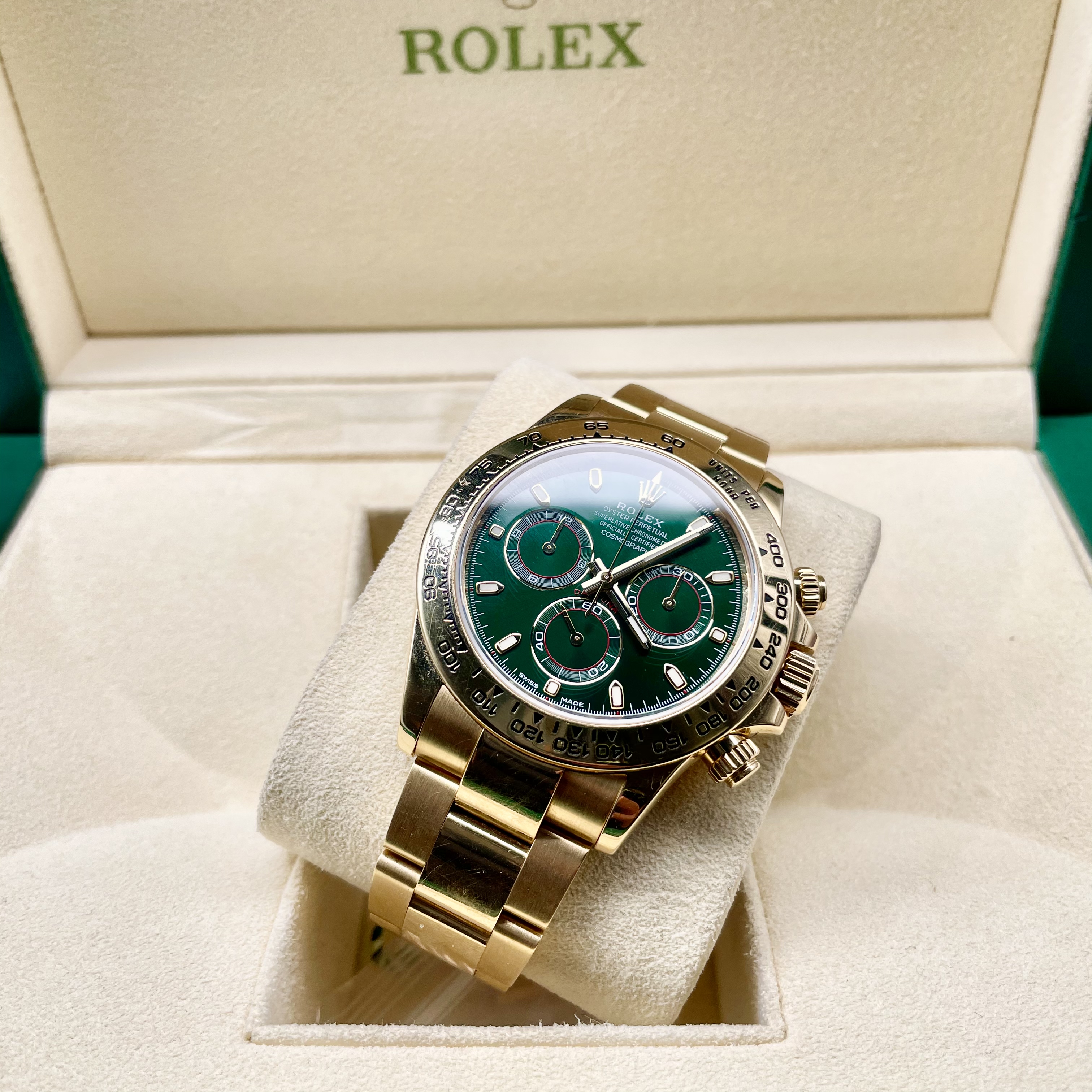 劳力士绿金迪,系列:迪通拿系列 型号:116508 热门款理财产品。一天一个价。材质:18k黄金 镜面:蓝宝石玻璃 表盖:密底 表扣:折叠扣 表径:40mm 机芯类型:自动机械机芯 附件:18年盒证 公价: 286000 保修:一年 回收:一年内不低于9折回收