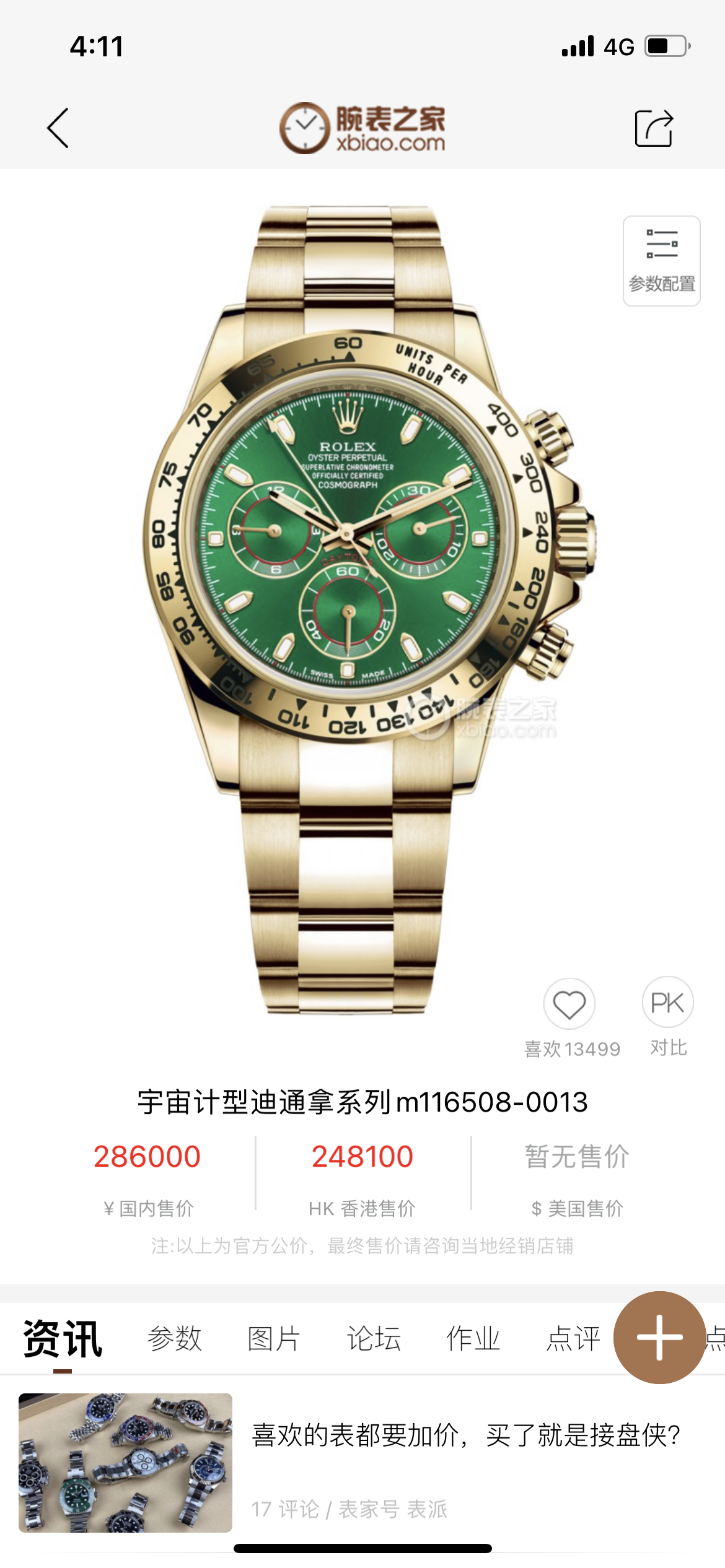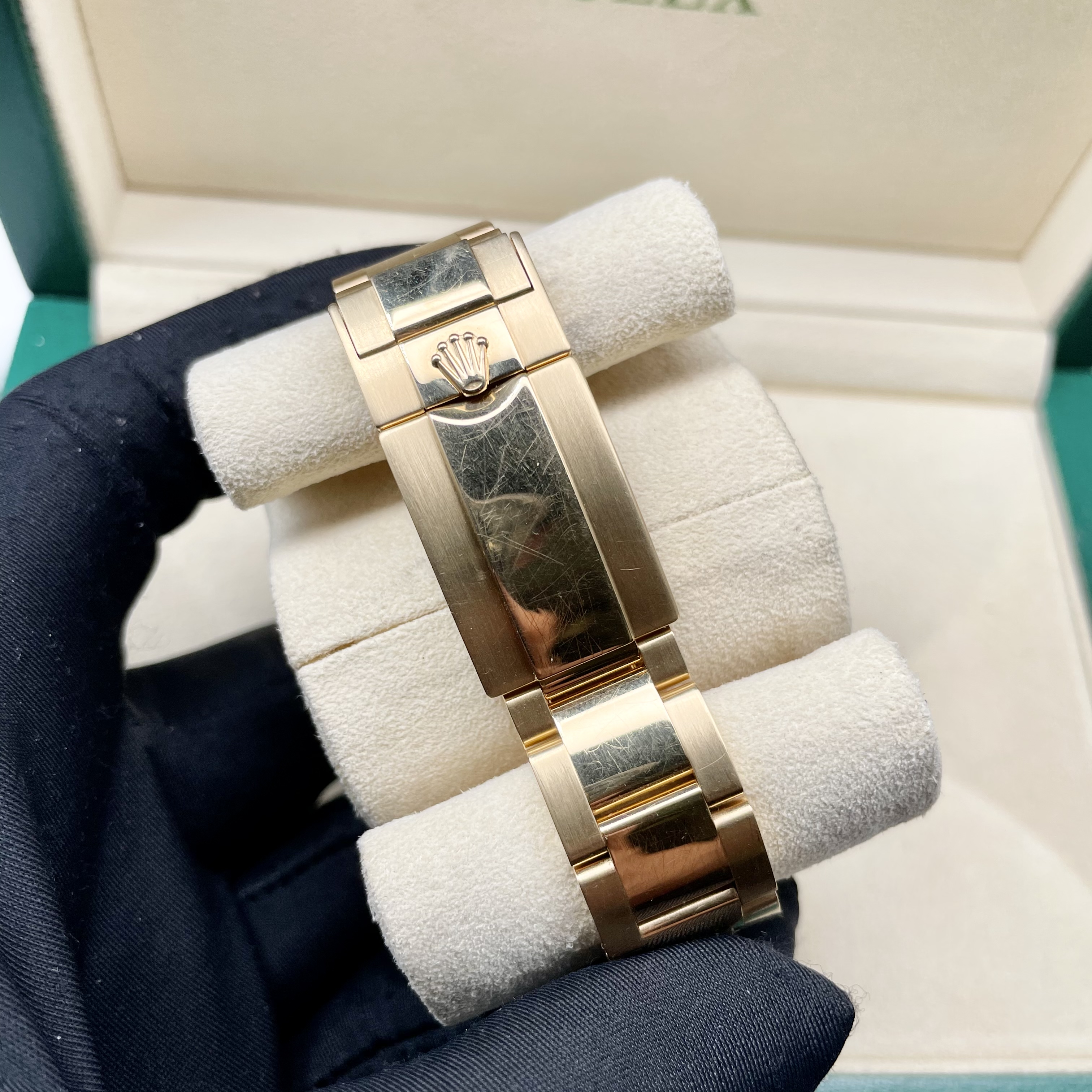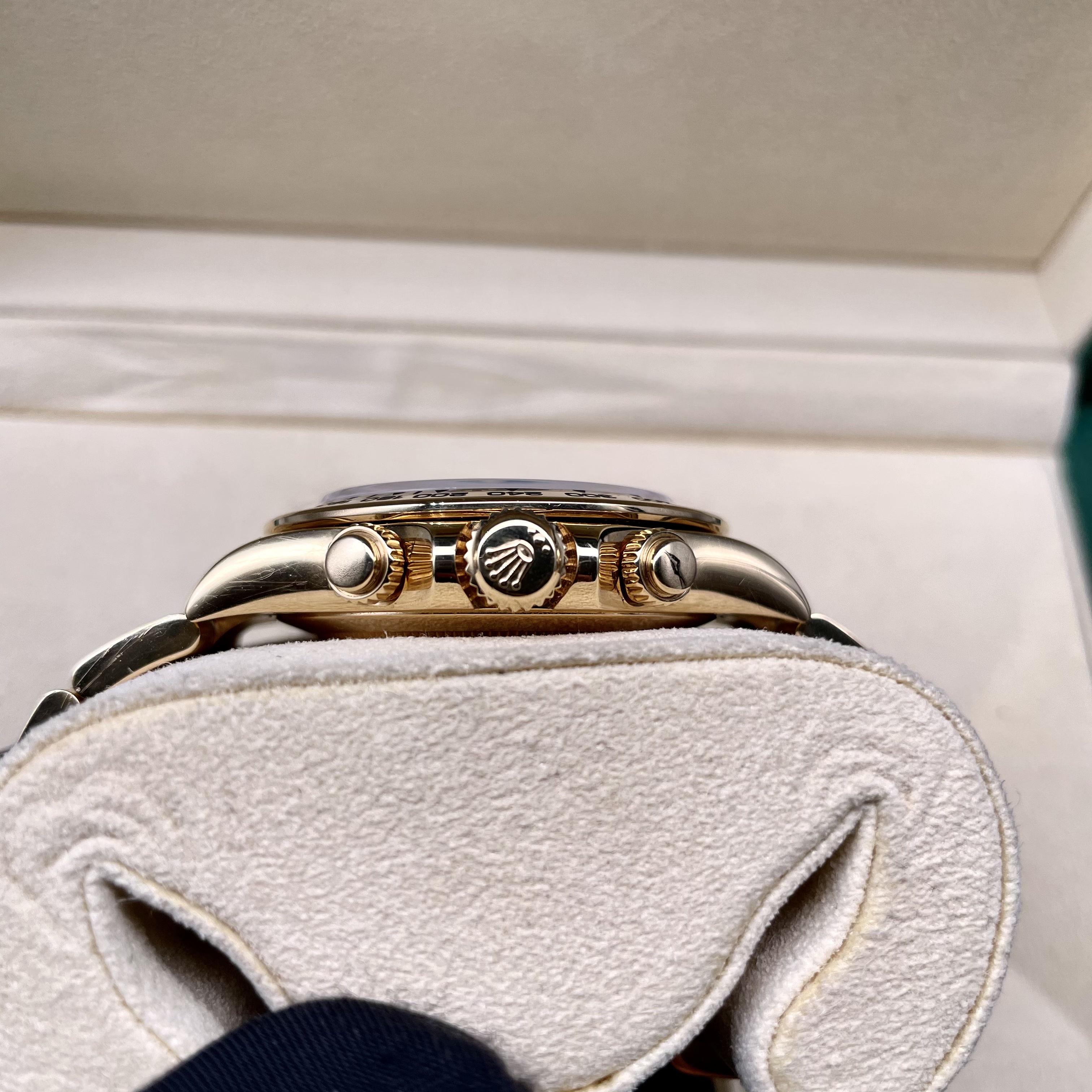 劳力士绿金迪,系列:迪通拿系列 型号:116508 热门款理财产品。一天一个价。材质:18k黄金 镜面:蓝宝石玻璃 表盖:密底 表扣:折叠扣 表径:40mm 机芯类型:自动机械机芯 附件:18年盒证 公价: 286000 保修:一年 回收:一年内不低于9折回收