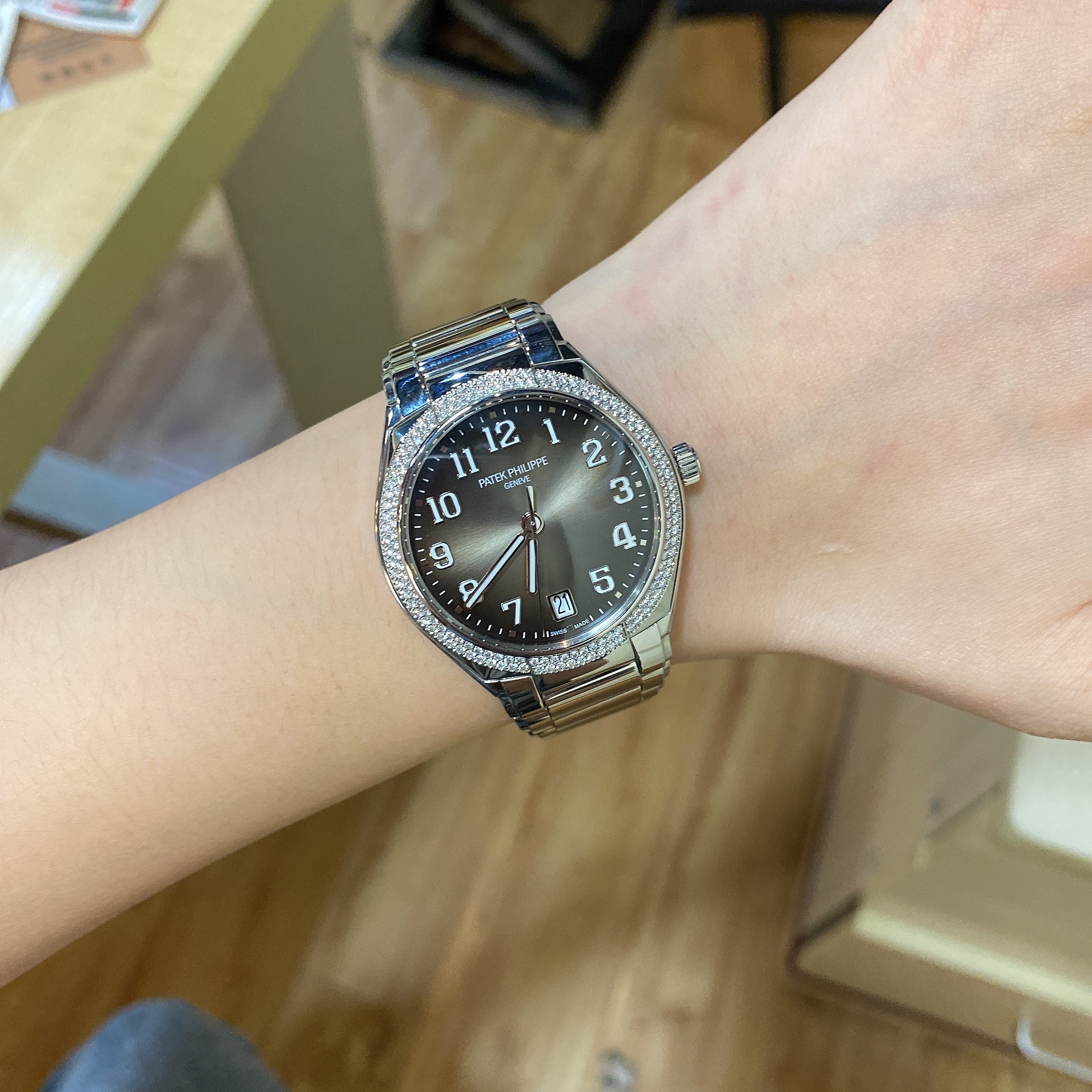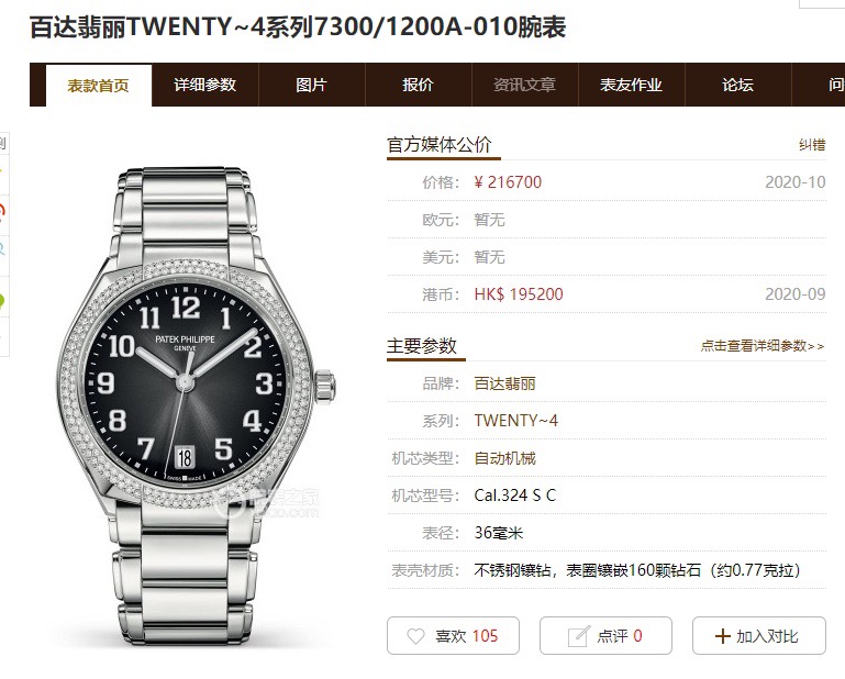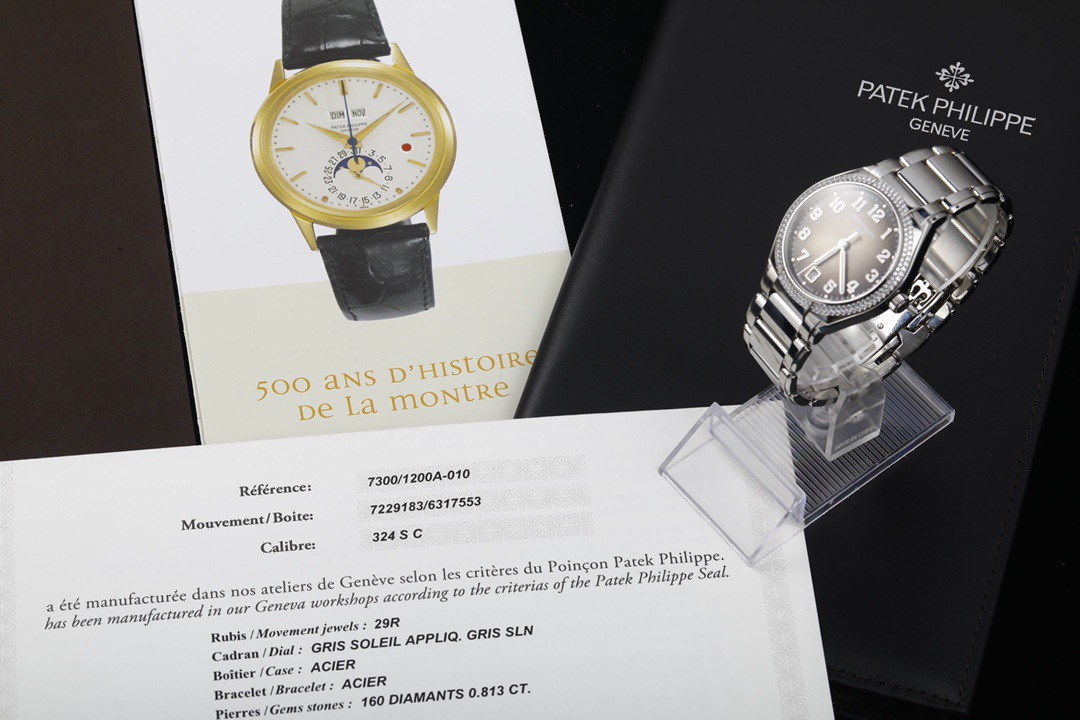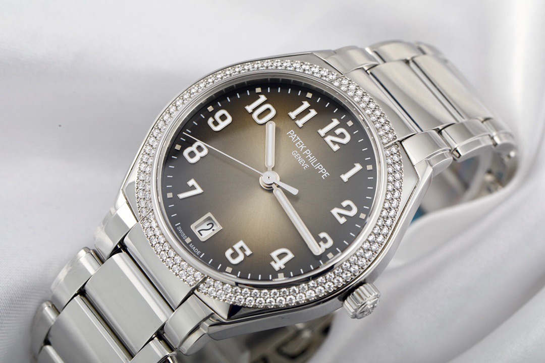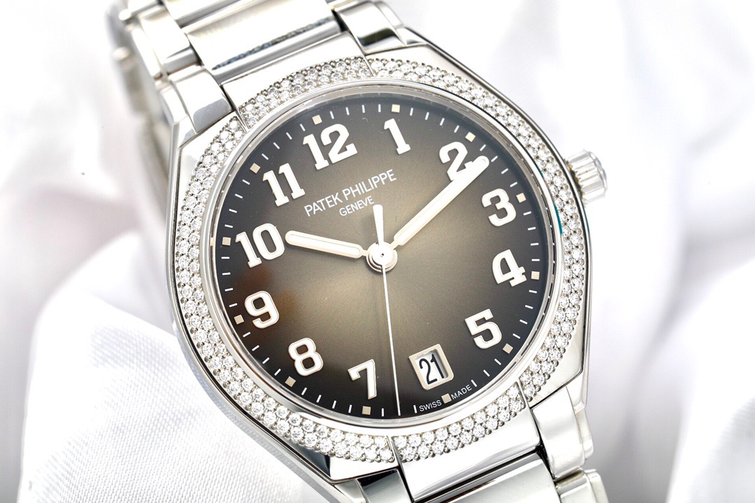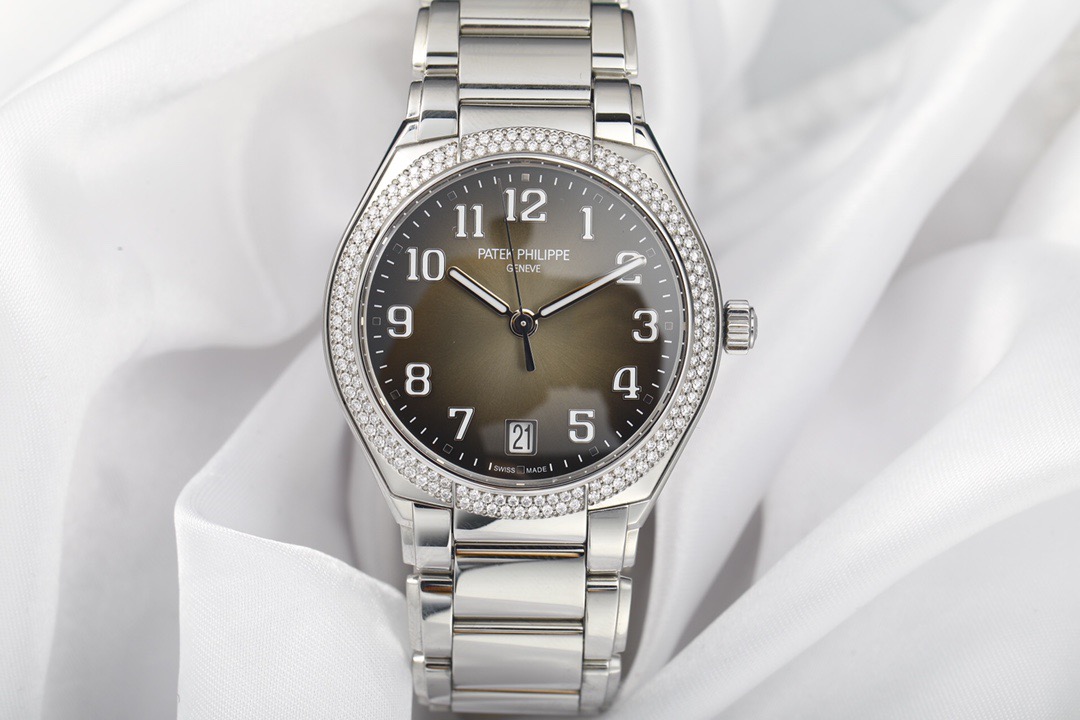 百达翡丽TWENTY~4系列7300/1200A-001 自动机械 36mm精钢材质 原镶钻外圈 渐变咖啡面 透底 经典大三针设计 阿拉伯数字时标19年保单 极品成色 性价比高