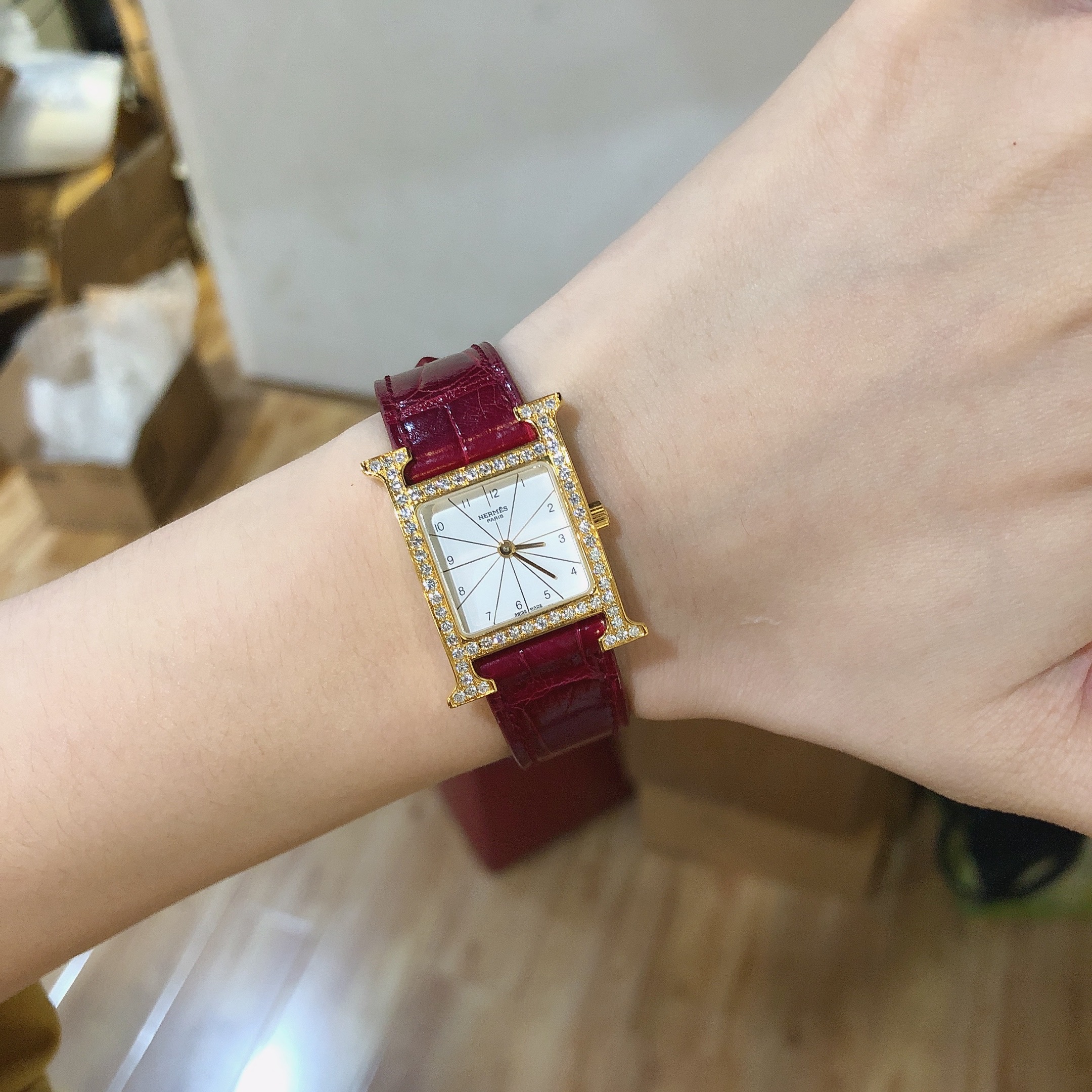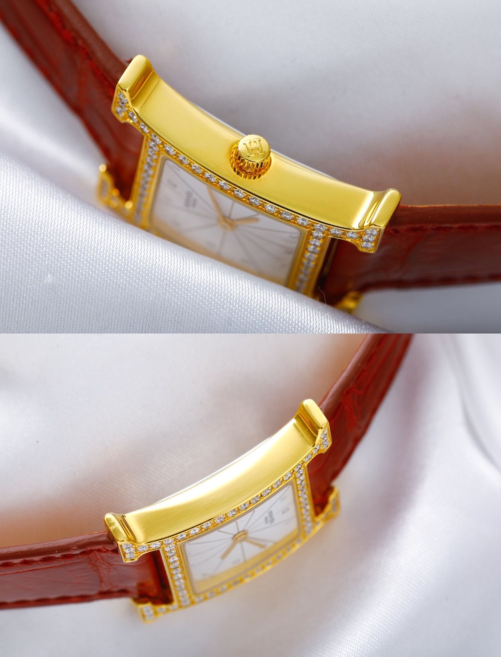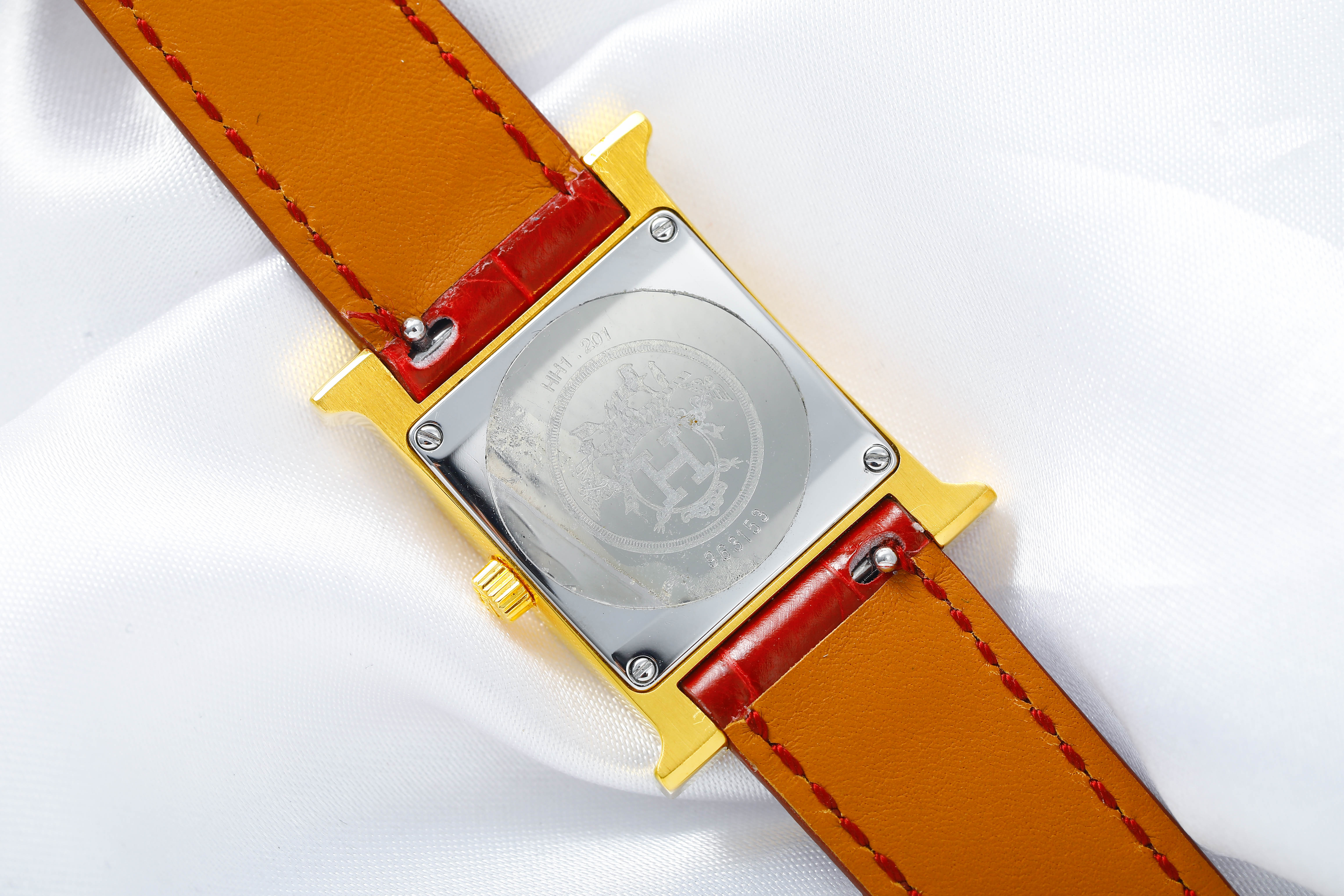 女表推荐爱马仕Hour系列H型腕表石英机芯 精钢包金 表径30×21mm白盘配黄金表壳 最高级的搭配 辨识度高 阿拉伯数字时标 读时清晰 高贵华丽 气质女表 大钻镶嵌极品成色 搭配全新正红色鳄鱼皮表带 送人佳品 一万冒泡