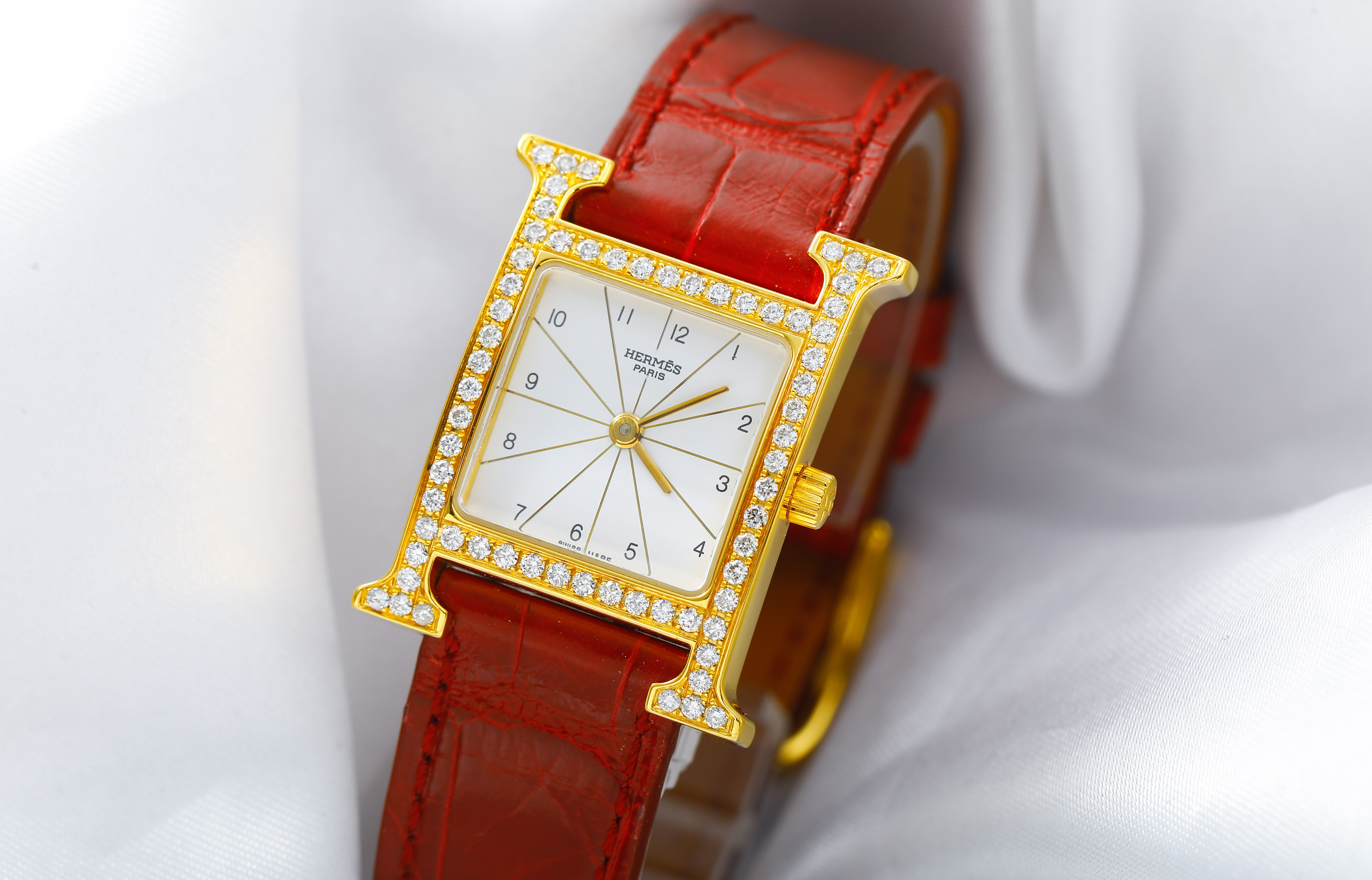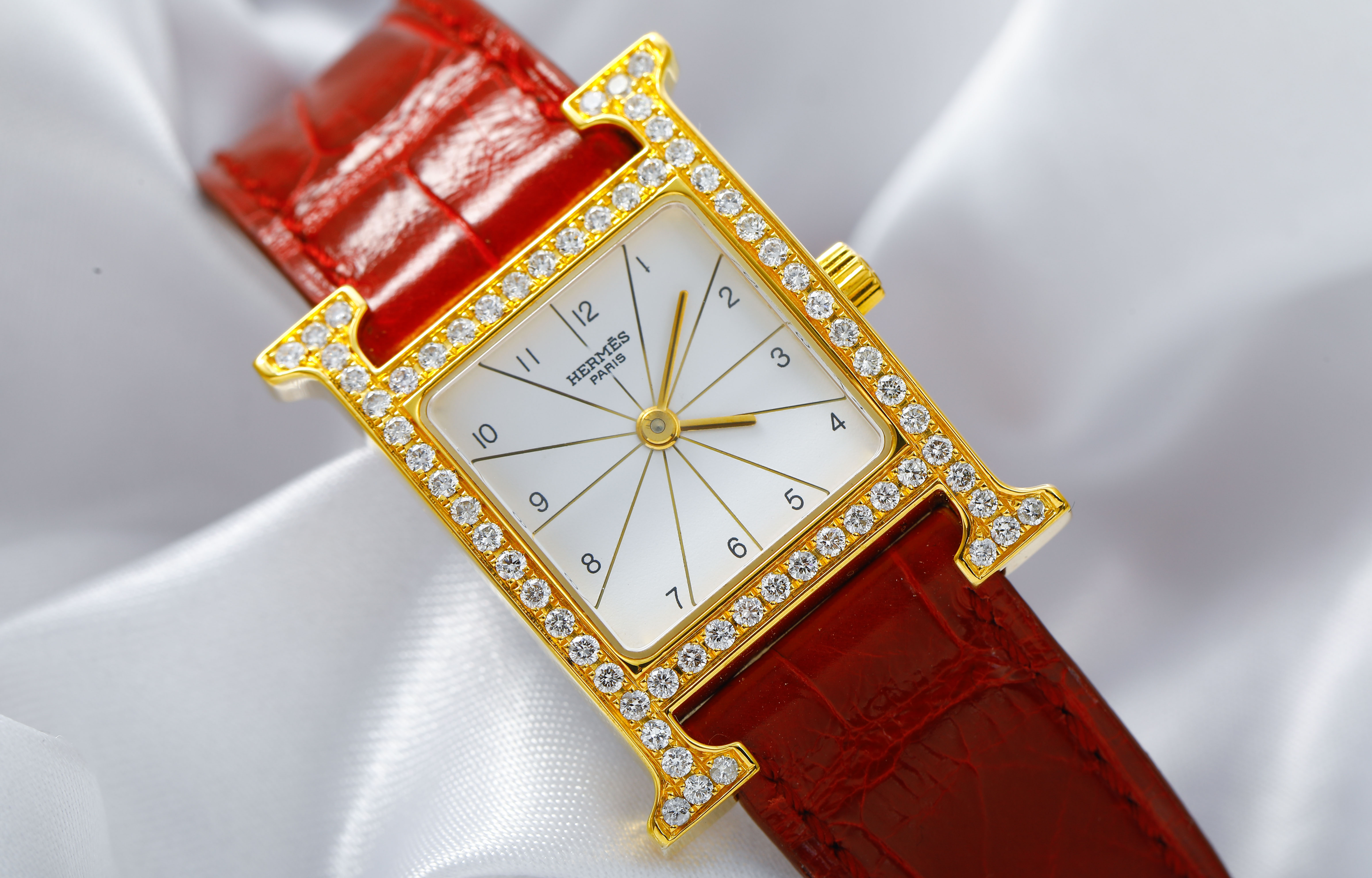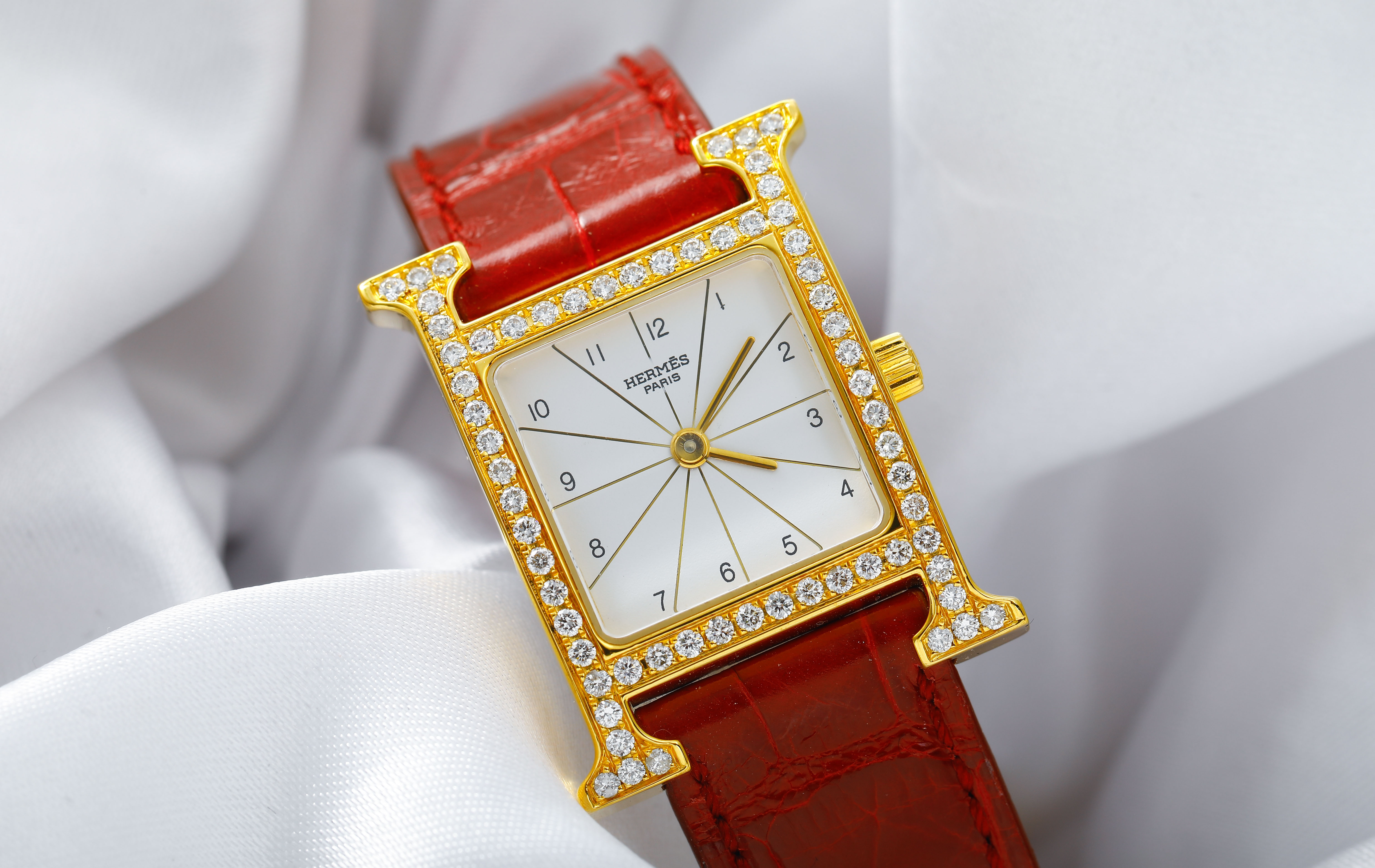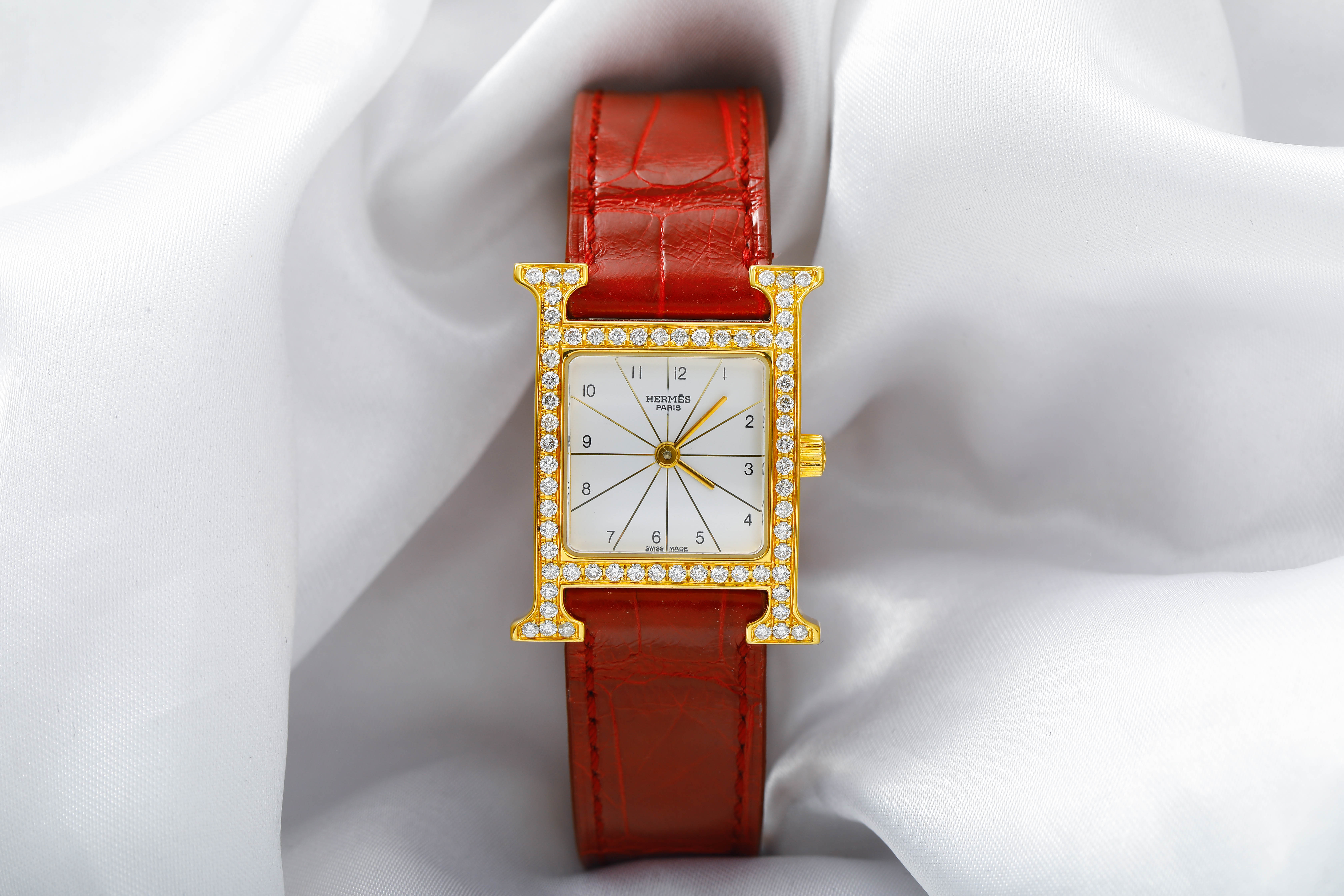 女表推荐爱马仕Hour系列H型腕表石英机芯 精钢包金 表径30×21mm白盘配黄金表壳 最高级的搭配 辨识度高 阿拉伯数字时标 读时清晰 高贵华丽 气质女表 大钻镶嵌极品成色 搭配全新正红色鳄鱼皮表带 送人佳品 一万冒泡