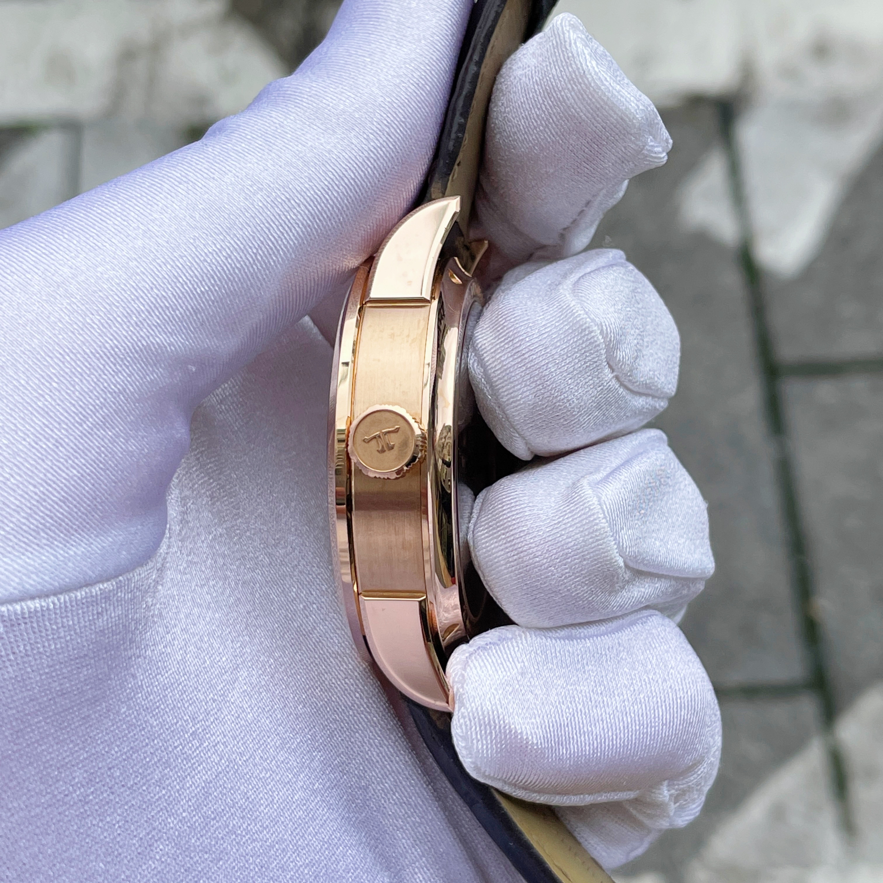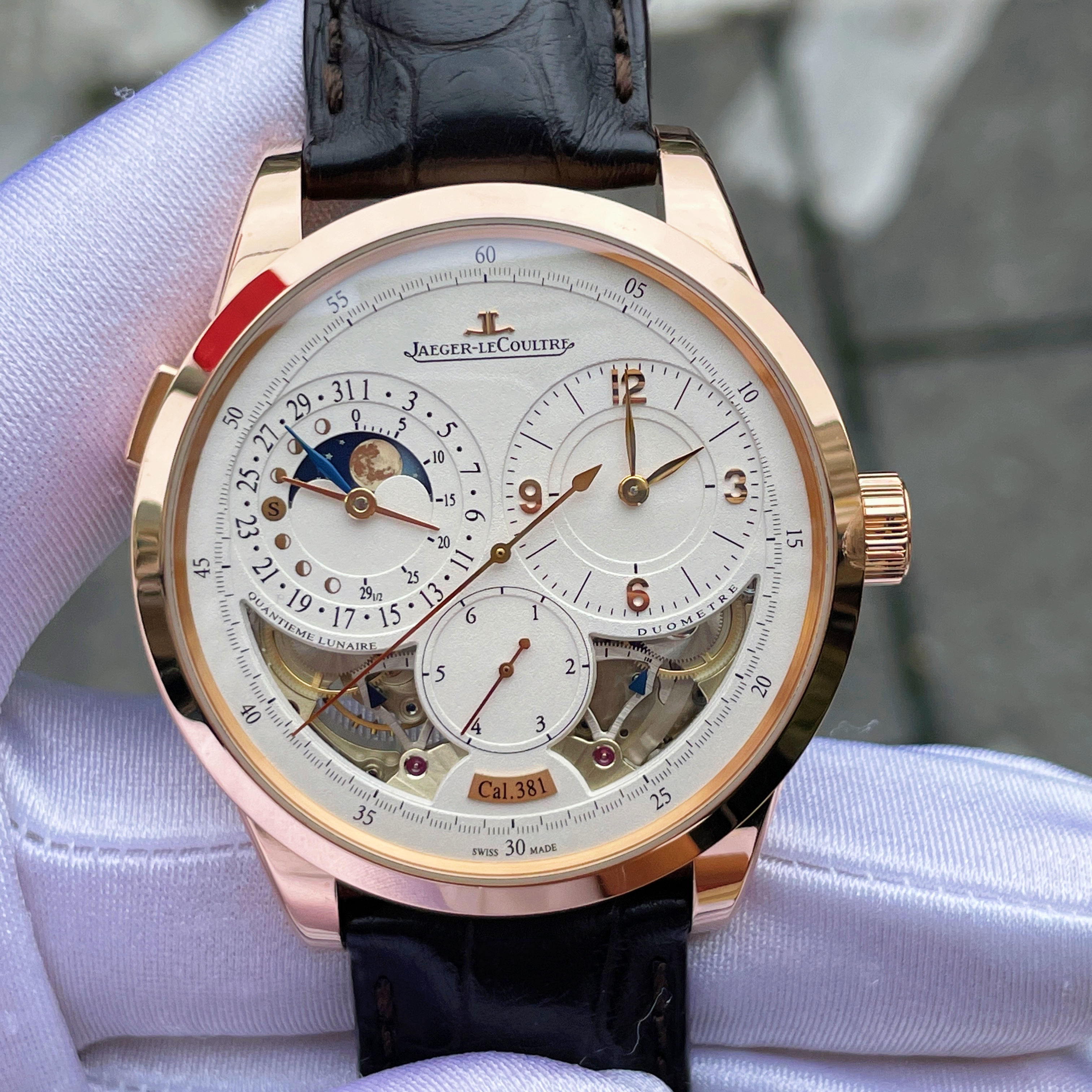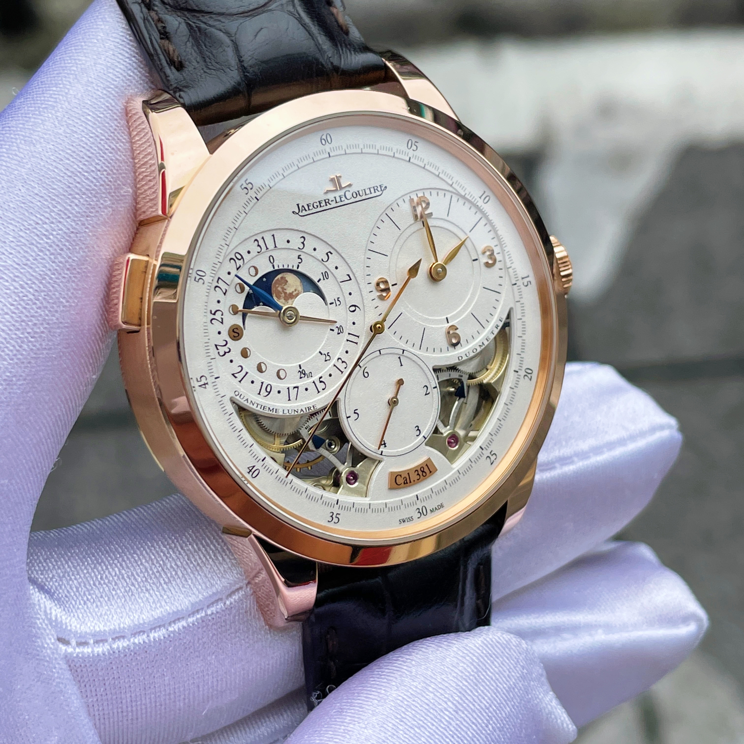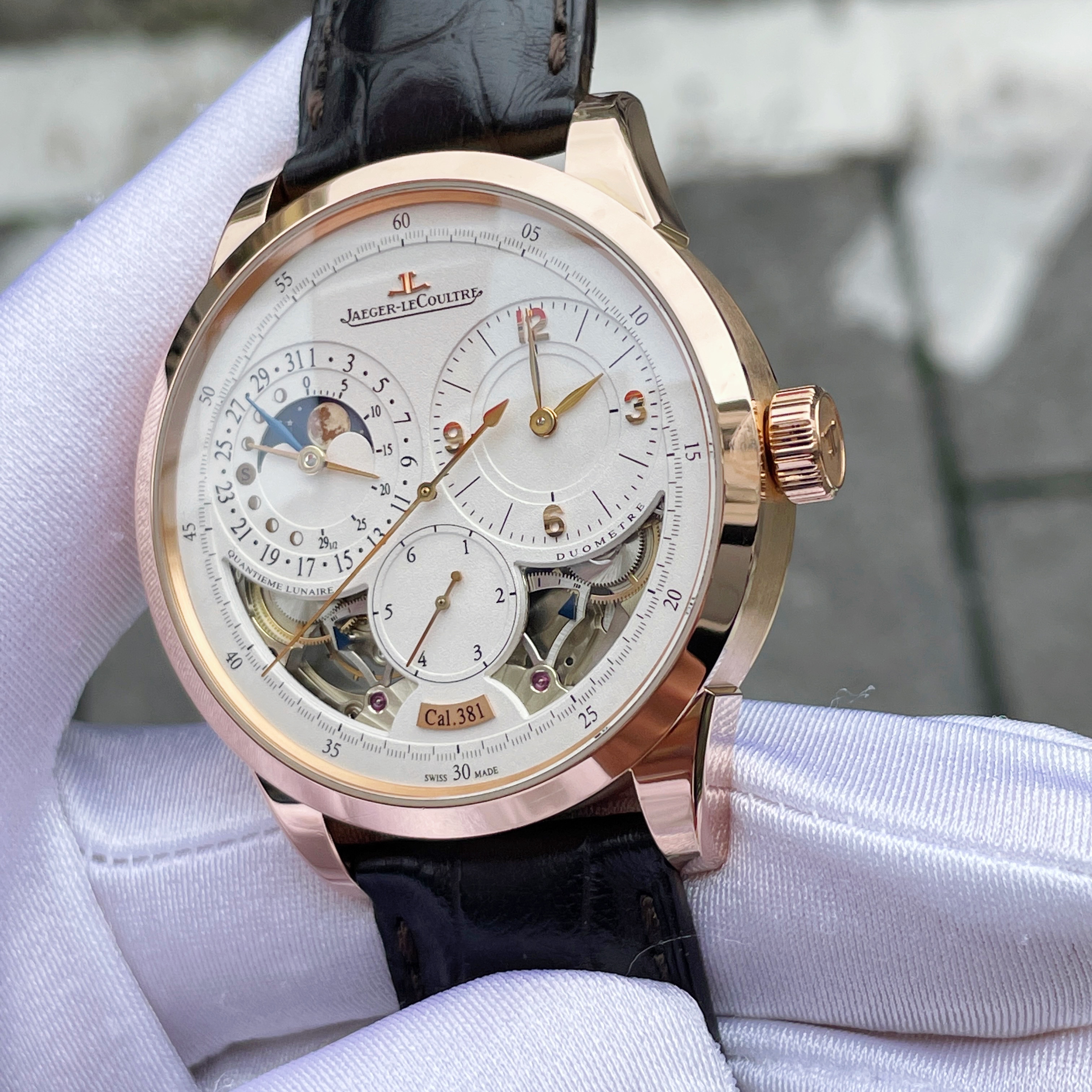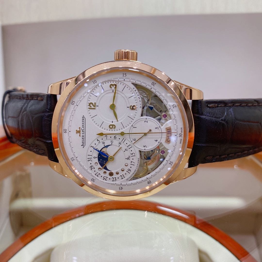 积家双翼系列Q6042520,18K玫瑰金材质,42mm表径,双发条动力储存上链,搭载积家Cal381手动机芯,月相,日期,动力储备显示,飞返逆跳,专柜参考售价321000,二手单表现货好价分享