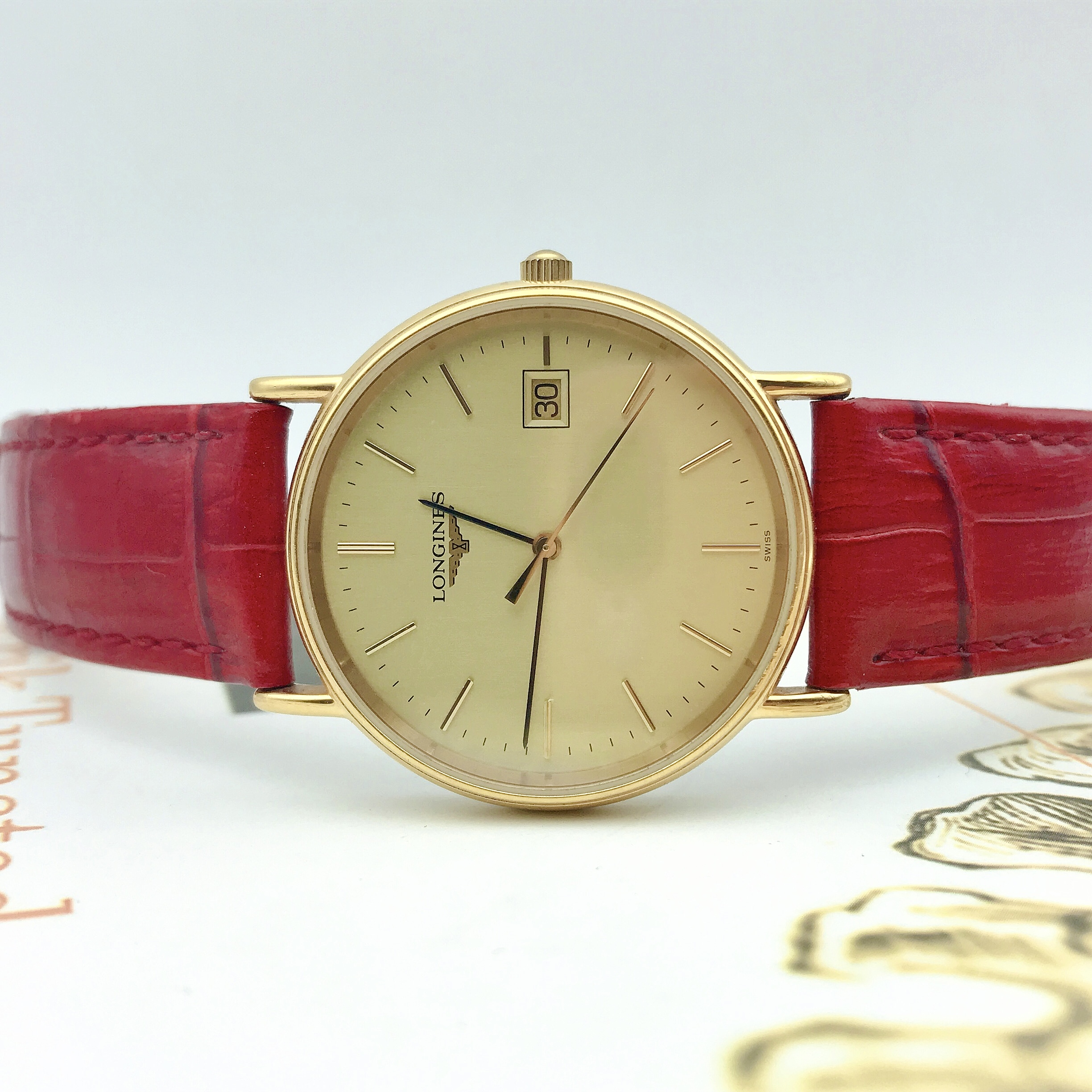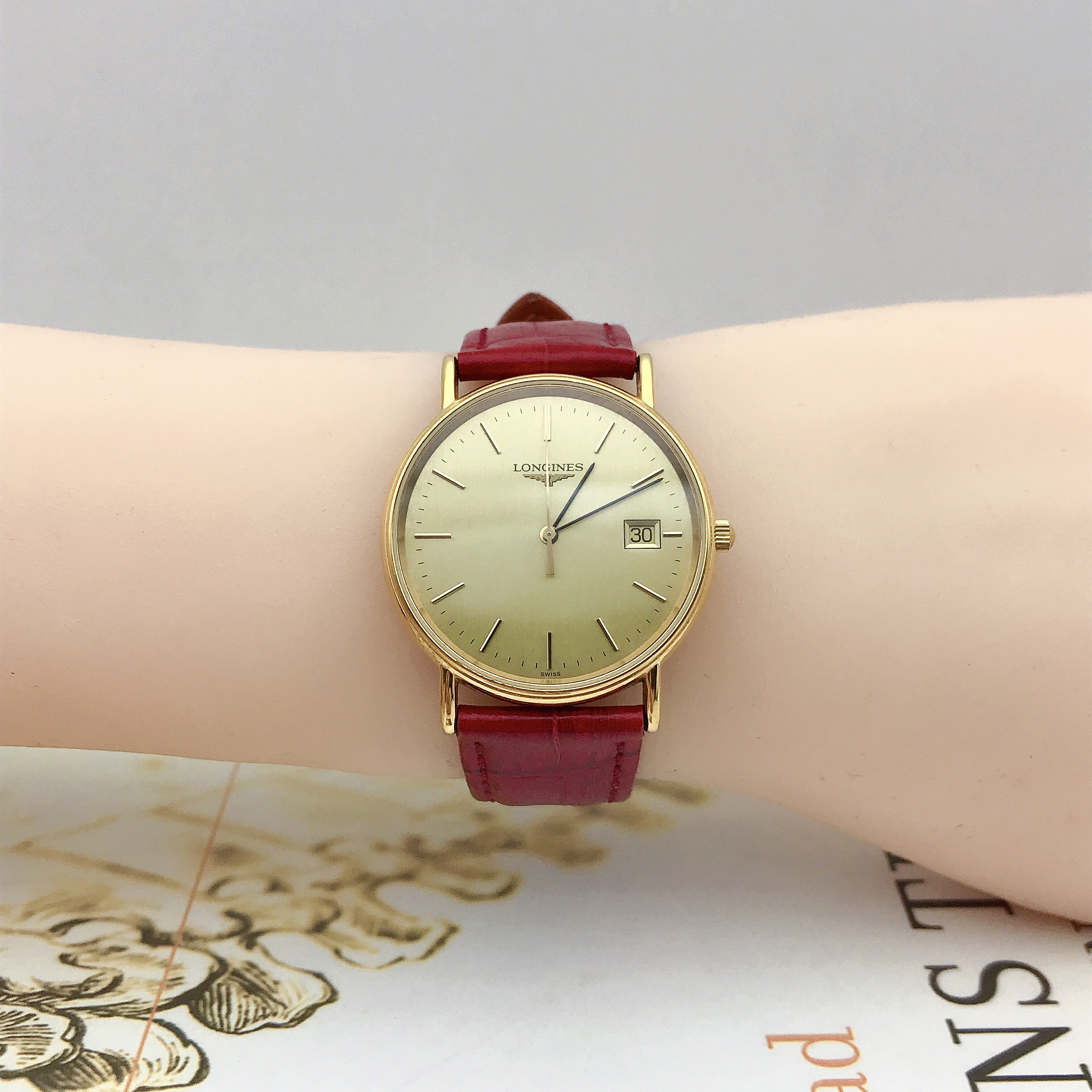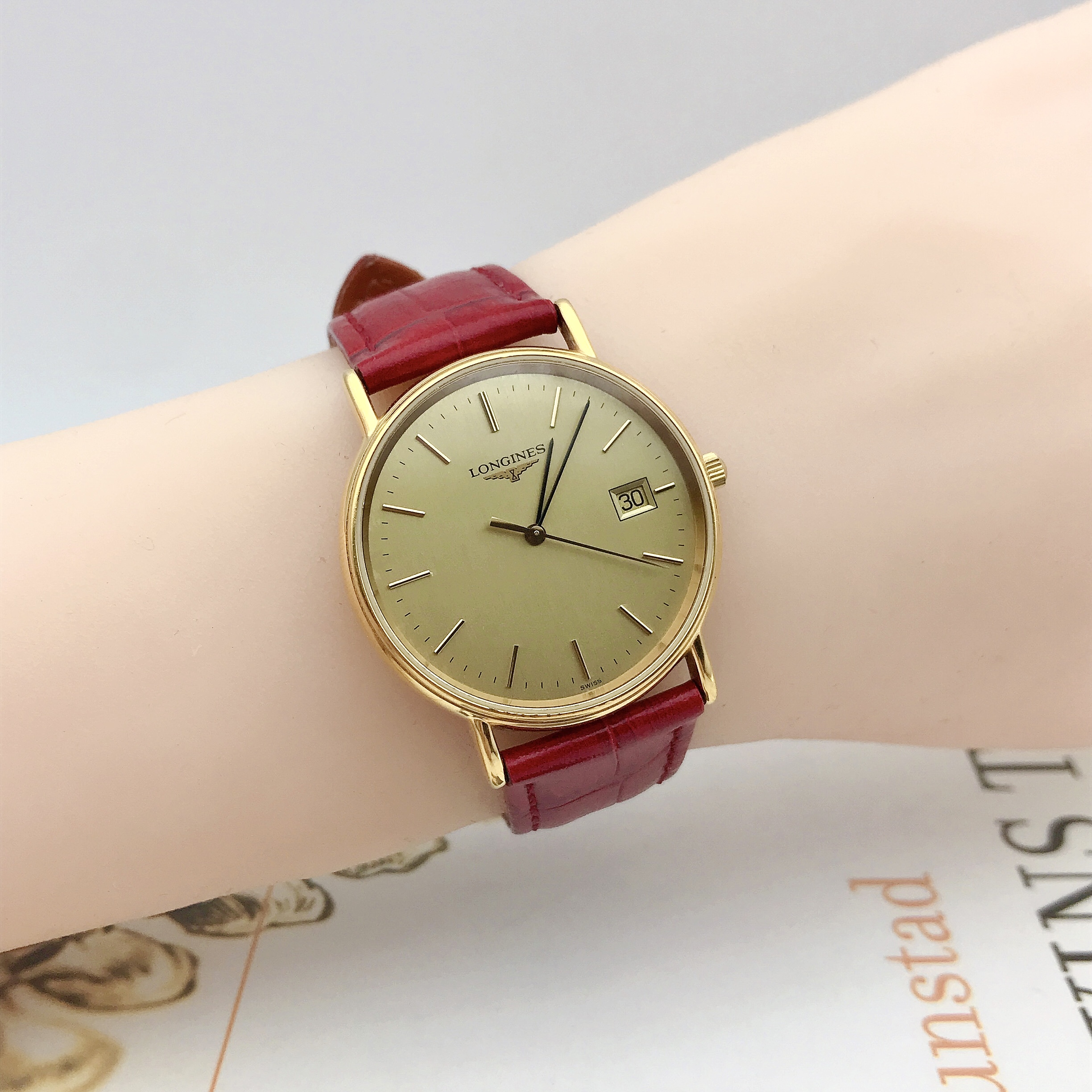 浪琴瑰丽系列L4.636.2女士腕表,表径33mm,腕周170mm左右,金色表盘设计简约,3点位日历显示,指针、刻度与金色表盘颜色和谐统一,瞬间提升整表质感,流露出低调奢华的气质,精准石英动力,靓丽红色表带,一种由内散发的气质,优雅大方。参考类似款公价7500!