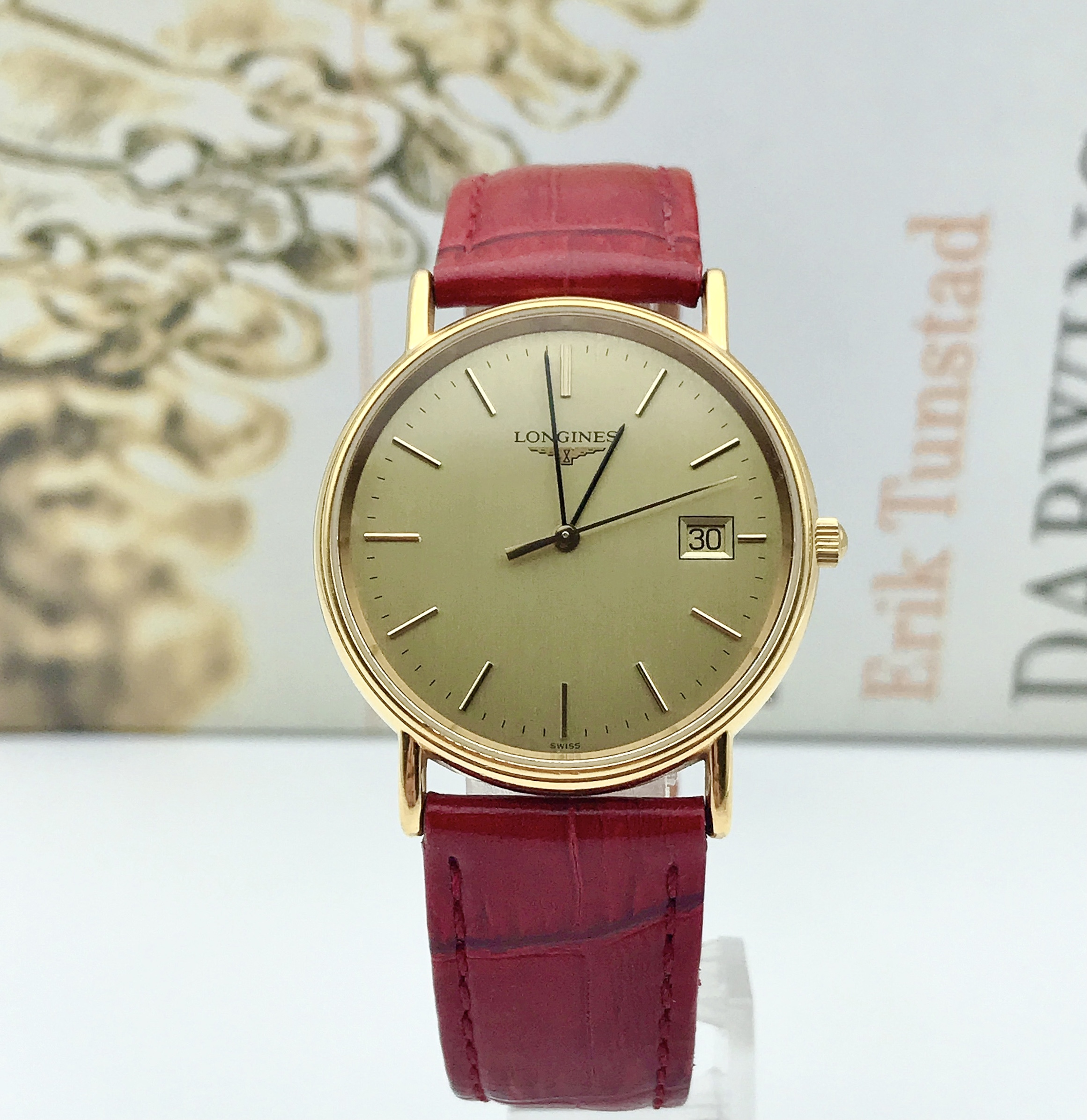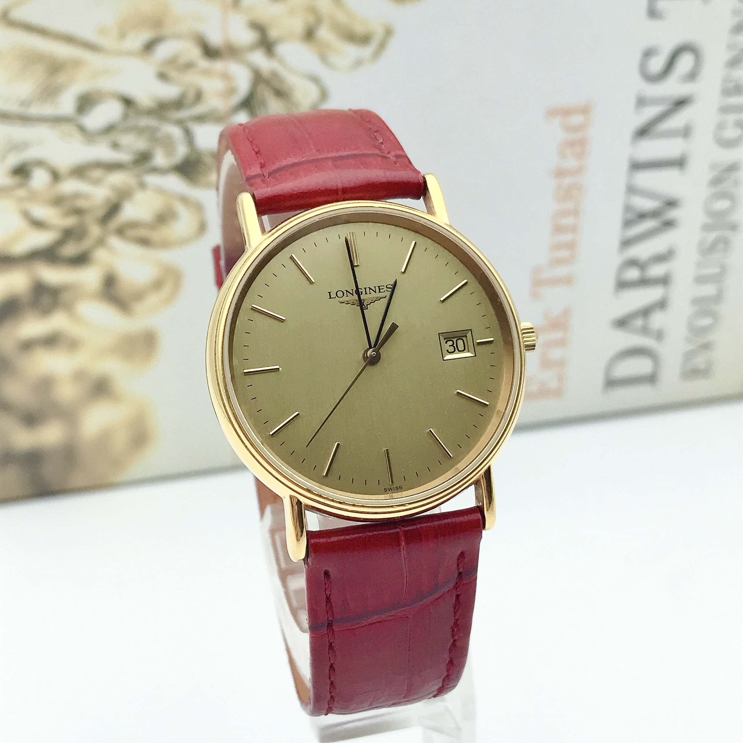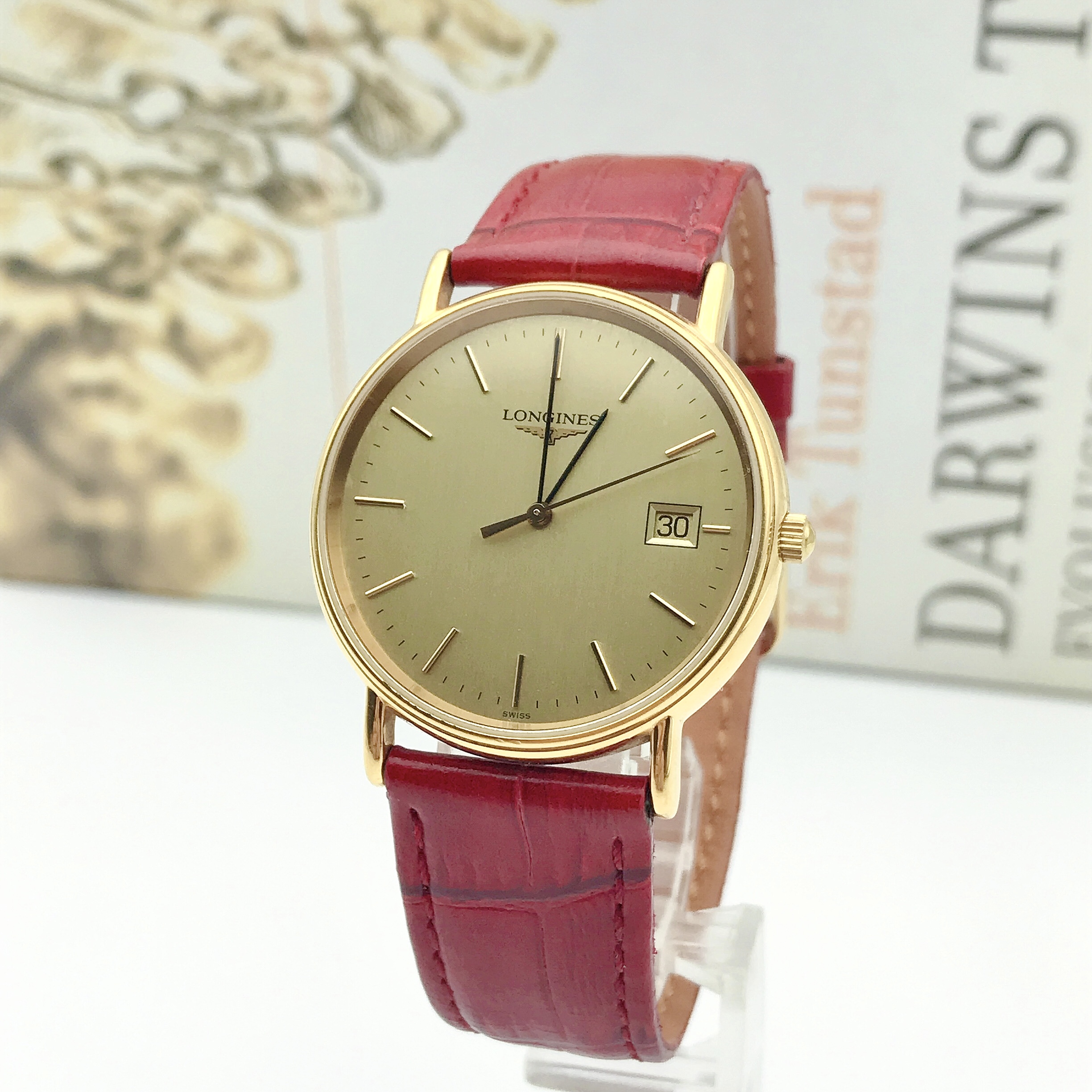浪琴瑰丽系列L4.636.2女士腕表,表径33mm,腕周170mm左右,金色表盘设计简约,3点位日历显示,指针、刻度与金色表盘颜色和谐统一,瞬间提升整表质感,流露出低调奢华的气质,精准石英动力,靓丽红色表带,一种由内散发的气质,优雅大方。参考类似款公价7500!