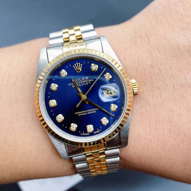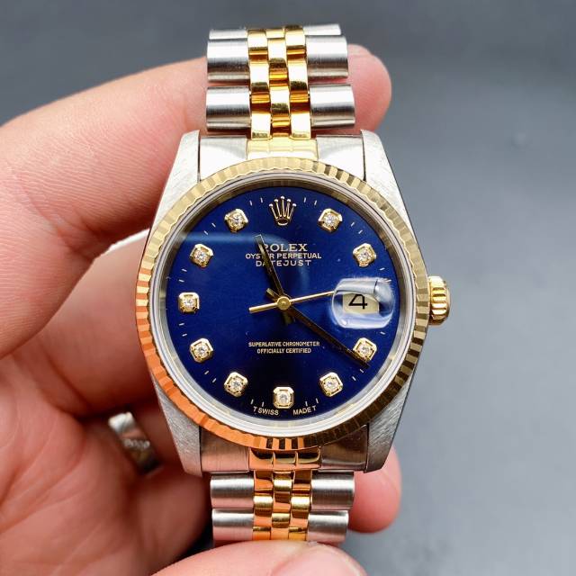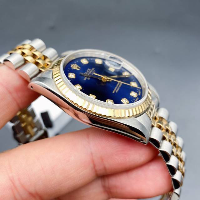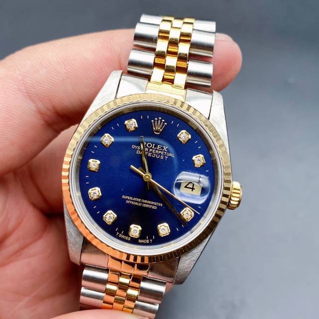 劳力士日志型16233经典男款,蓝色表盘上手大气,自动机械3135机芯,表径36mm,大包钻石刻度日历显示,18k狗牙金圈,折叠扣,表带19节笔直挺,走时准确,工价108000,现二手好价