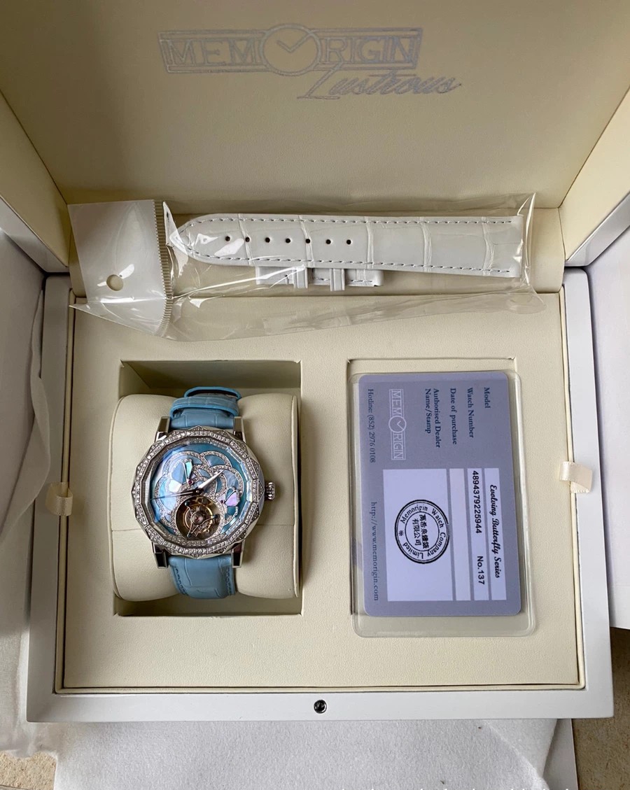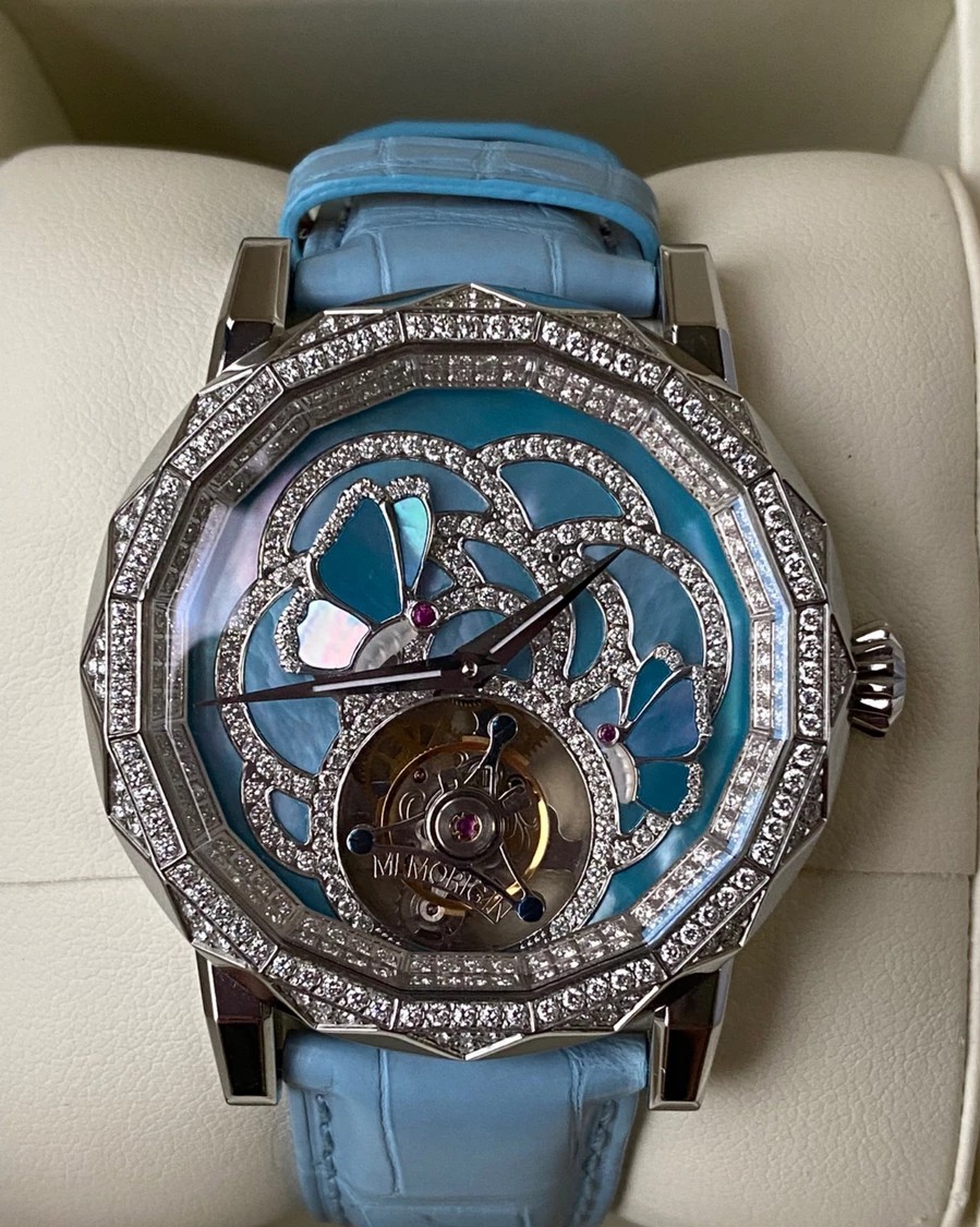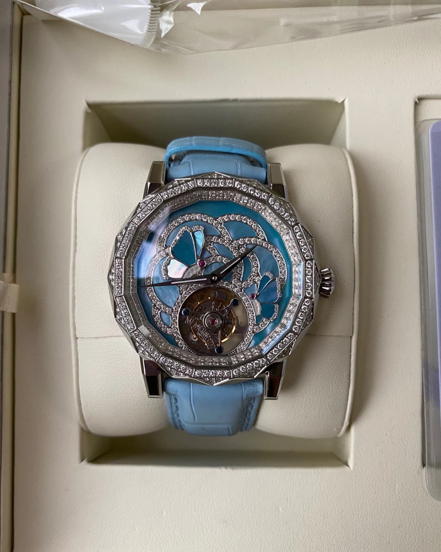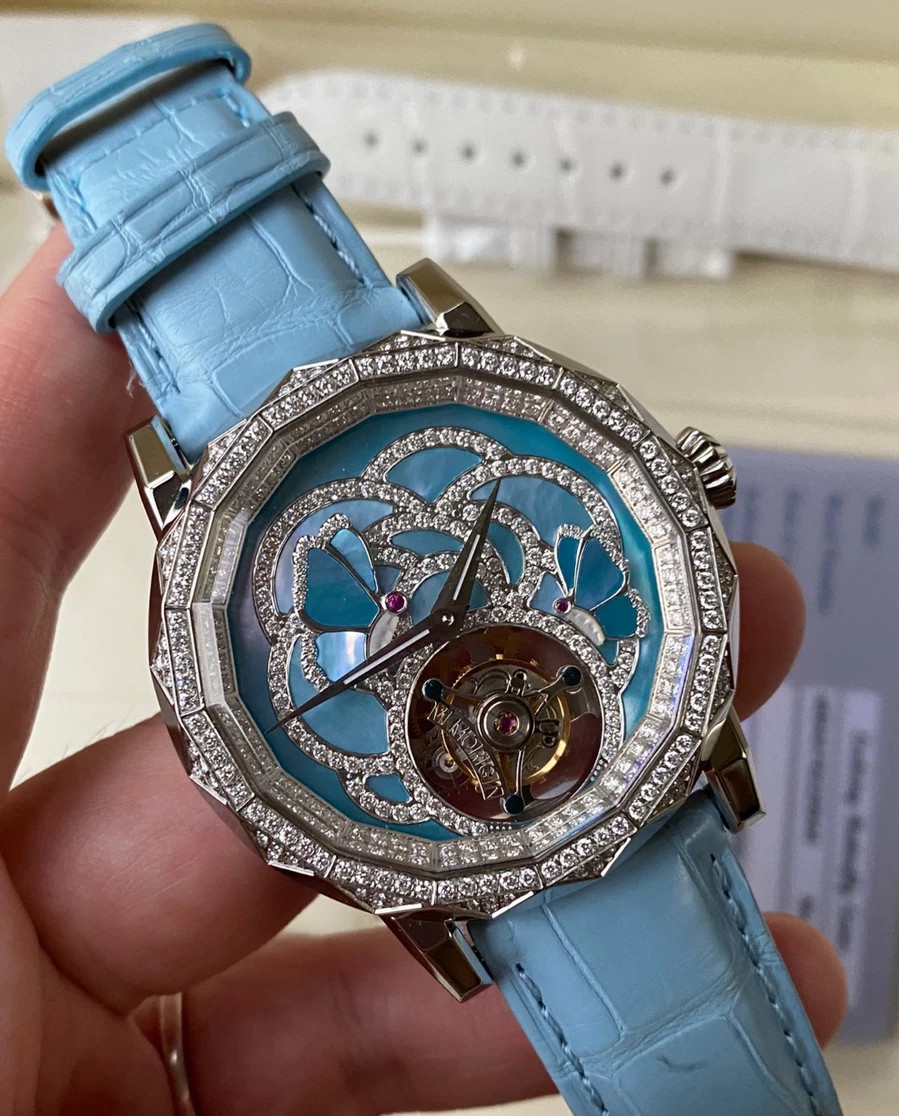 【万希泉最新款羽化成蝶系列粉蓝盘钻石陀飞轮女表】材质:精钢,镶嵌钻石359颗重2.47卡,珍珠贝母表盘。白色鳄鱼皮表带,折叠扣。功能:72小时动力陀飞轮。