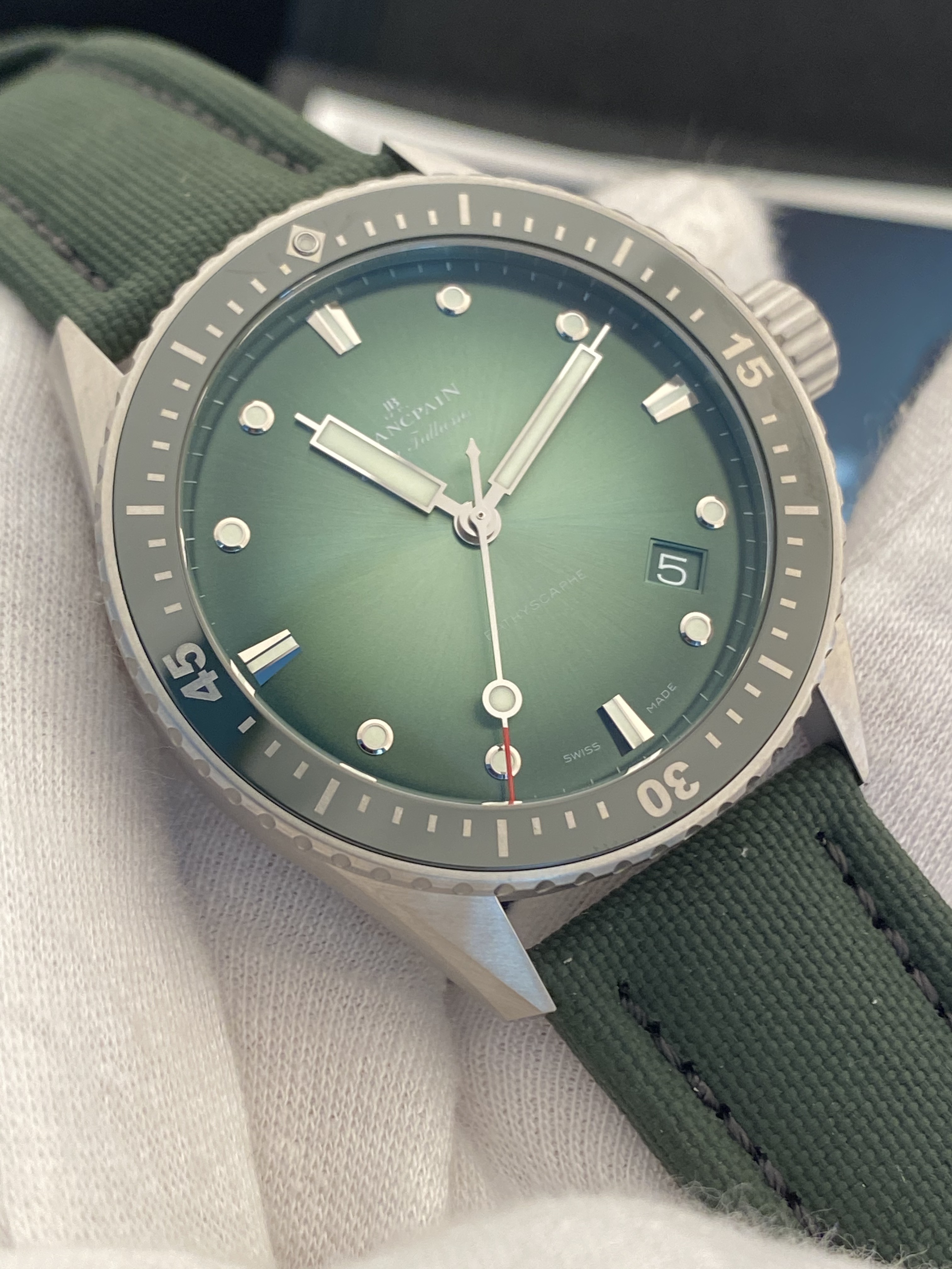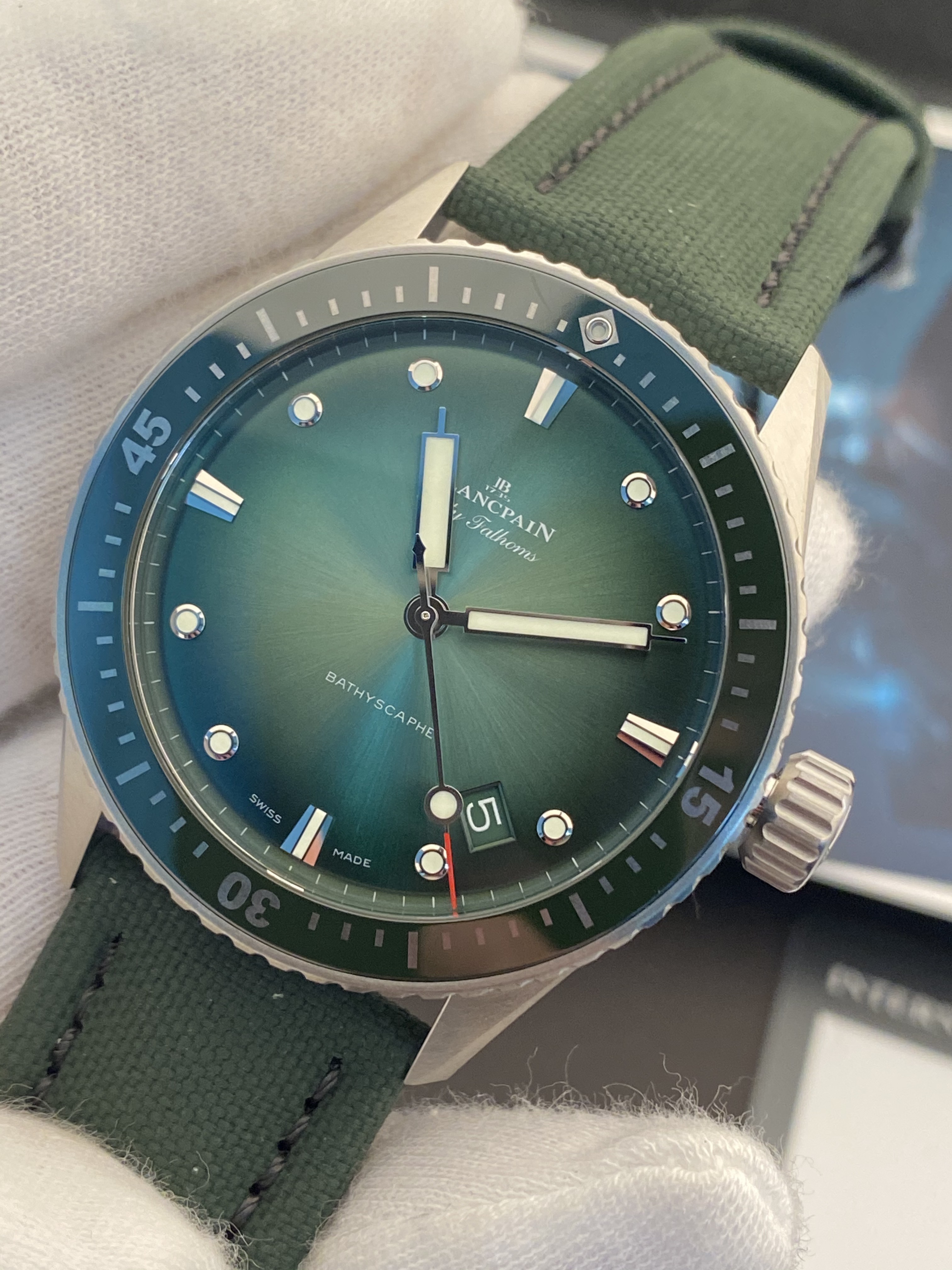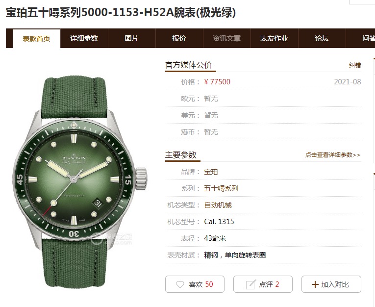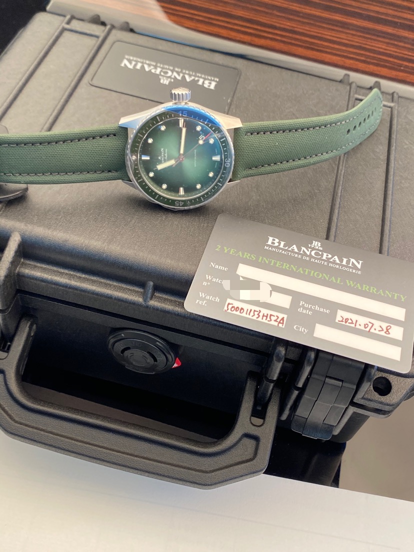宝珀五十寻系列男士腕表 型号:5000-1153-H52A、精钢/材质 自动机芯 43mm表经 功能 : 日期显示、附件:盒子、说明书、2021年7月保卡