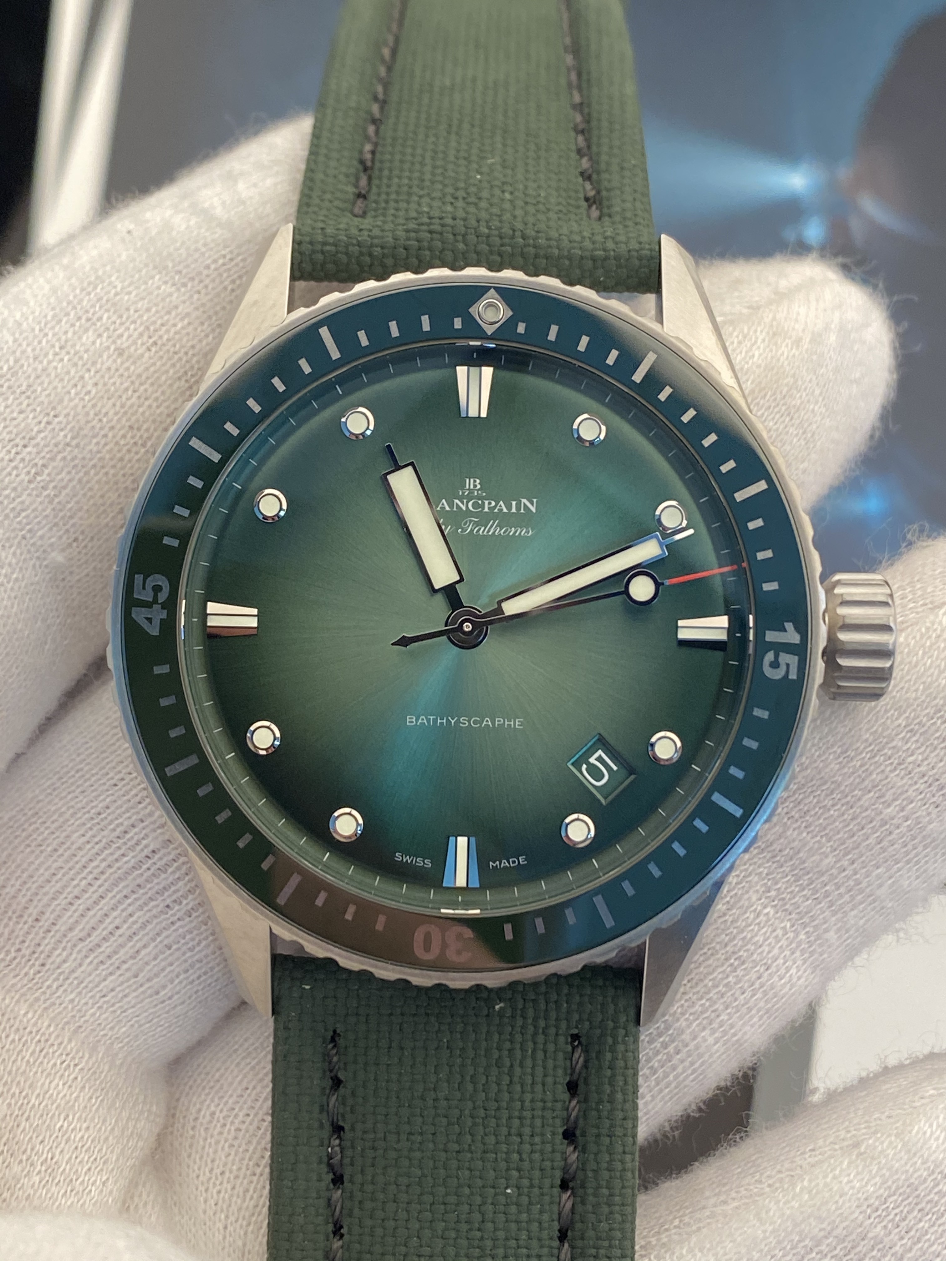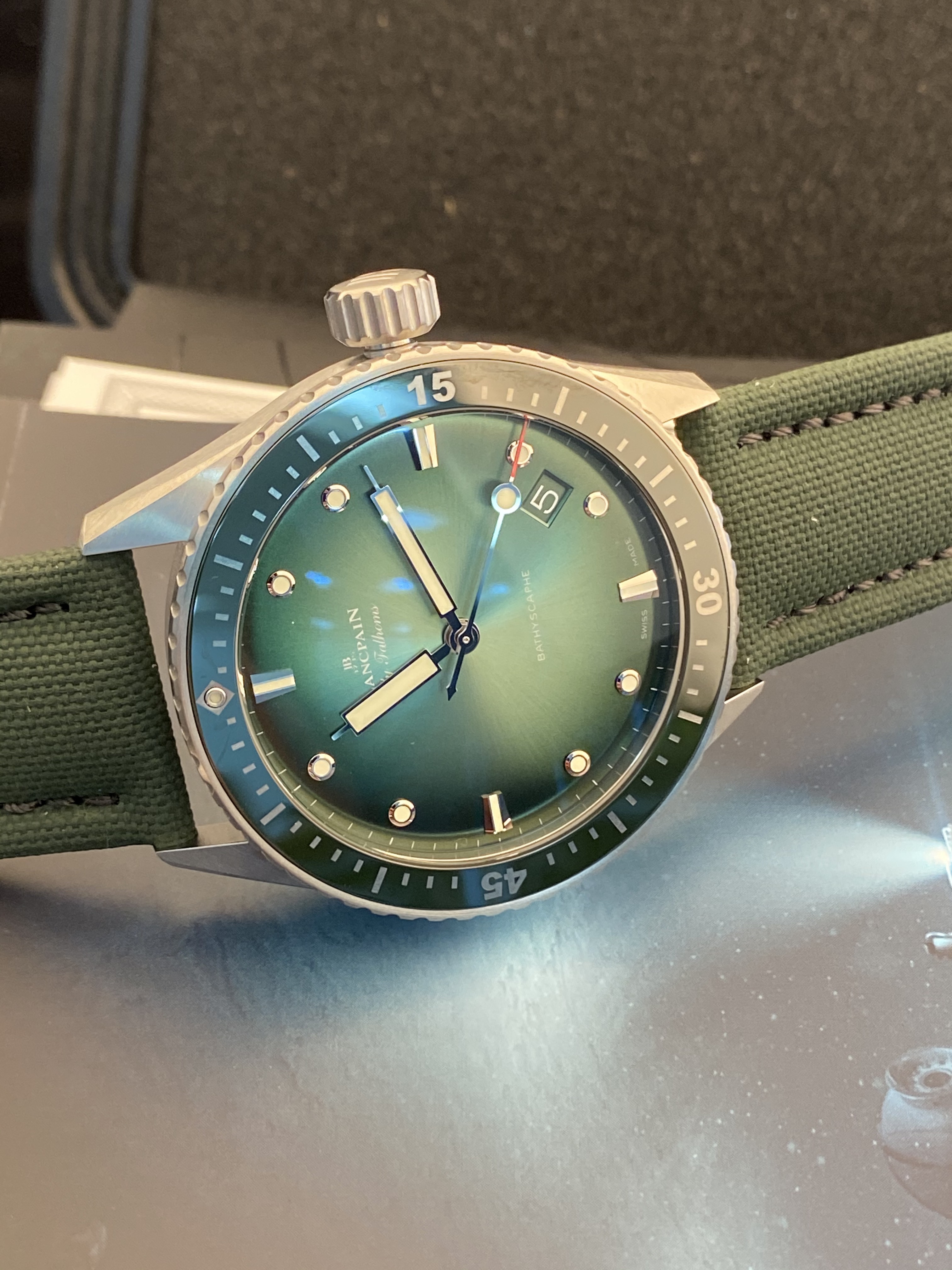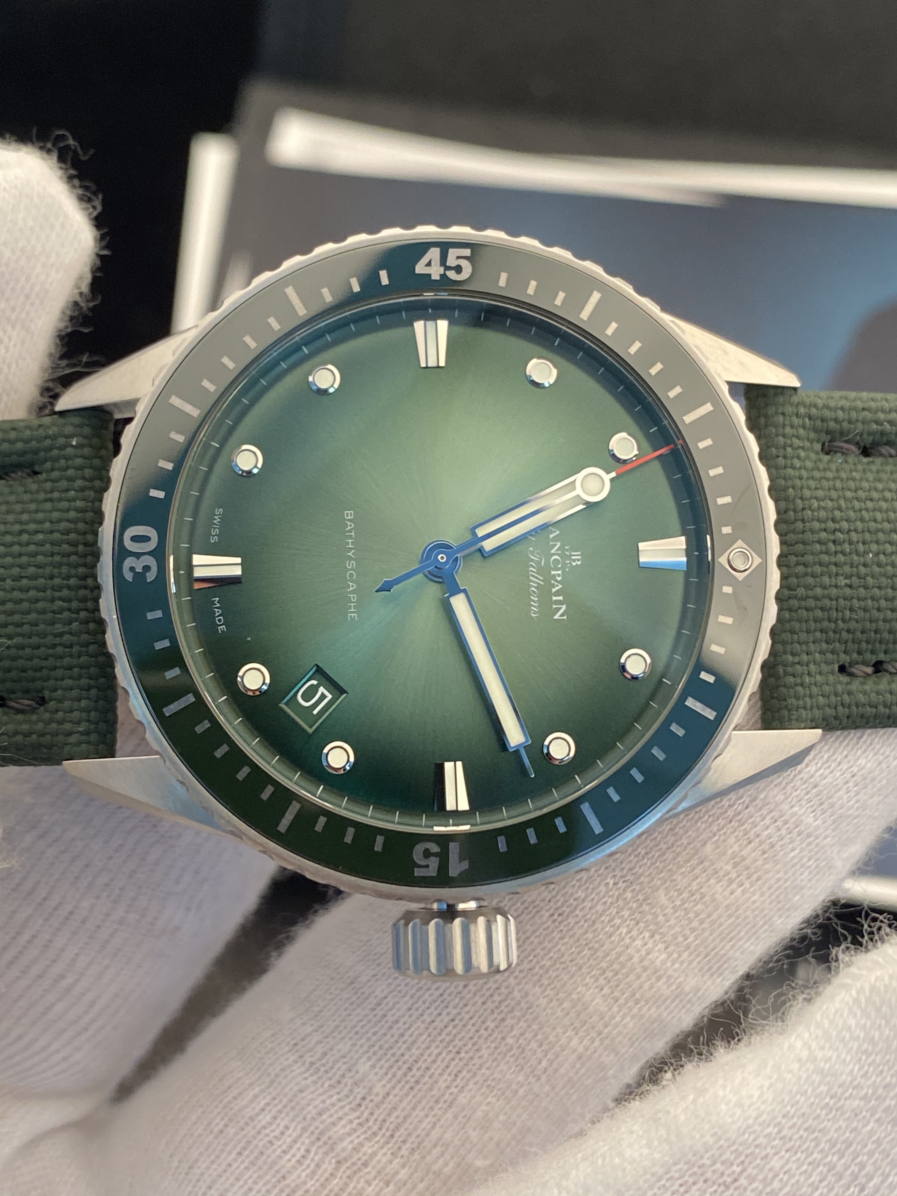 宝珀五十寻系列男士腕表 型号:5000-1153-H52A、精钢/材质 自动机芯 43mm表经 功能 : 日期显示、附件:盒子、说明书、2021年7月保卡