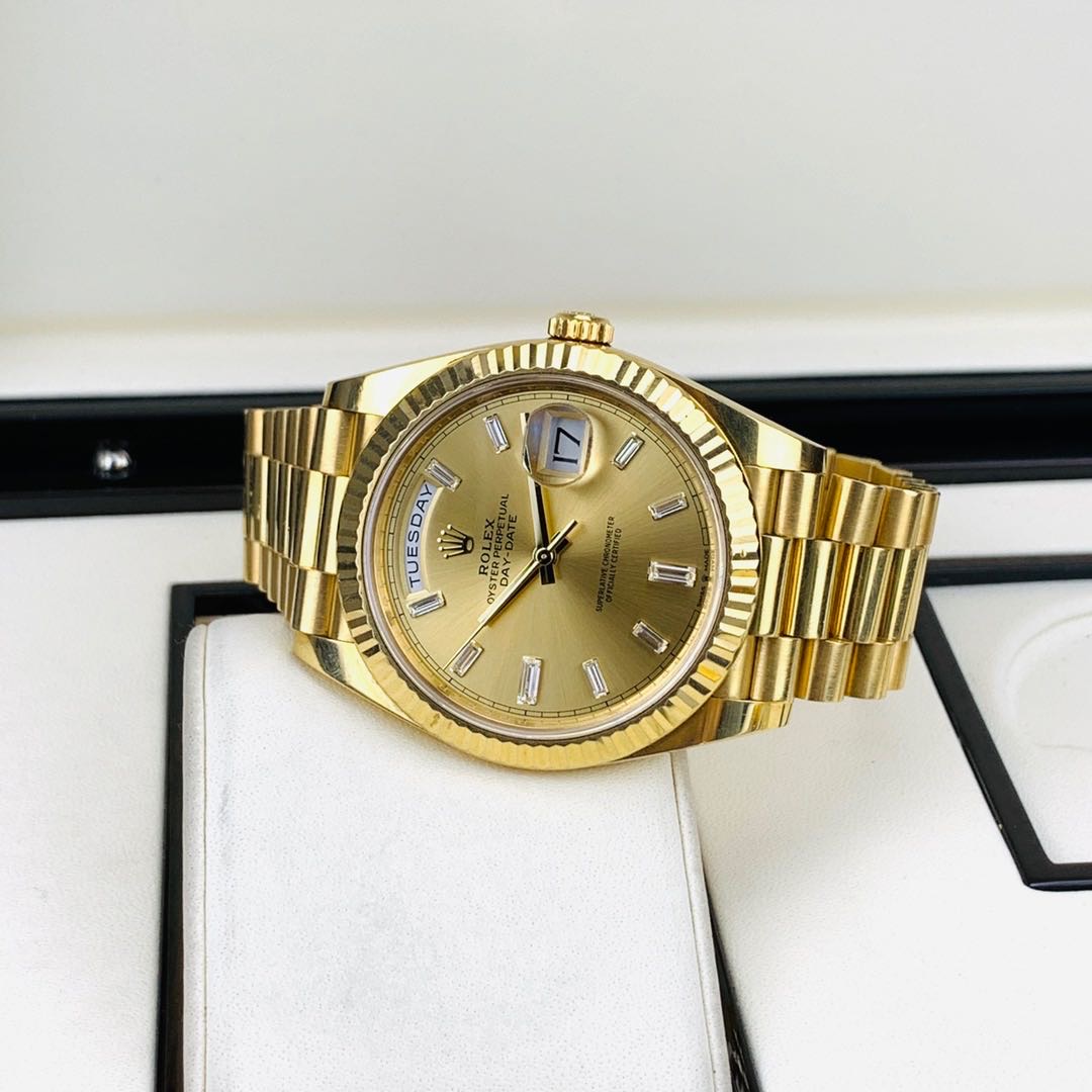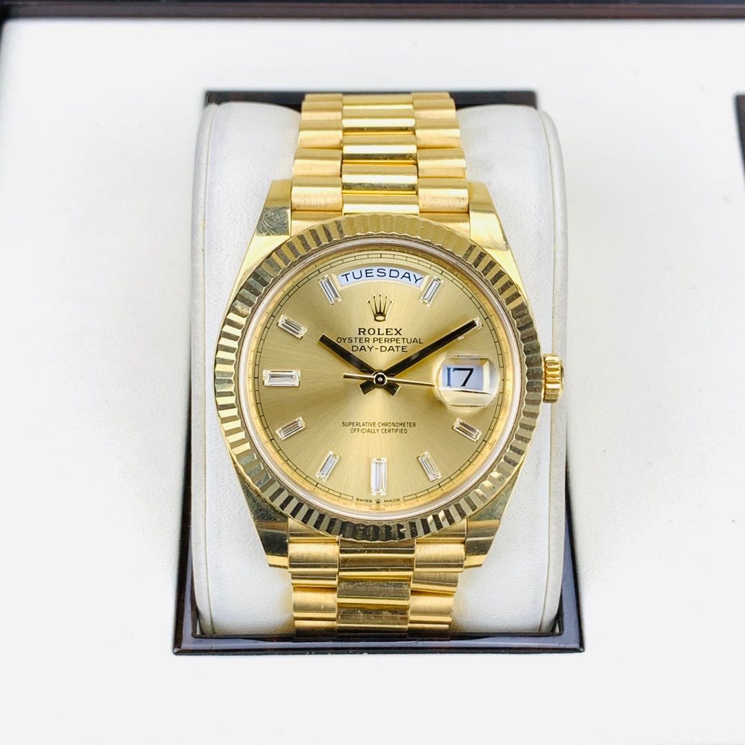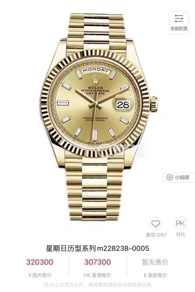 劳力士星期日历M228238.全自动机械.18K黄金.表径40MM.香槟色表盘.冰糖钻.日期显示.星期显示功能.2019年全套全长.带票.专柜320300.现货好价格