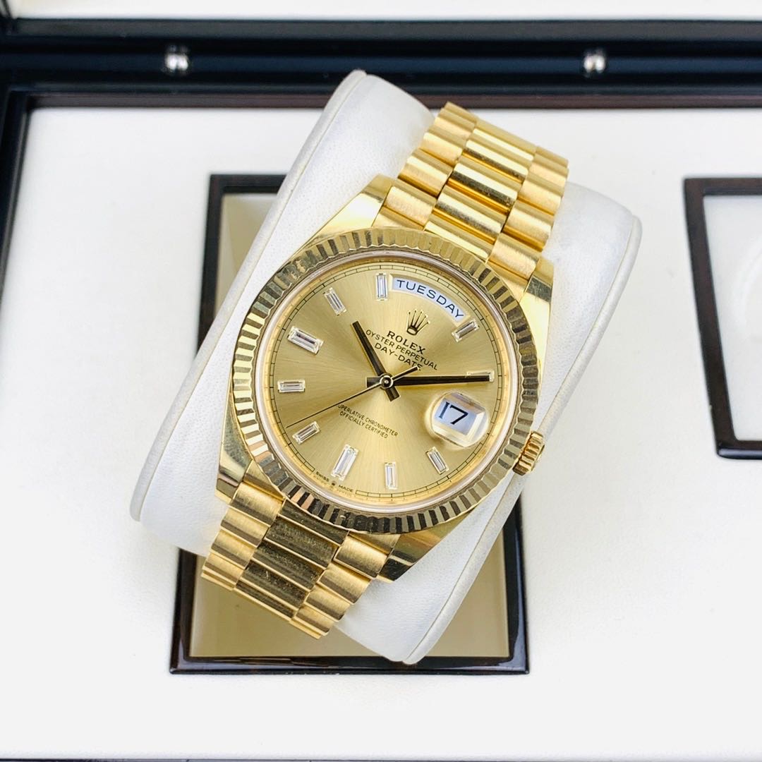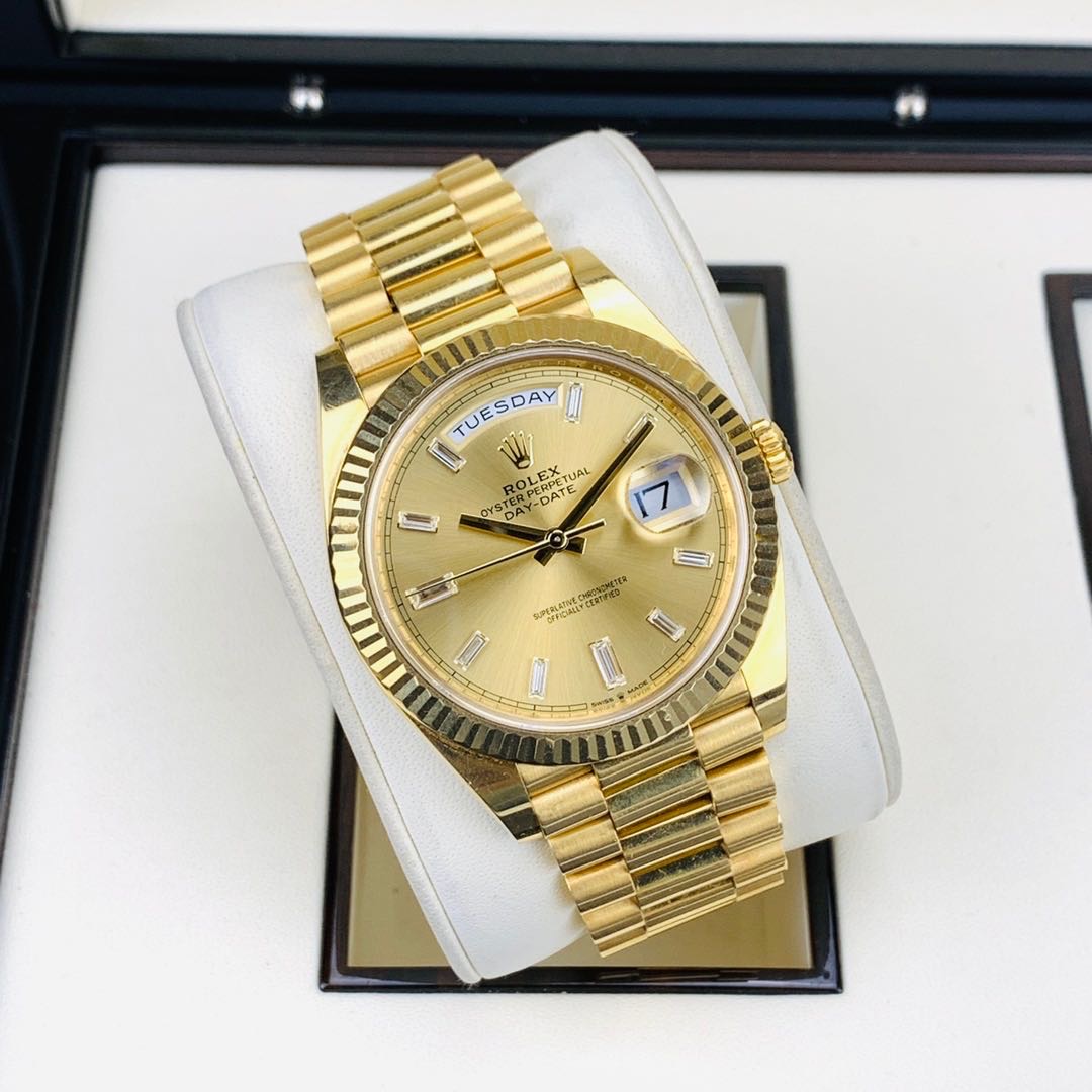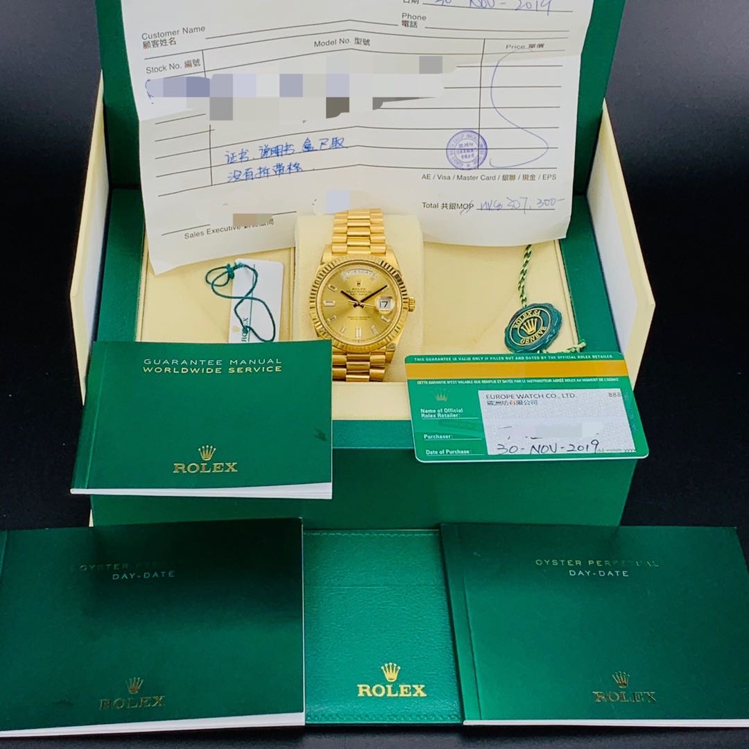 劳力士星期日历M228238.全自动机械.18K黄金.表径40MM.香槟色表盘.冰糖钻.日期显示.星期显示功能.2019年全套全长.带票.专柜320300.现货好价格
