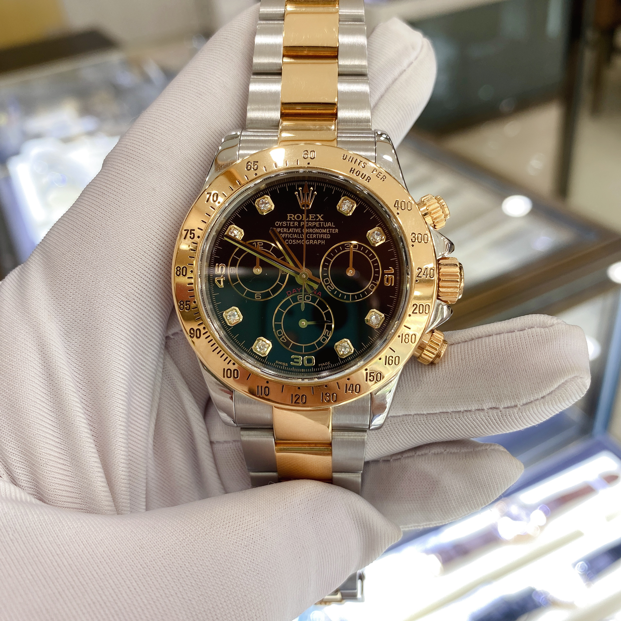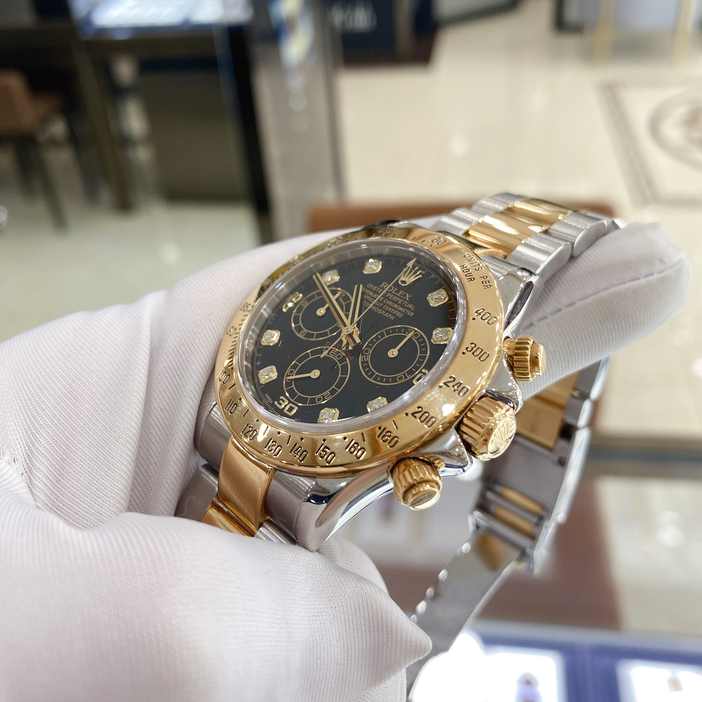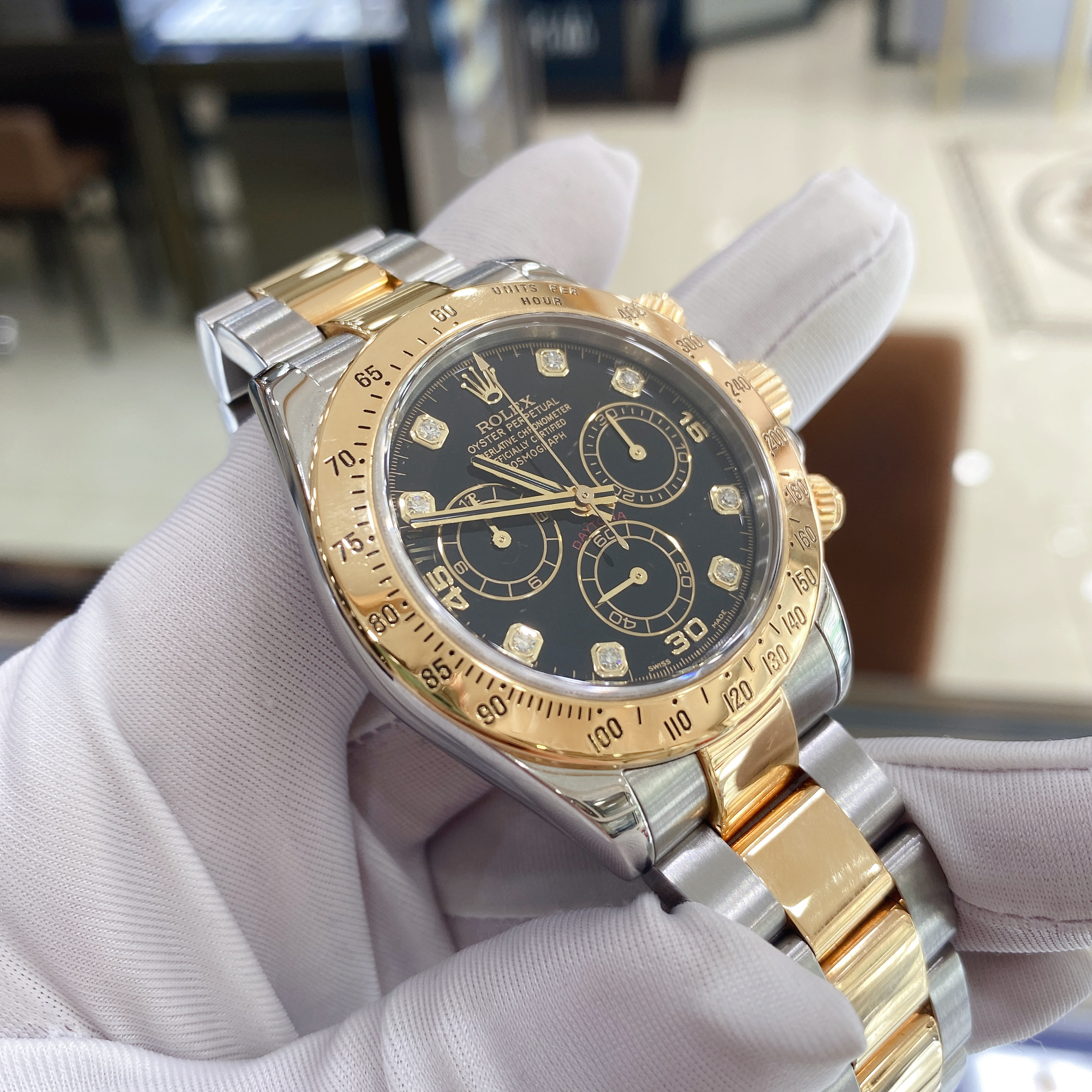 劳力士宇宙计型迪通拿116523,18K黄金/精钢材质,40mm表径,刻度镶钻,计时功能,D字头,自动机械,专柜售价167000 二手单表