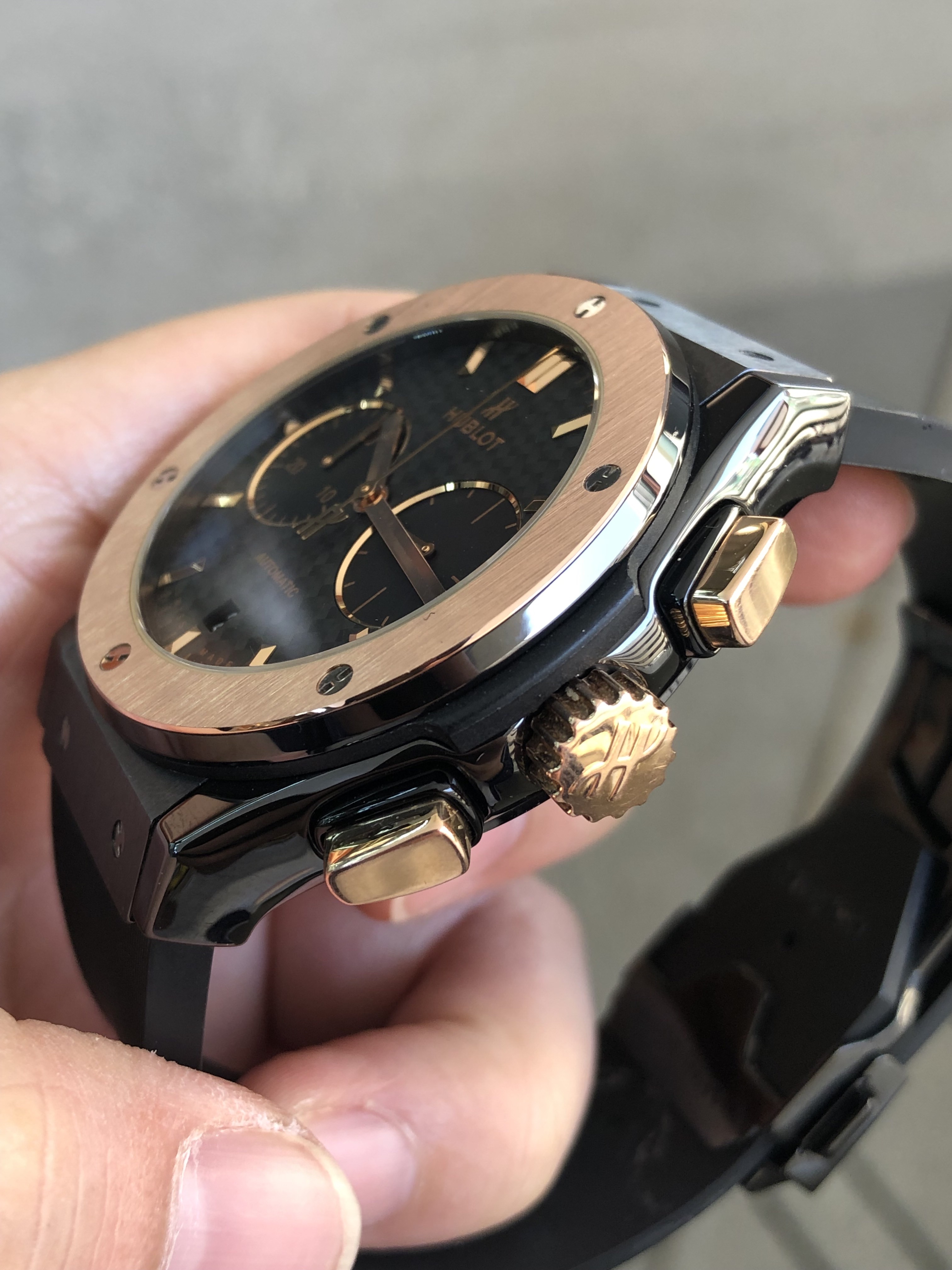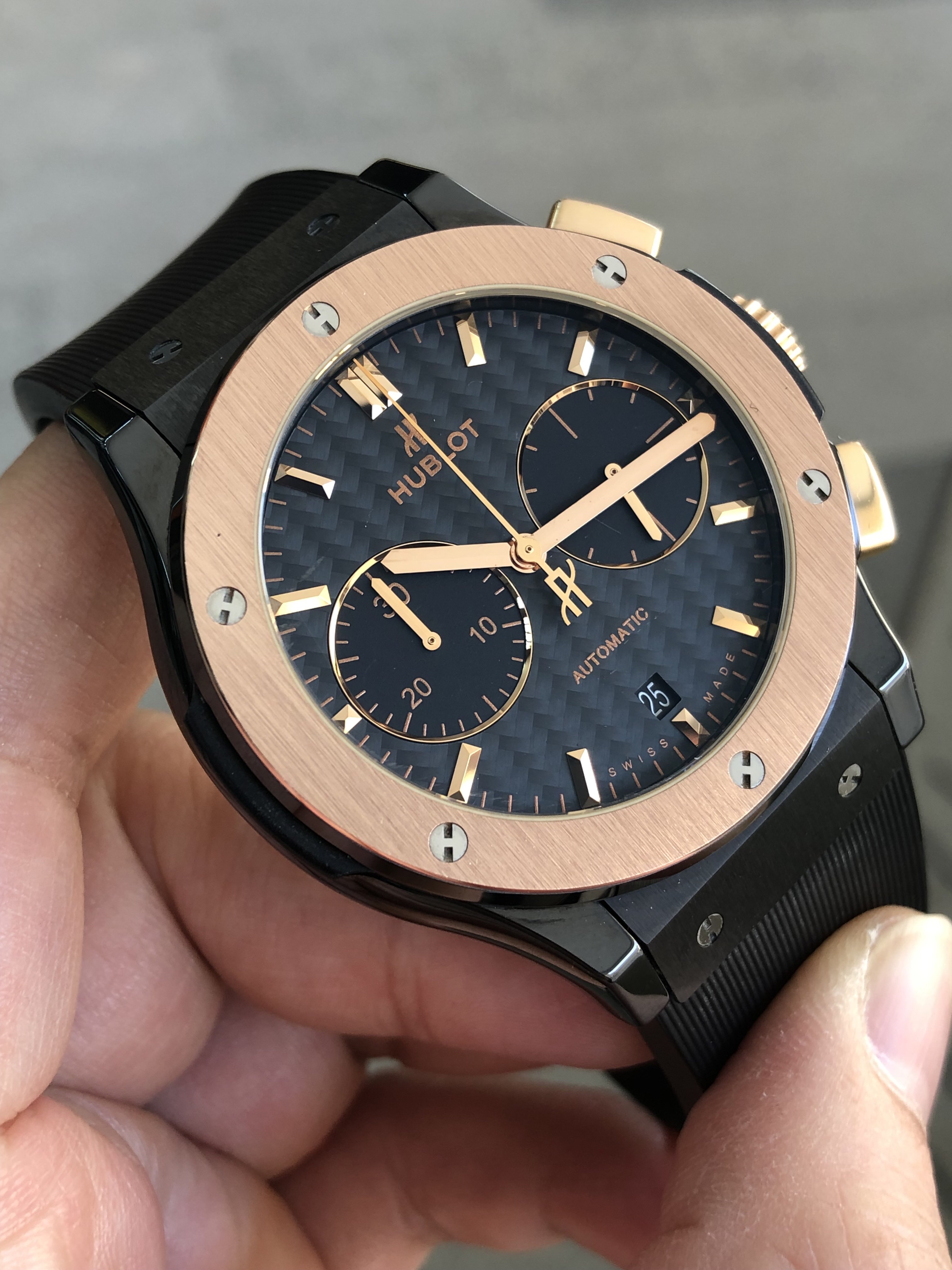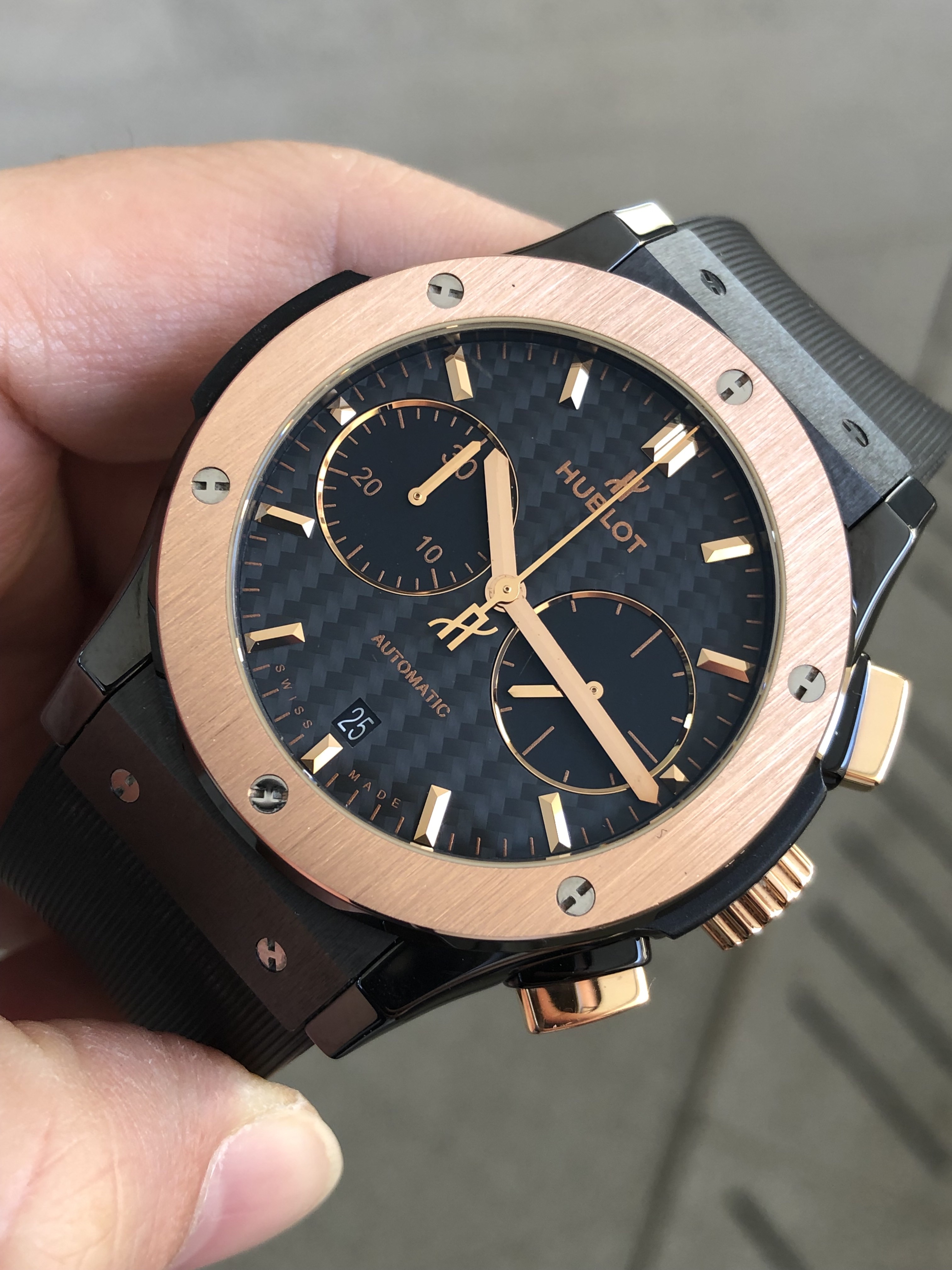 型号:521.CO.1781.RX自动机械男表,45mm表径,极品单表,表壳黑陶瓷材质,玫瑰金外圈及计时按钮、把头,碳纤维盘面,金质刻度、指针,计时功能,日期显示,专柜售价109000,现货好价