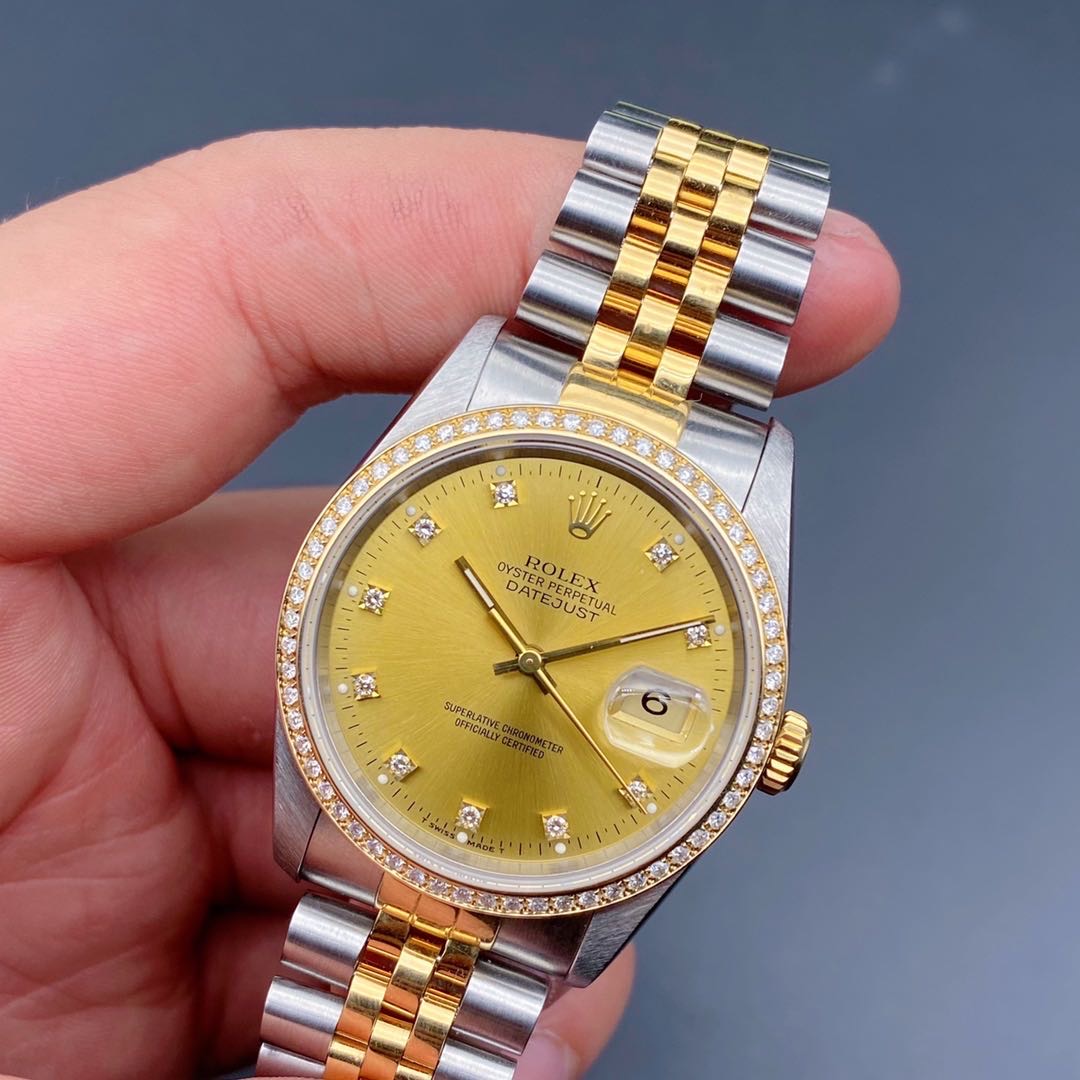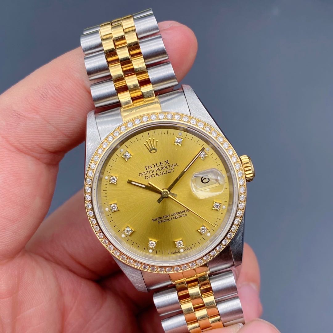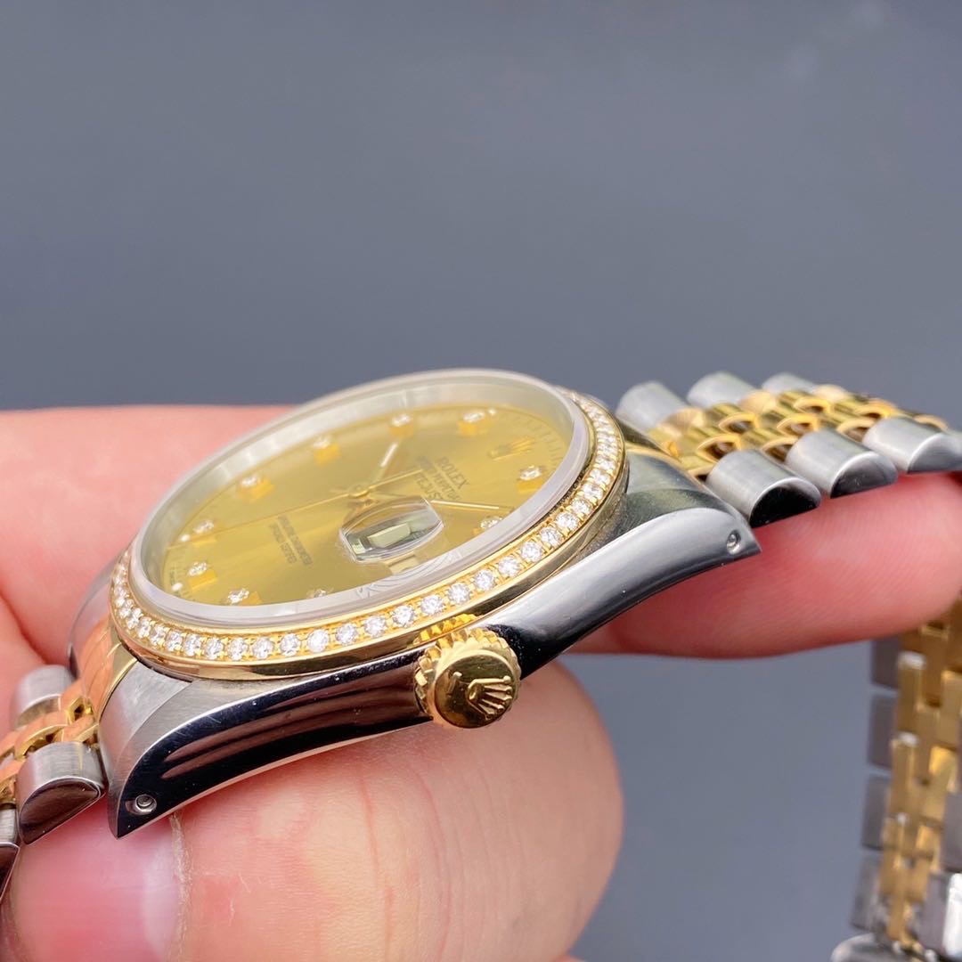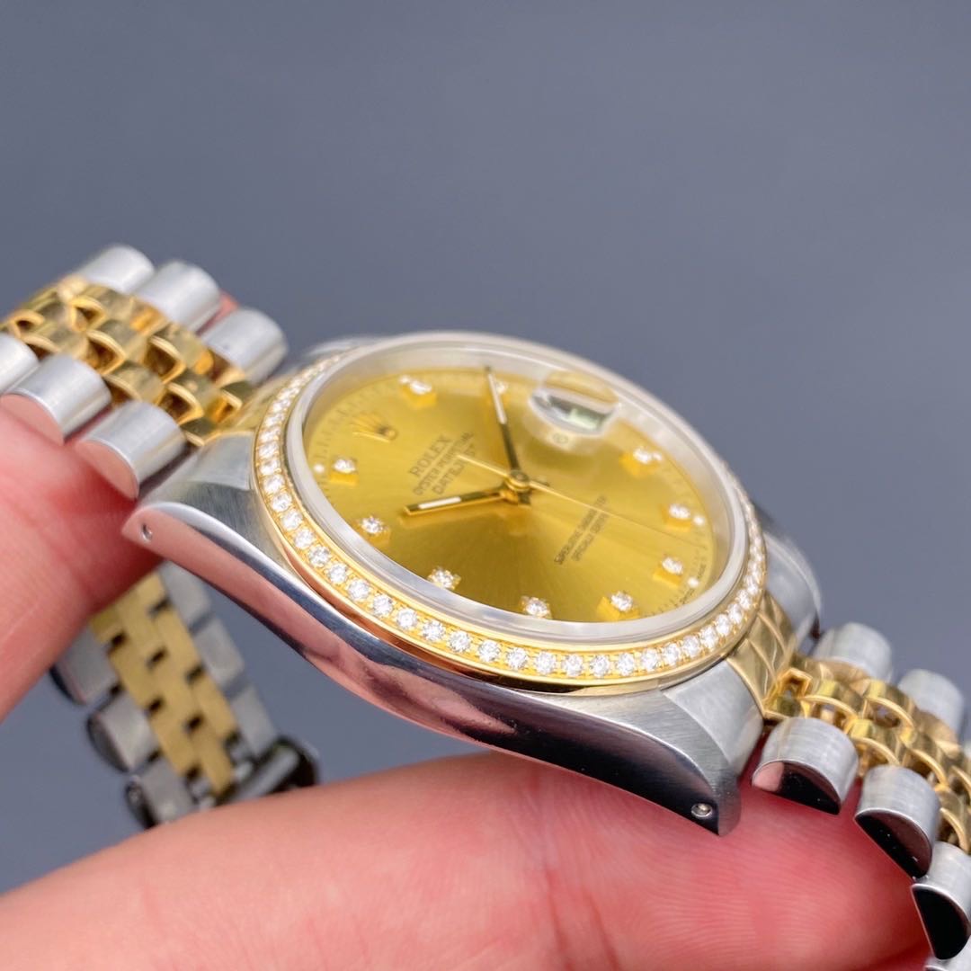 经典男款劳力士日志型16233男士腕表,全自动机械3135机芯,香槟金盘外圈后镶满钻石,表径36mm钻石刻度,日历显示,表带19节笔直挺,折叠扣,参考工价155600,二手好价
