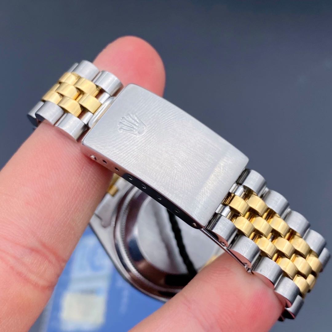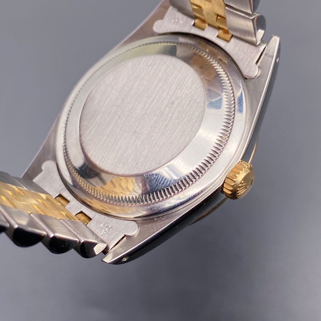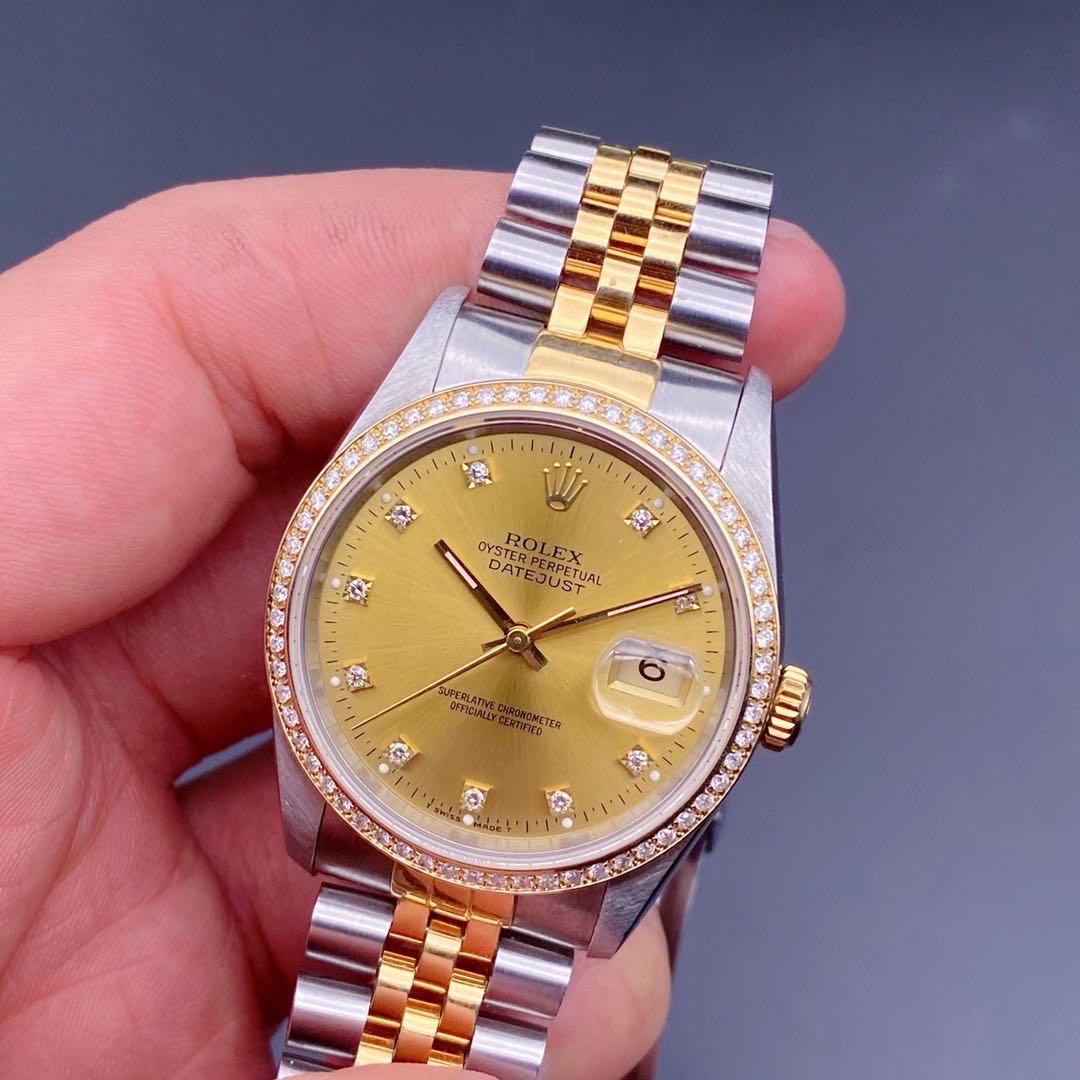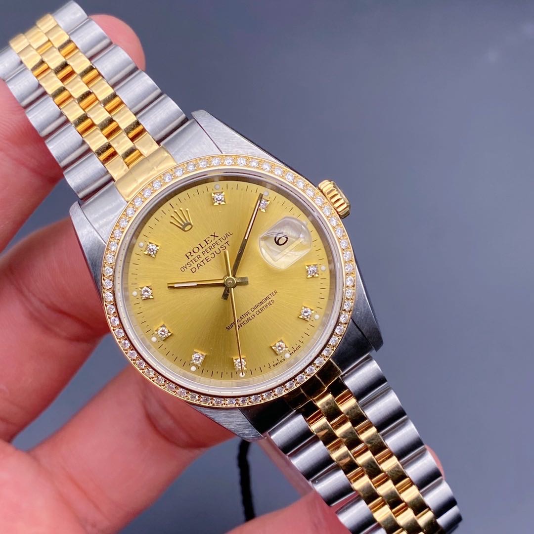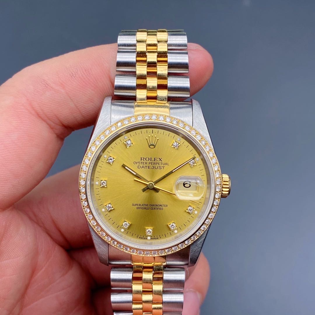 经典男款劳力士日志型16233男士腕表,全自动机械3135机芯,香槟金盘外圈后镶满钻石,表径36mm钻石刻度,日历显示,表带19节笔直挺,折叠扣,参考工价155600,二手好价