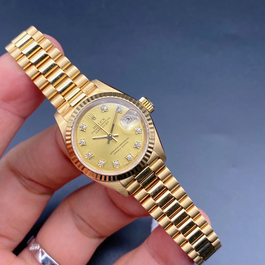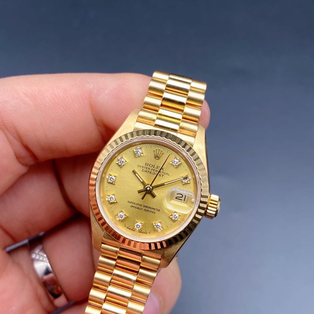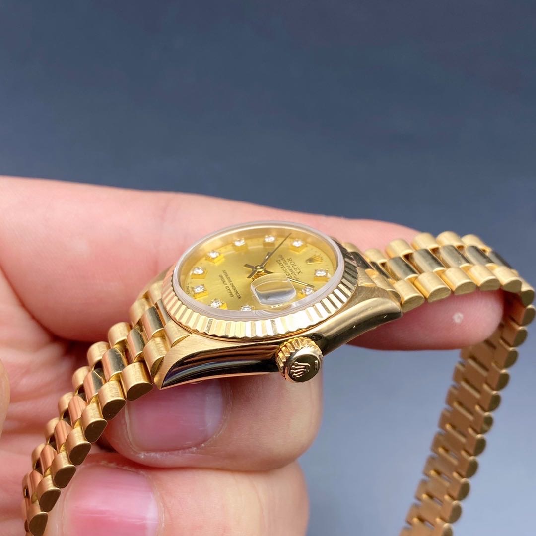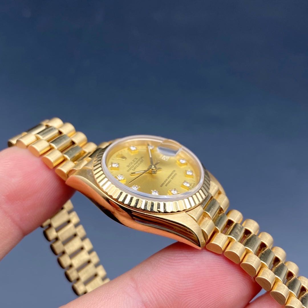 全金劳力士日志型69178女士腕表,通体18k黄金材质,自动机械机芯2135,表径26mm,原镶钻石刻度香槟金盘,皇冠表扣33表节笔直挺,走时准确,公价198200,二手好价继续