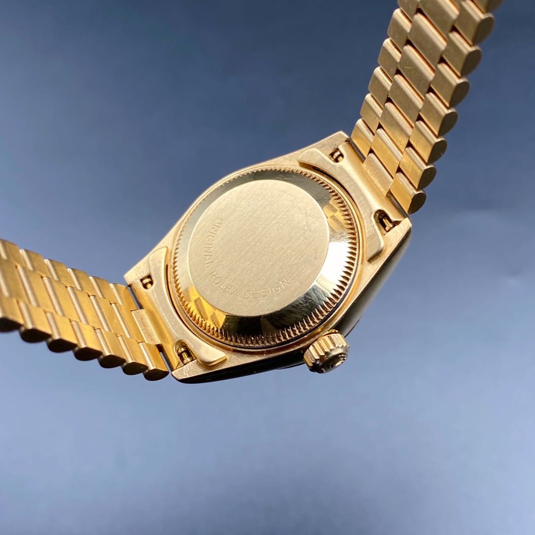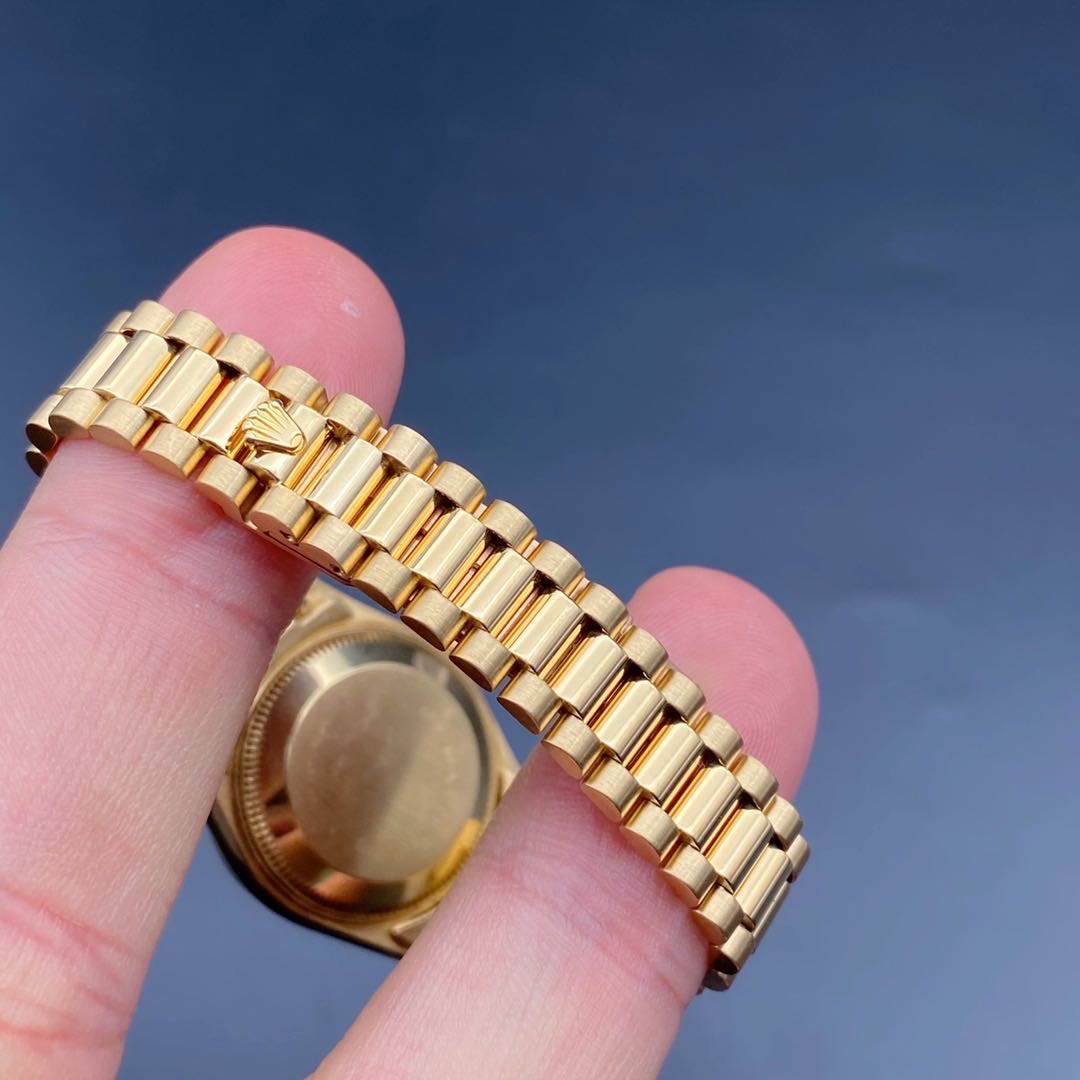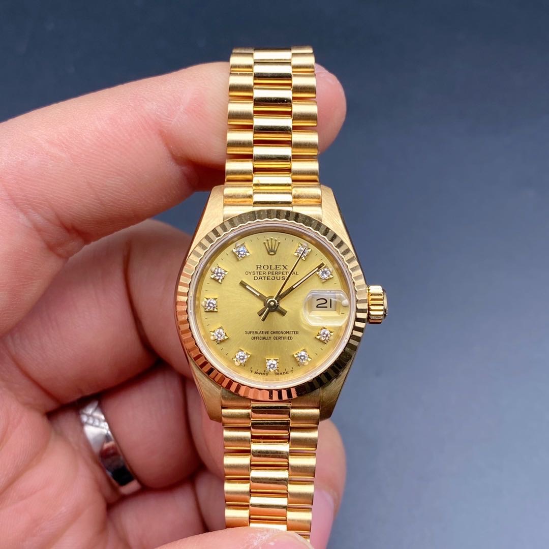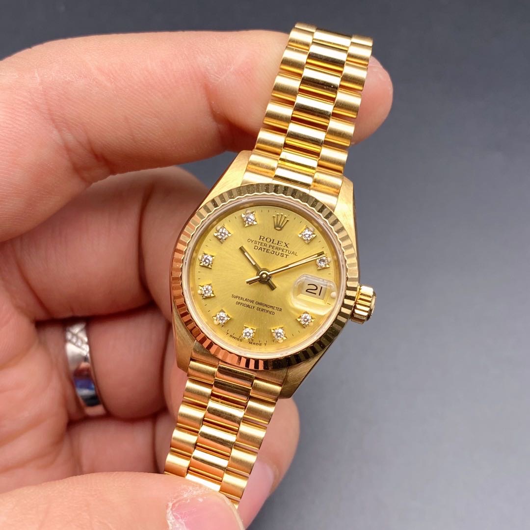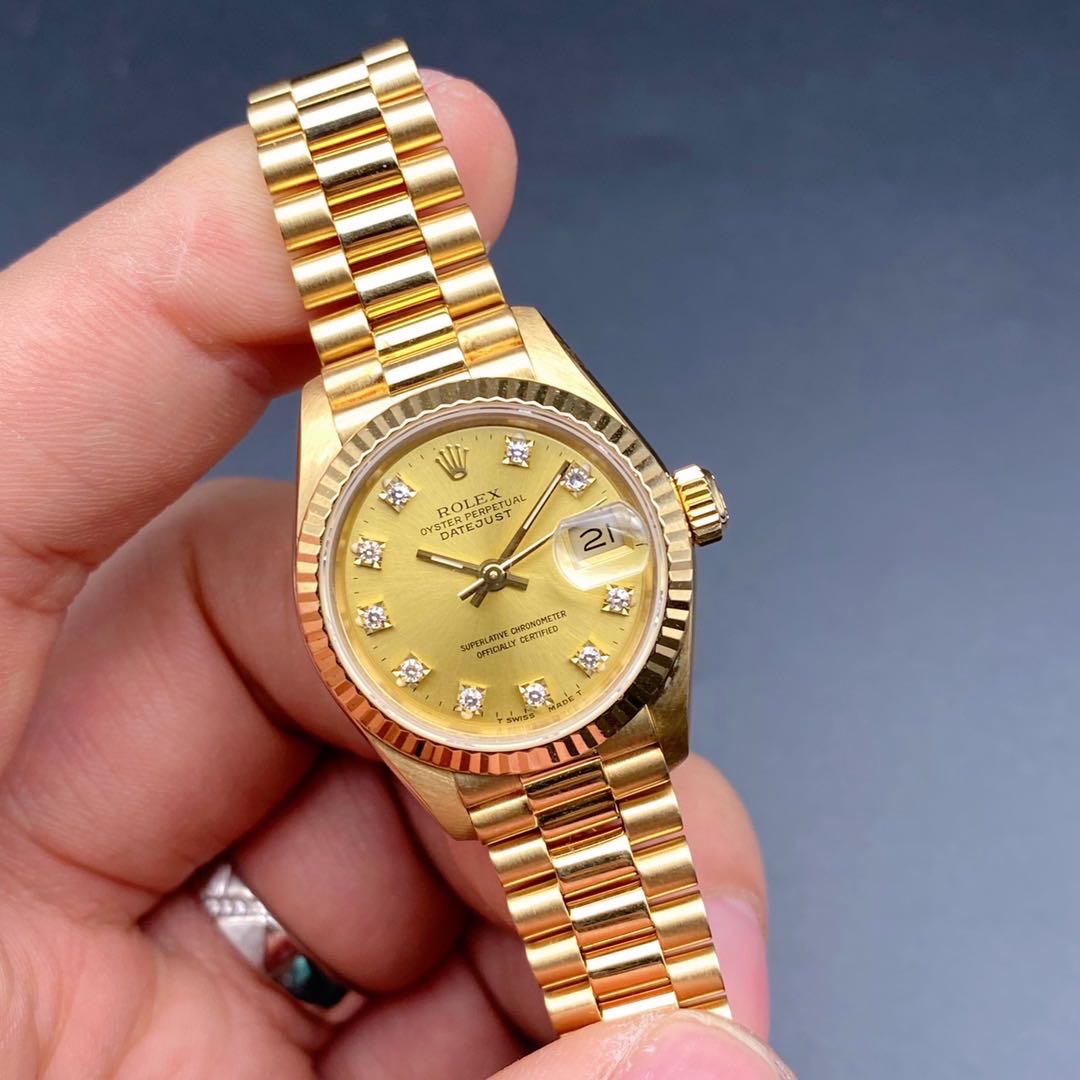 全金劳力士日志型69178女士腕表,通体18k黄金材质,自动机械机芯2135,表径26mm,原镶钻石刻度香槟金盘,皇冠表扣33表节笔直挺,走时准确,公价198200,二手好价继续