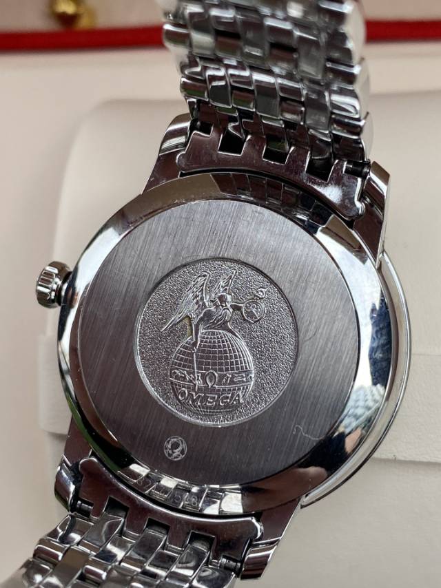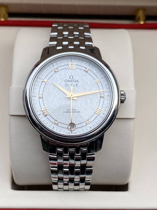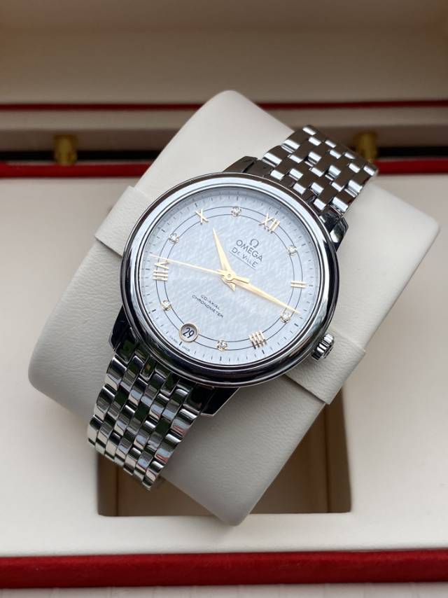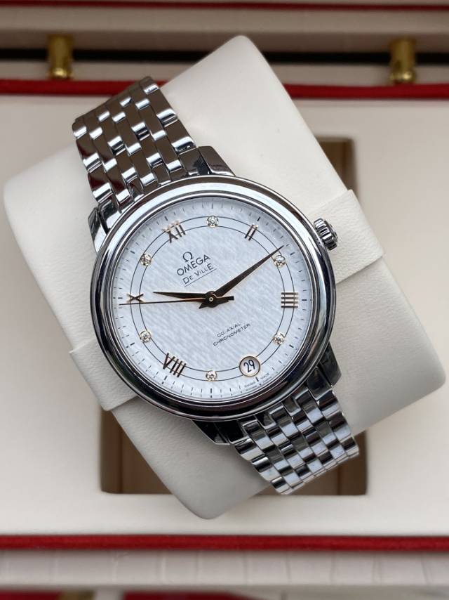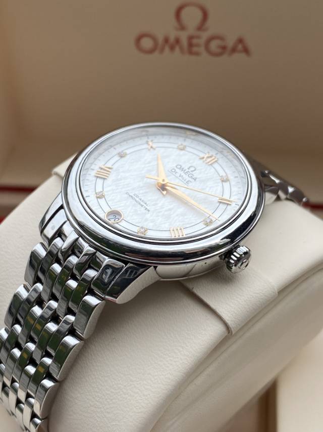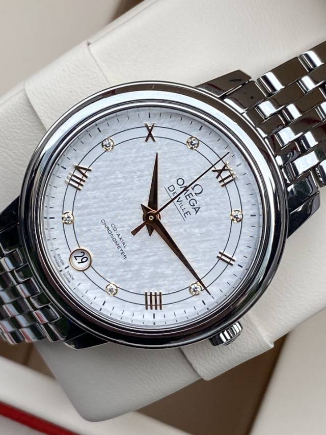 欧米茄碟飞系列、424.10.33.20.52.001、女士自动机械腕表、表径:32.7mm、材质:精钢/钢带、白色轨道盘面、金针、条形罗马刻度、日期显示、自产2500自动机芯,原价33100元
