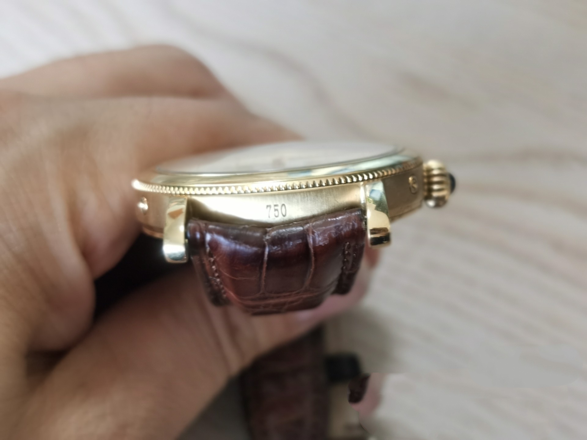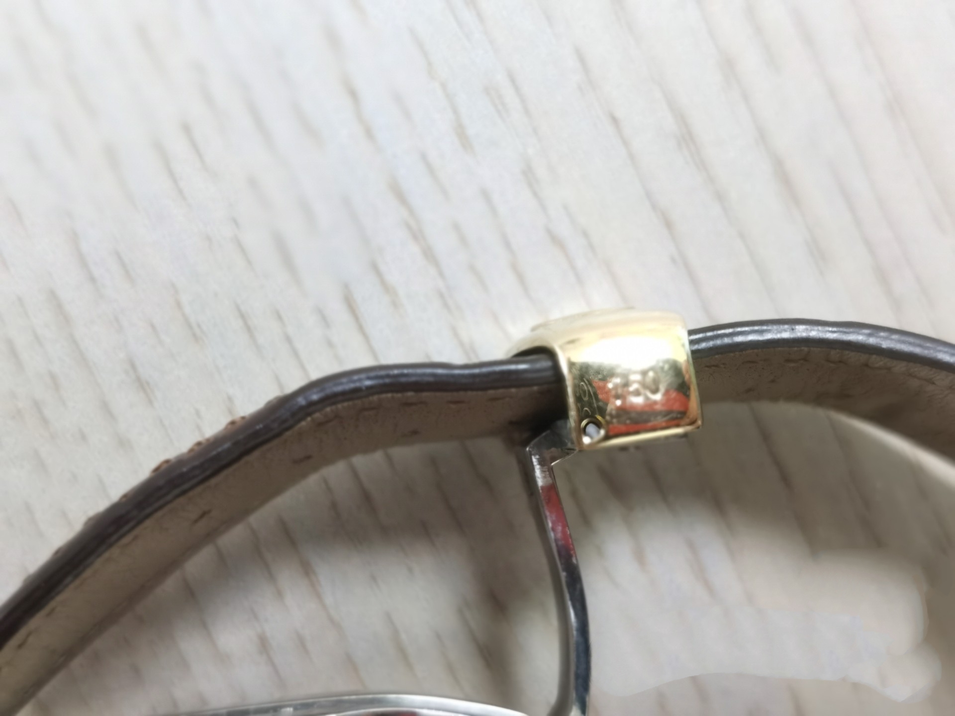 表体:18K黄金表壳/表圈/底盖(刻有750字样,见下图),表把表头包18K黄金外镶蓝色刚玉,蓝宝石玻璃