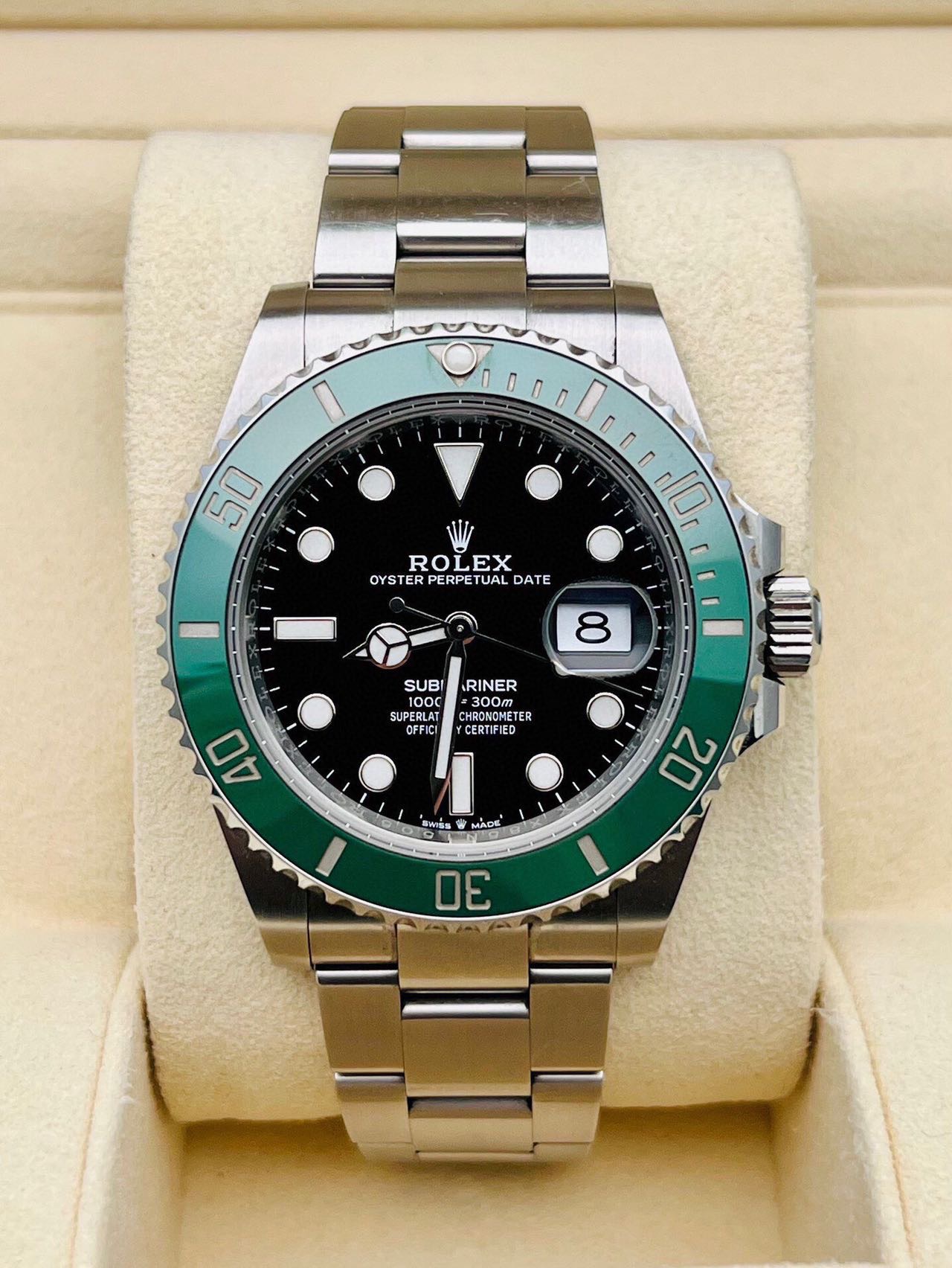 腕表特征:自动机械男士 表径:41毫米 防水深度:300米 混合时标,夜光 表壳蚝式钢材质 功能:日期显示 附件:极品全套