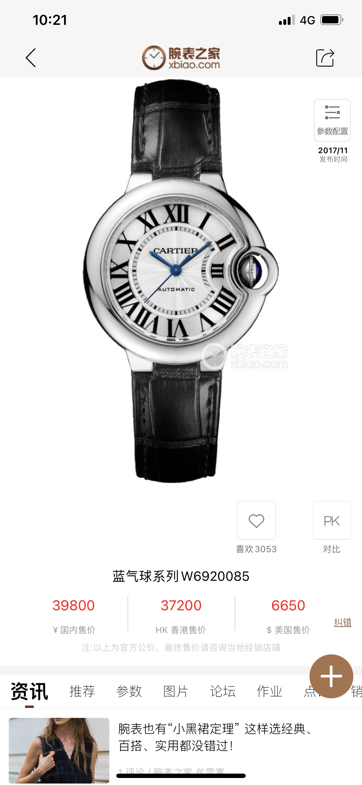 卡地亚蓝气球系列,W6920085,表径33mm,三针经典,卡地亚最热门表款,公价39800。