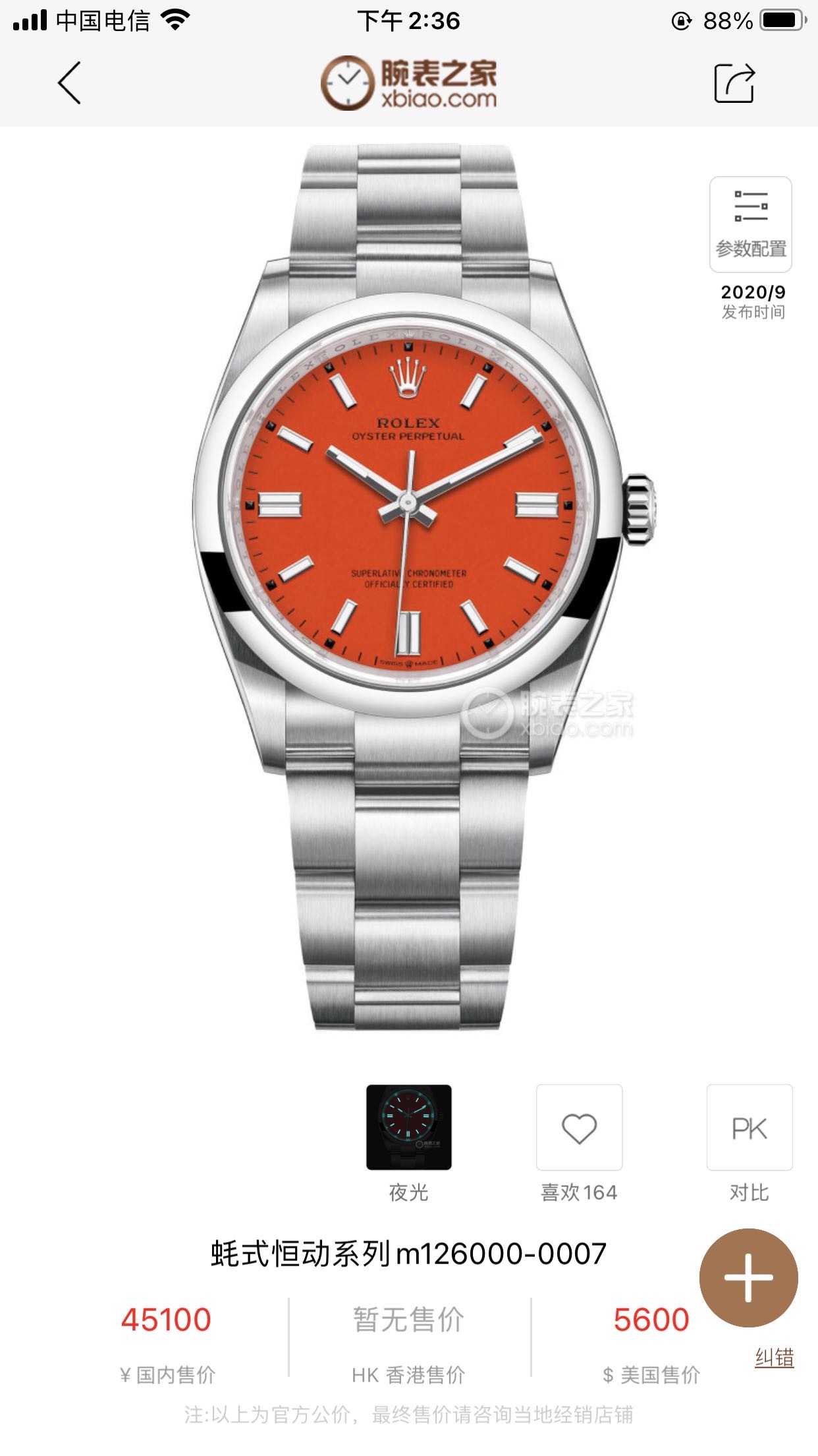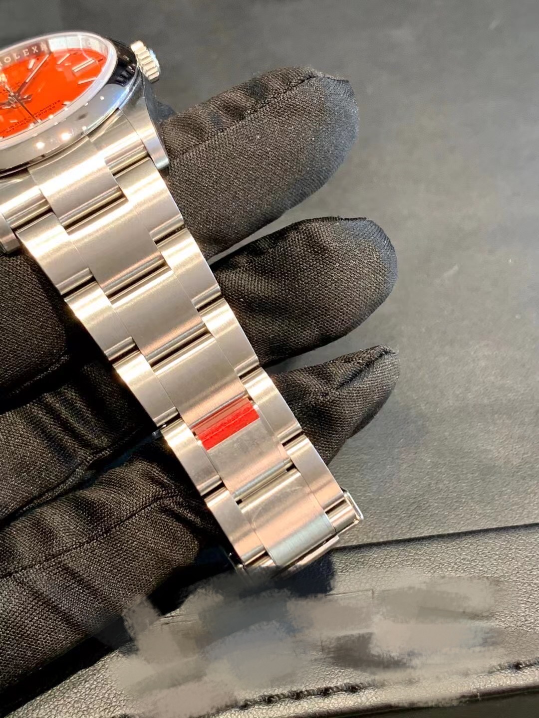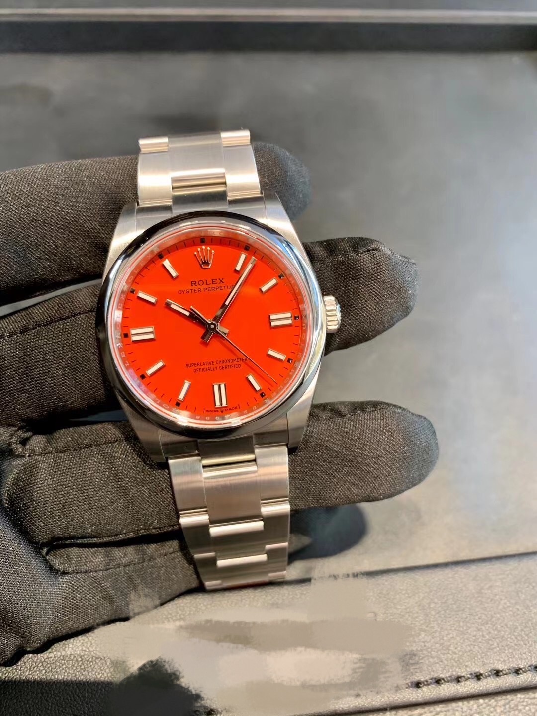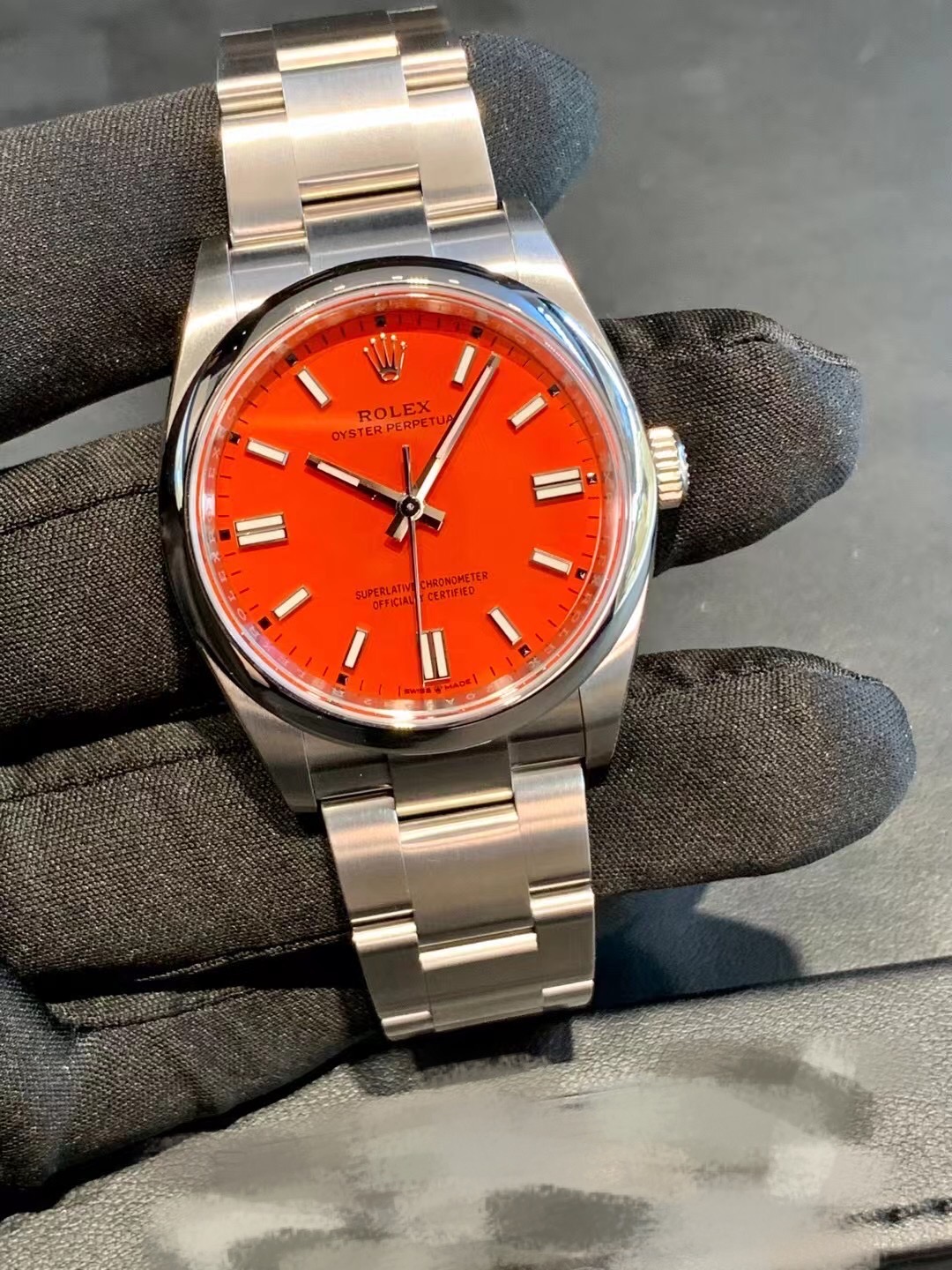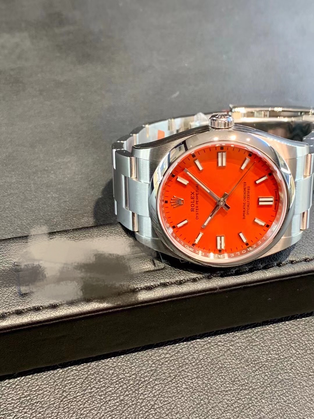 表径:36mm 生活防水 珊瑚红色盘面精钢蚝式表带,附件:未使用全套 稀有超公价表款