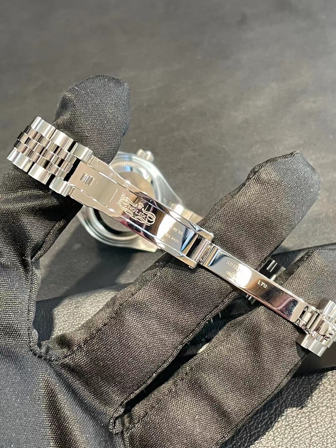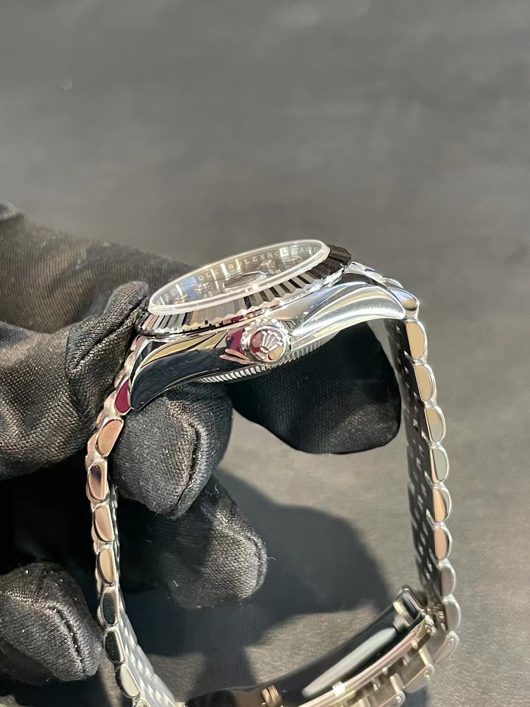 劳力士女装日志型钢带自动机械女表279174,28mm表径黑灰色盘面钻石刻度经典大三针日历显示,18K白金三角坑纹表圈904L精钢纪念型五珠链带,柜台原价77800,现好价出