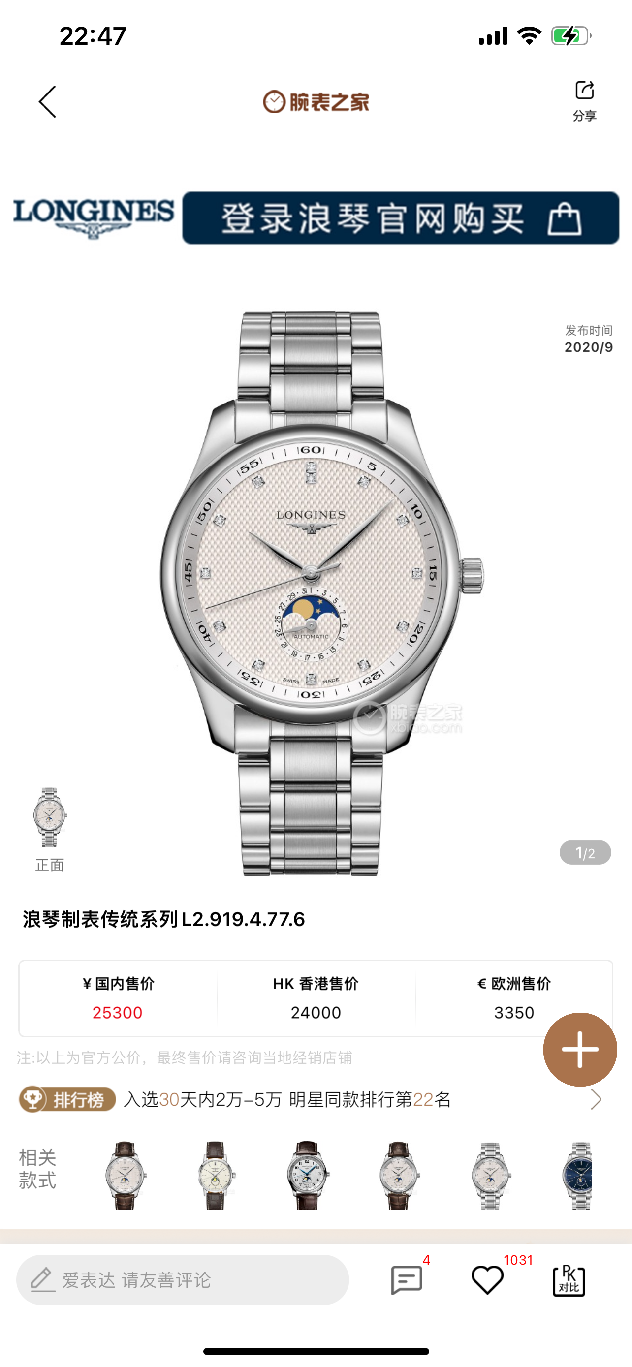 浪琴名匠系列L2.919.4.77.6钢带月相自动机械男表,42mm表径,柜台原价25300,现货秒发。