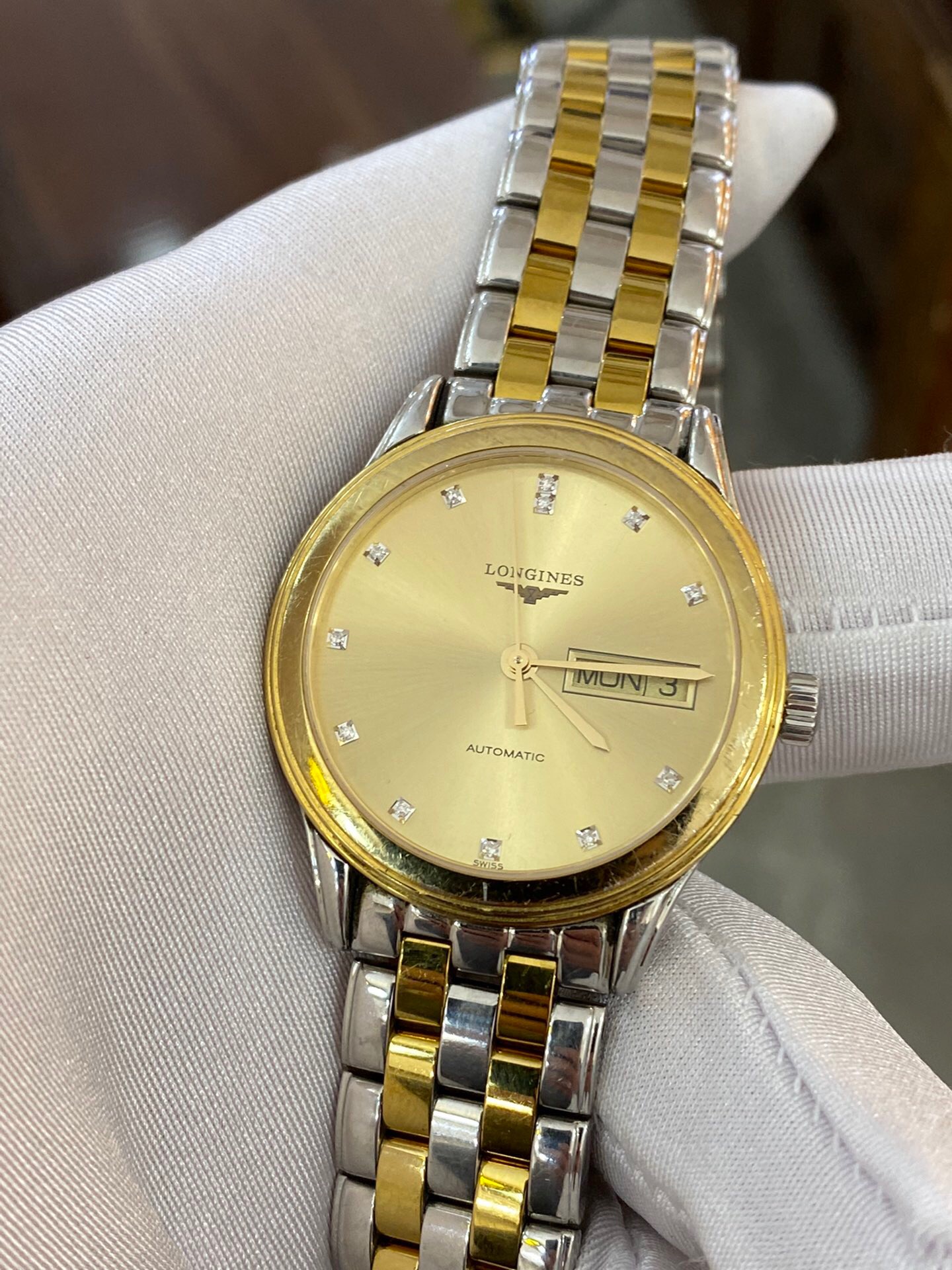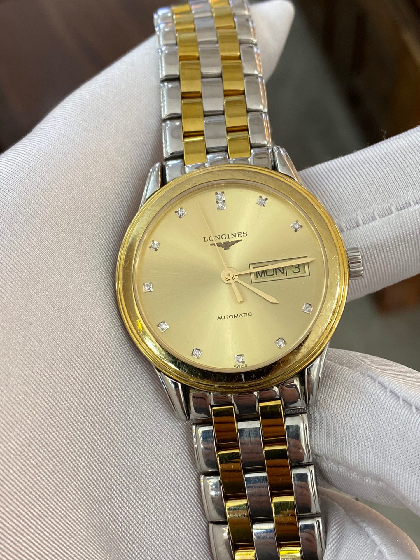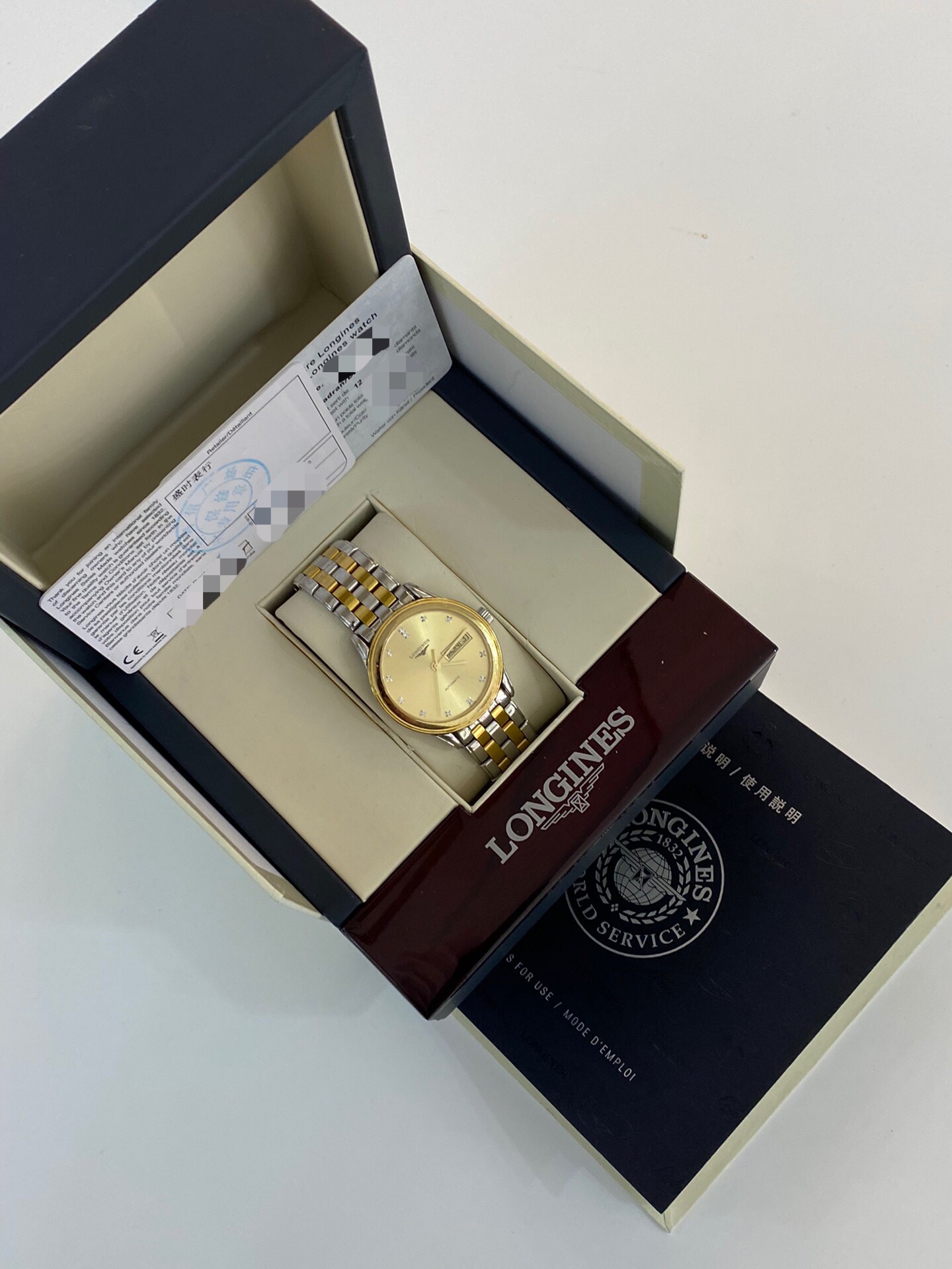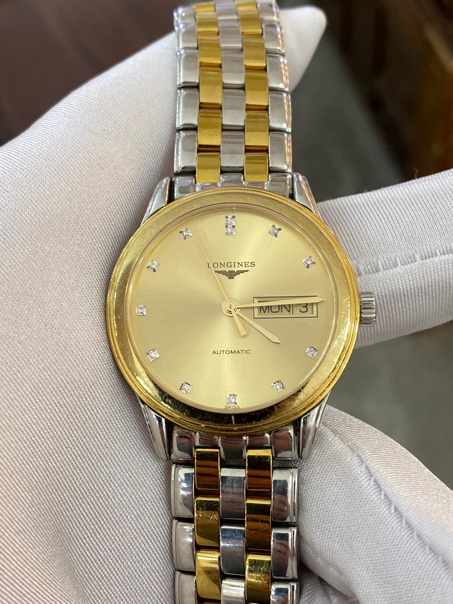 浪琴军旗系列 L4.799.3.37.7 男士自动机械腕表 表径:35.6mm 材质:精钢/镀金 金色盘面 钻石刻度 双日期显示
