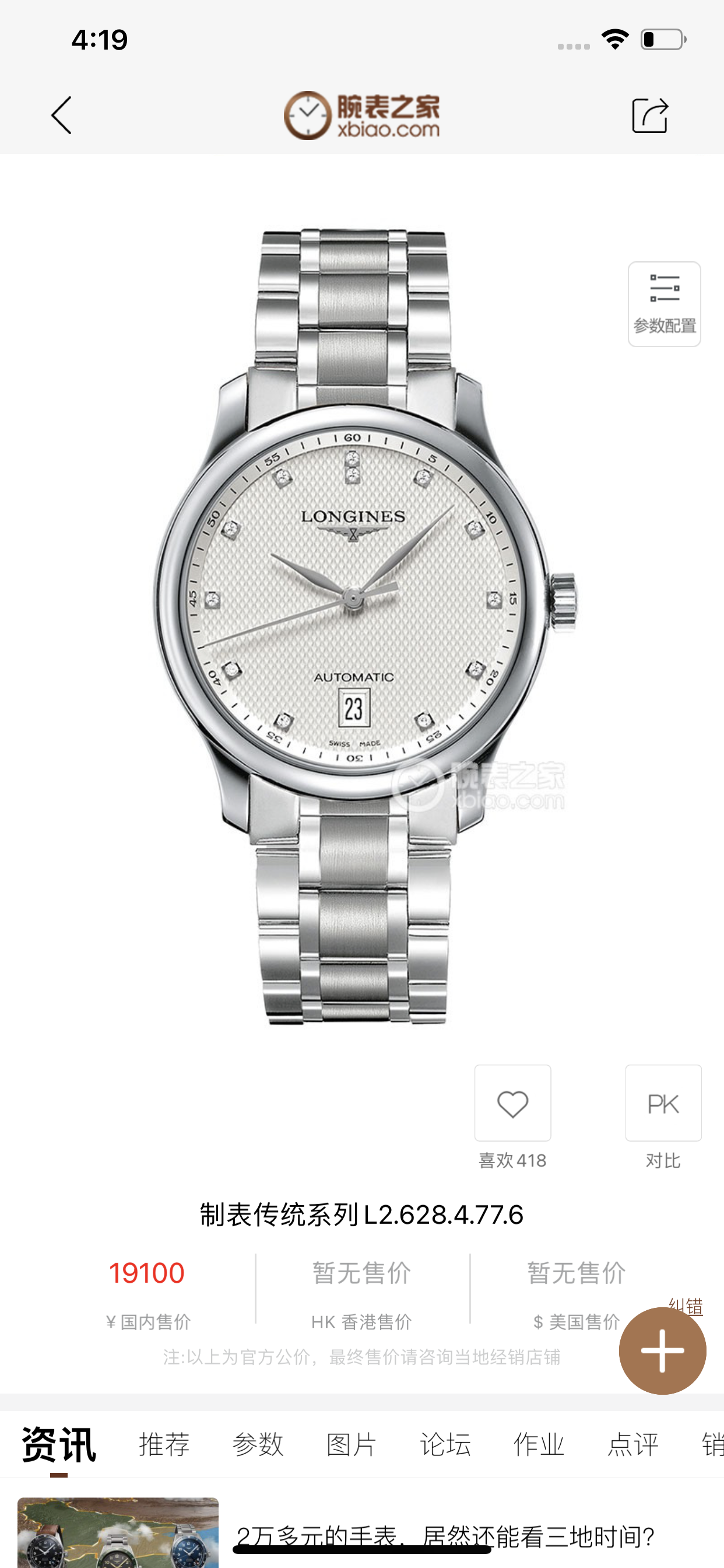 浪琴名匠628系列,机械男表,38.5mm表径,公价19100