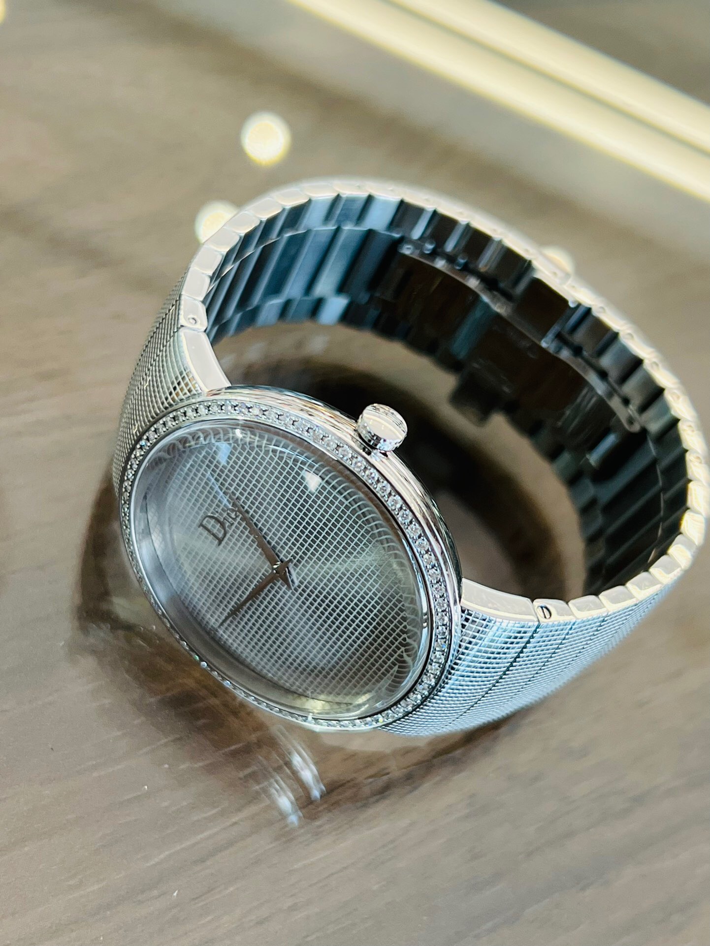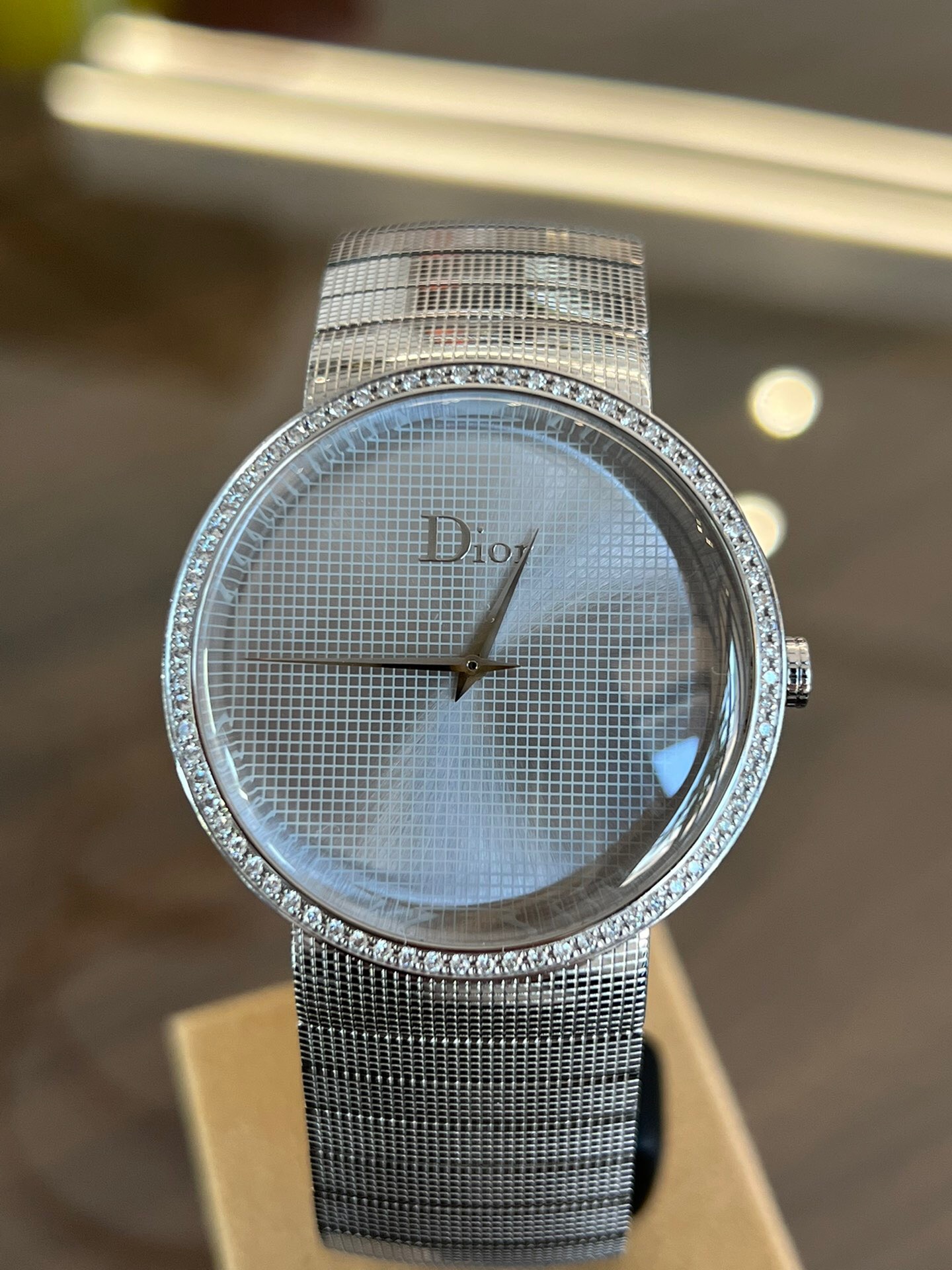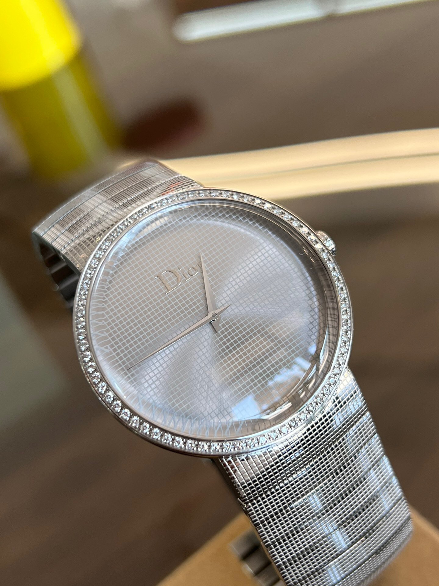 迪奥LA D DE DIOR系列型号:CD043111女士石英钢带腕表,38毫米表径,灰色表盘,表壳材质: 不锈钢镶钻.折叠扣,参考类似款专柜公价,55000