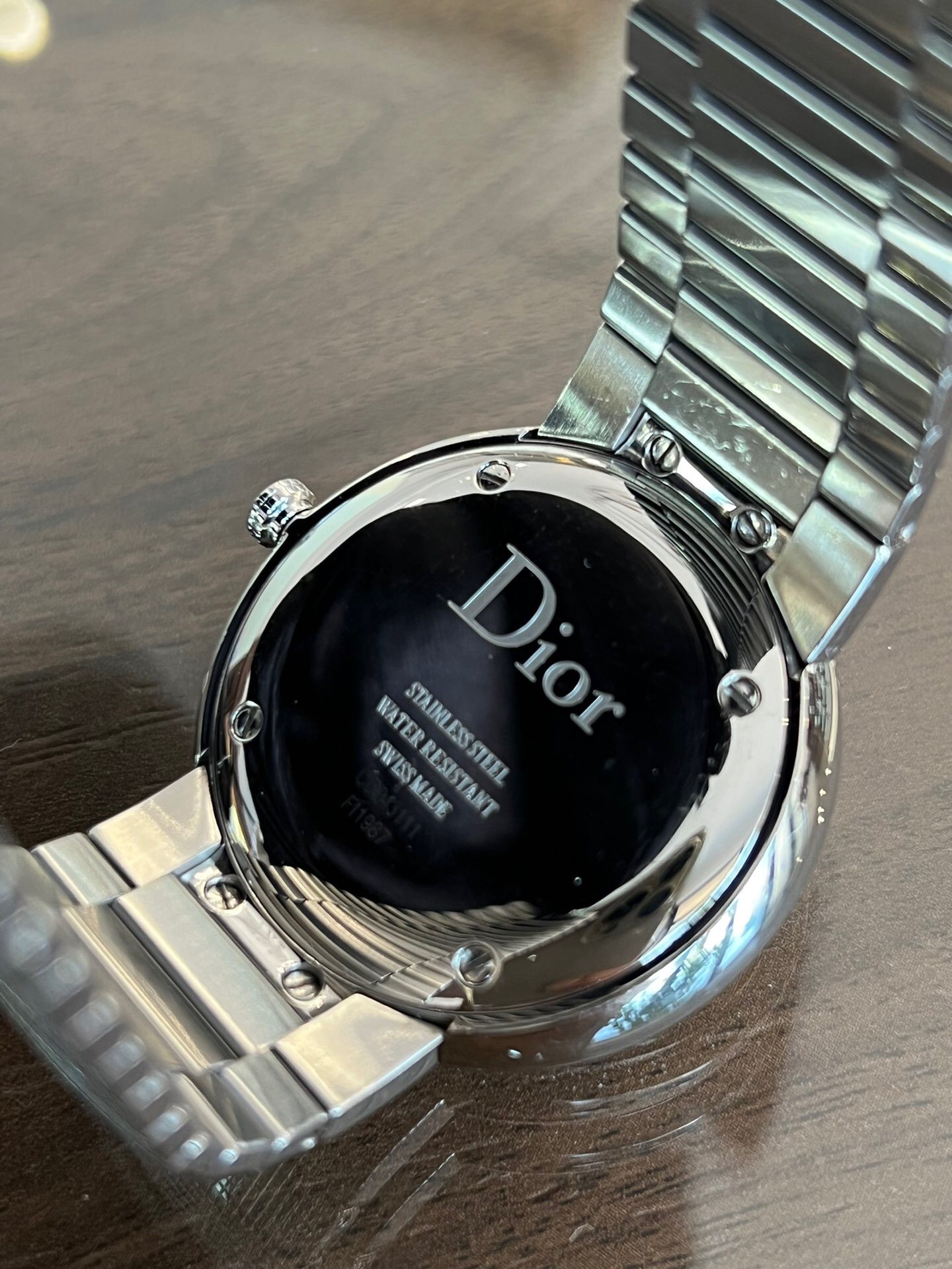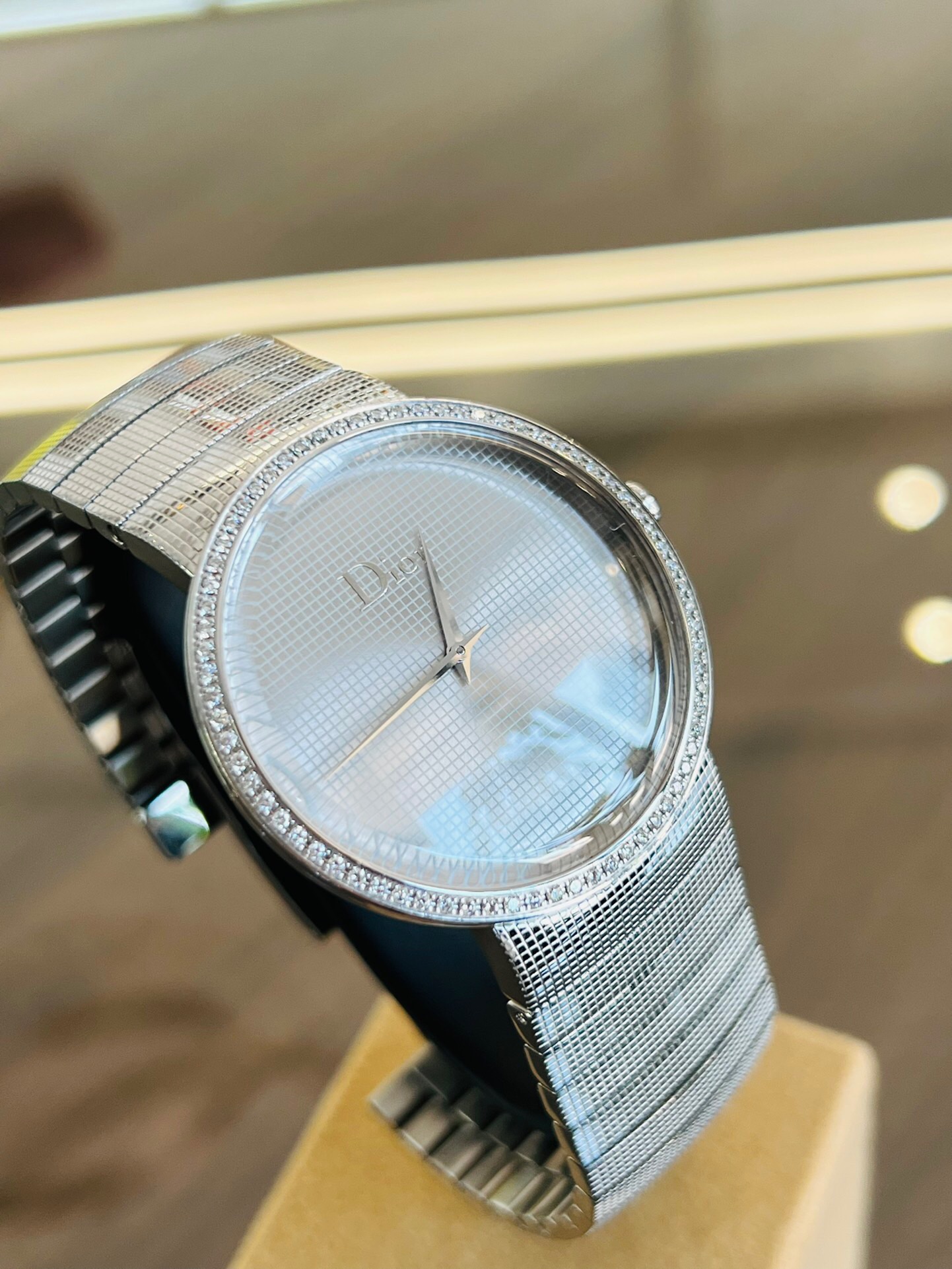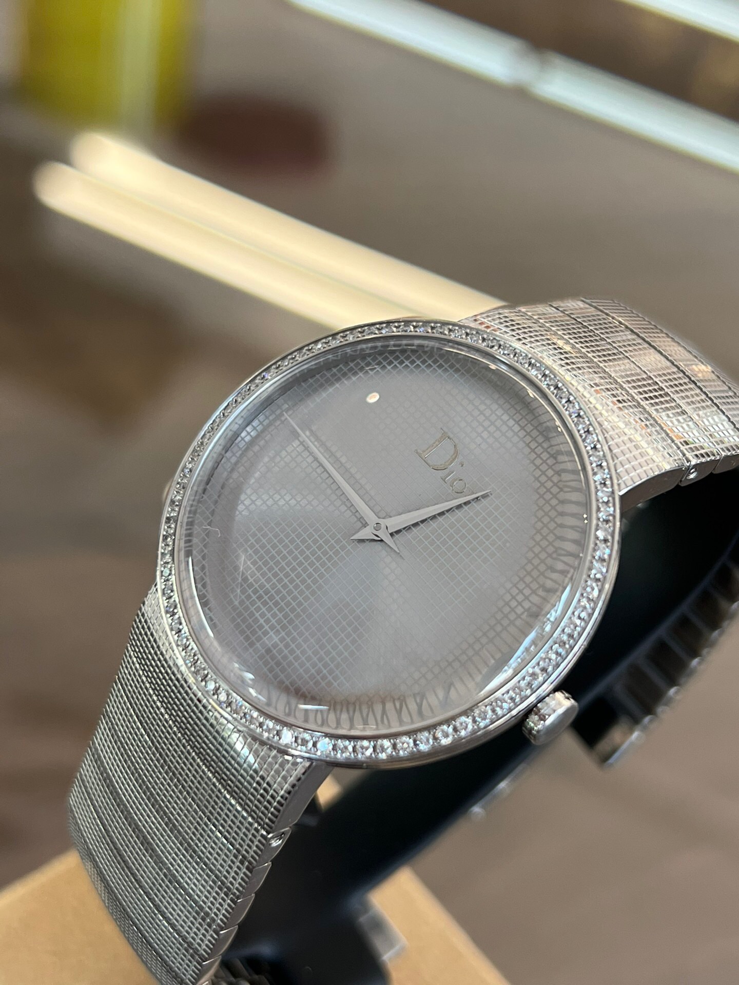 迪奥LA D DE DIOR系列型号:CD043111女士石英钢带腕表,38毫米表径,灰色表盘,表壳材质: 不锈钢镶钻.折叠扣,参考类似款专柜公价,55000