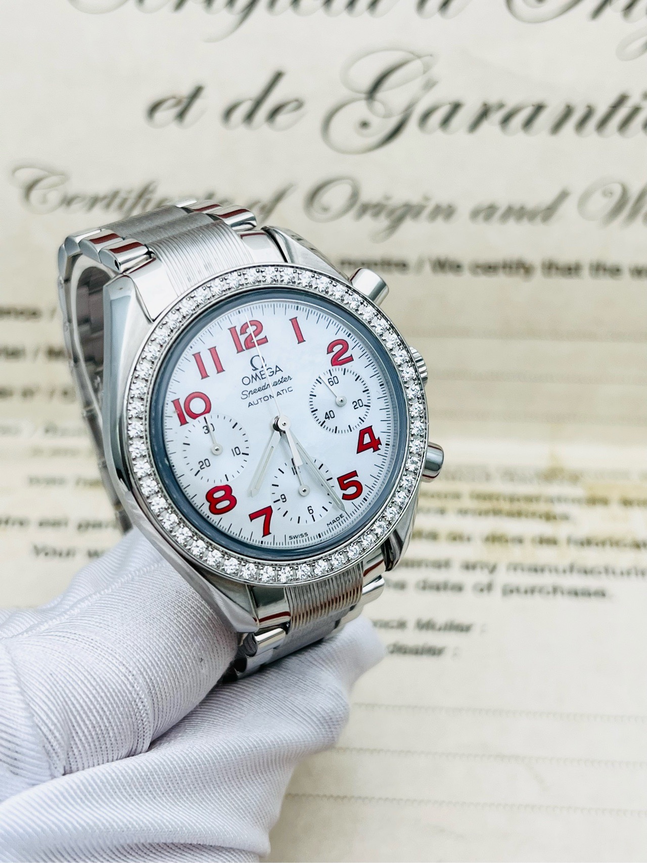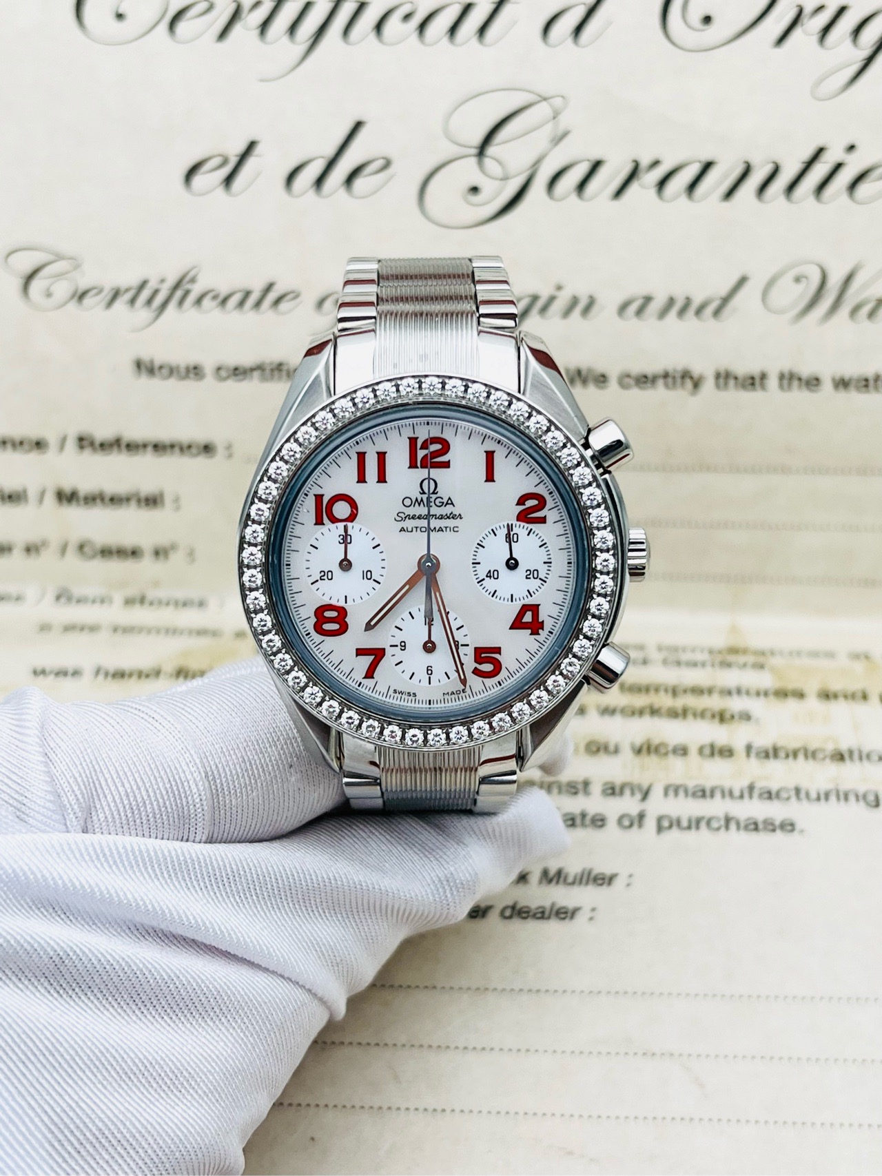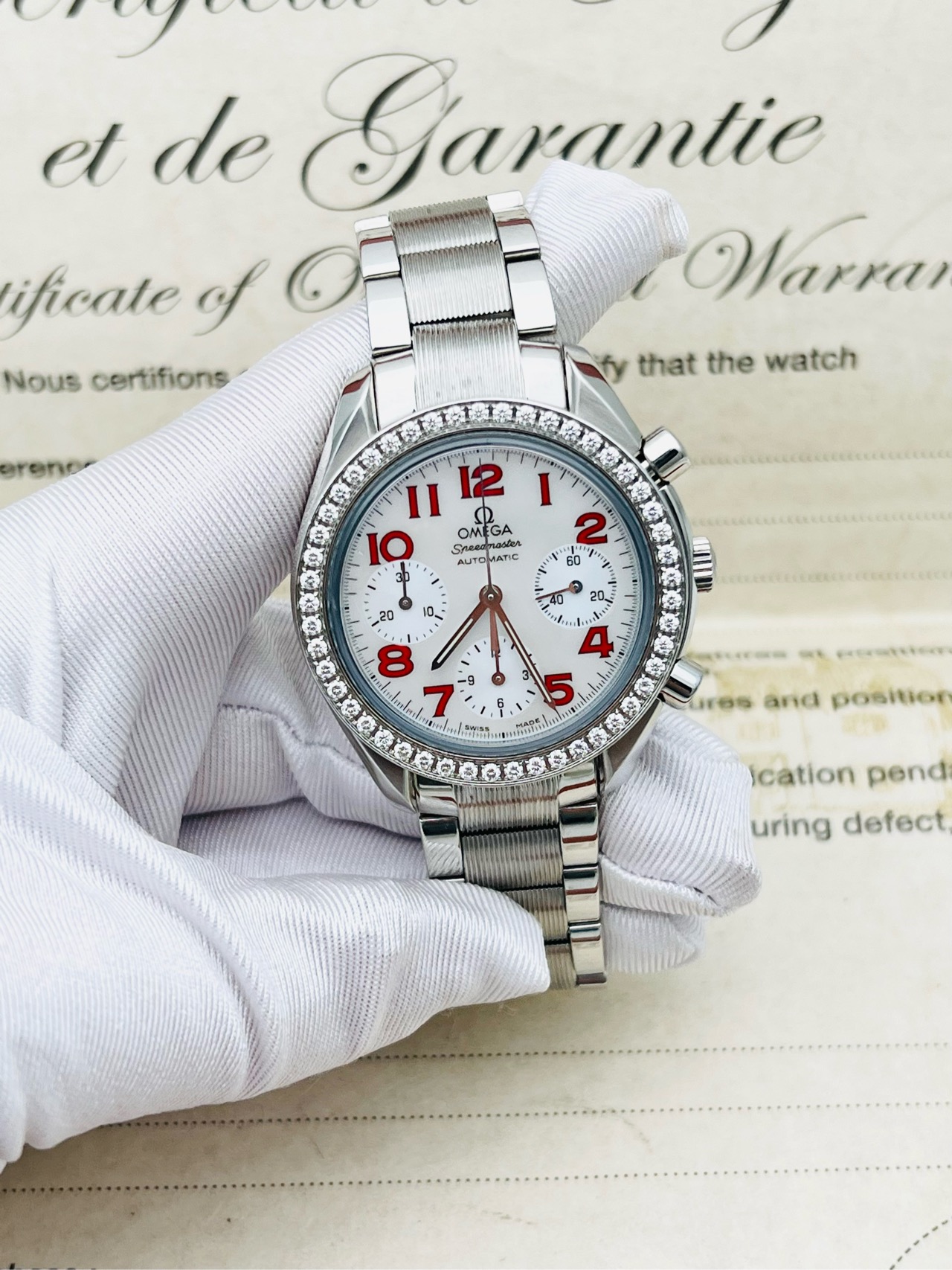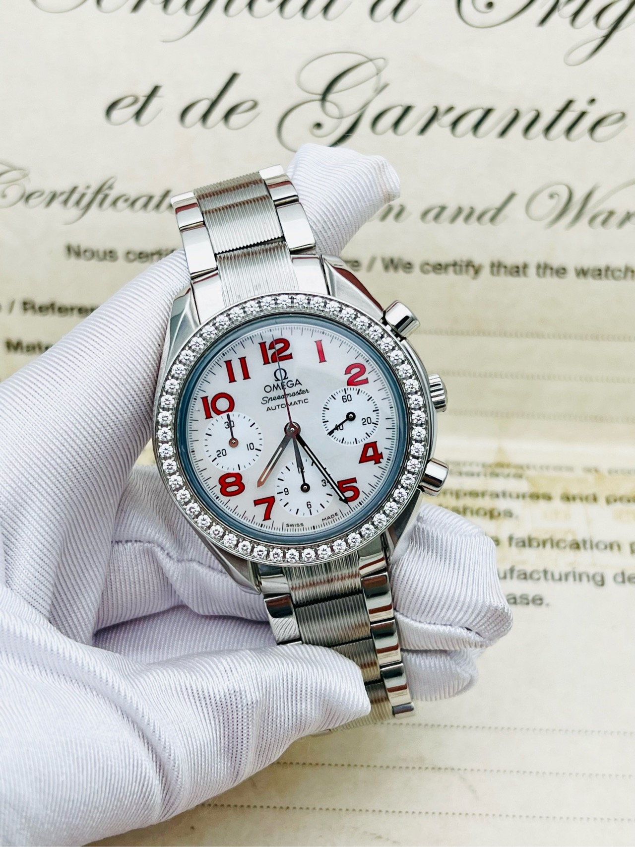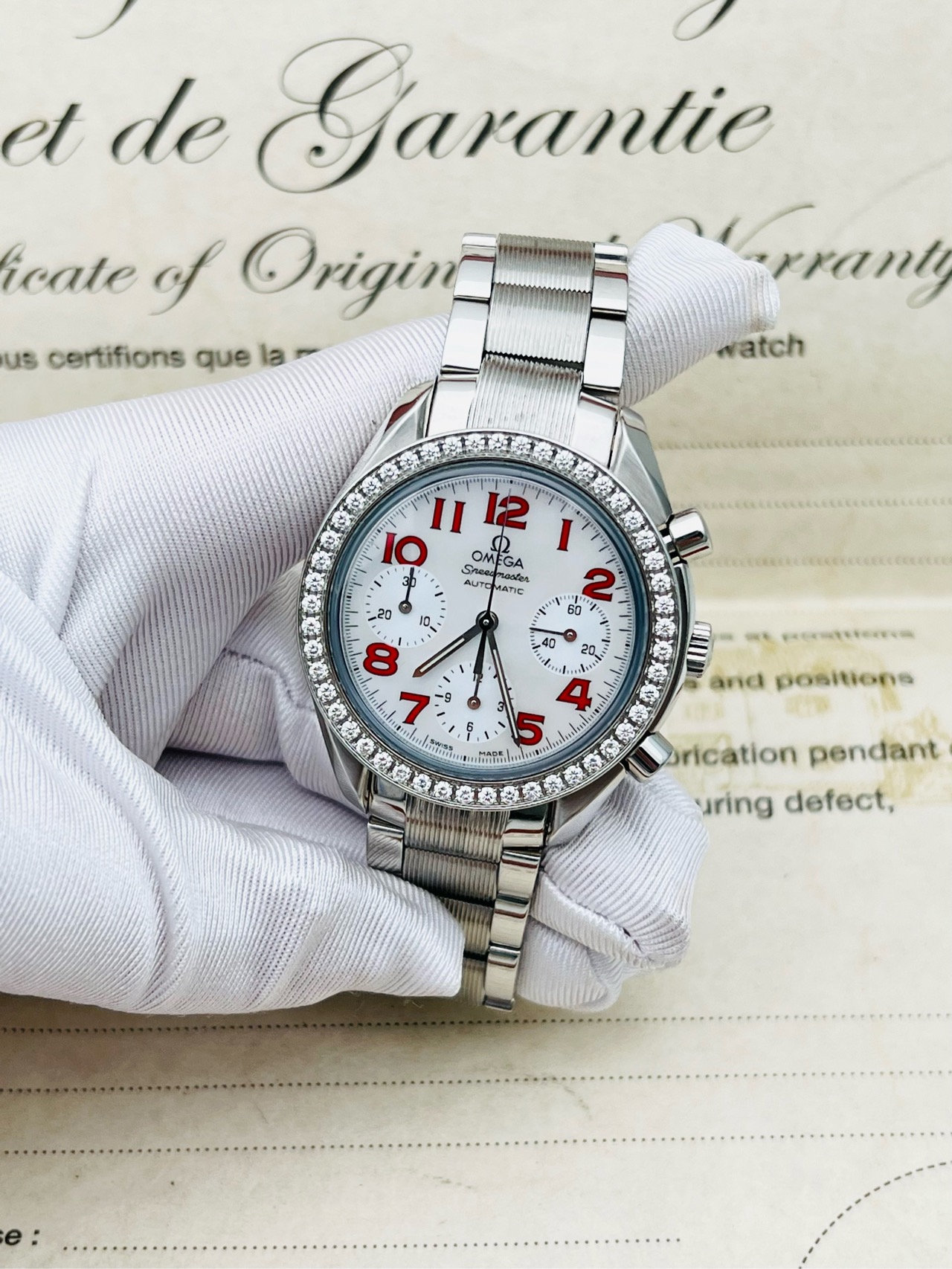 表壳材质:精钢镶钻 表盘材质:珍珠贝母,红色时标