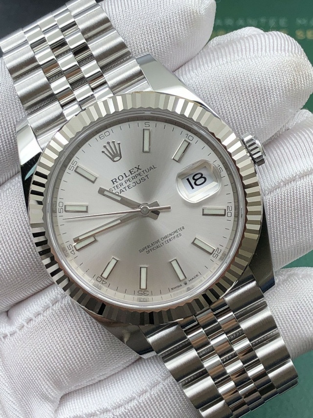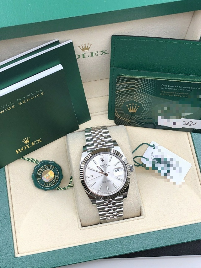 2021年11月购买于专柜,工价7.95万,男士新款腕表,直径41毫米,五珠带,狗牙圈,条丁夜光刻度,日历显示,这只全新未使用