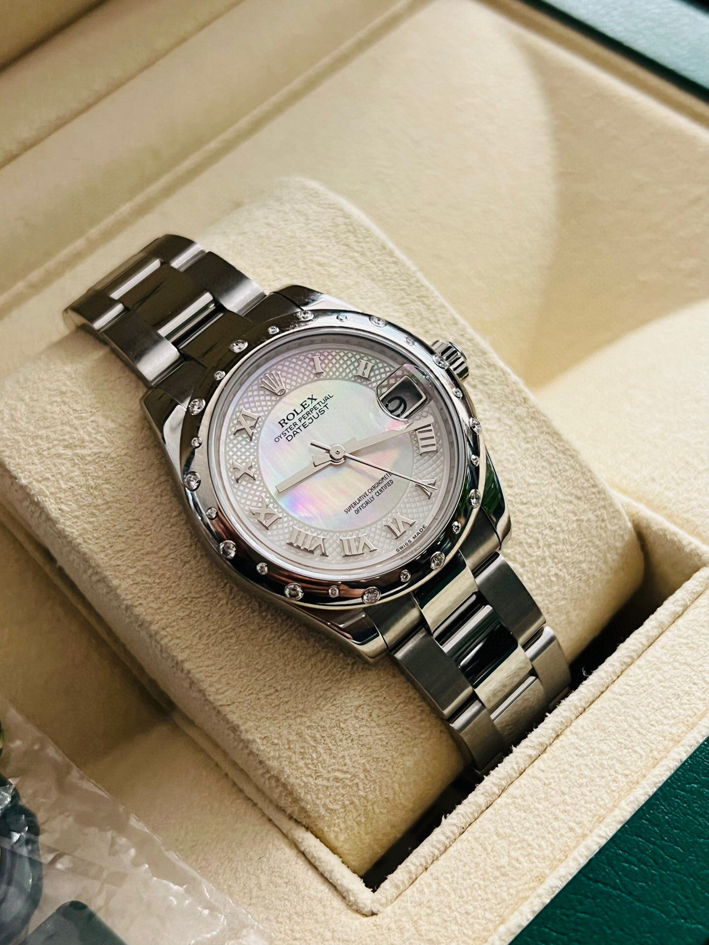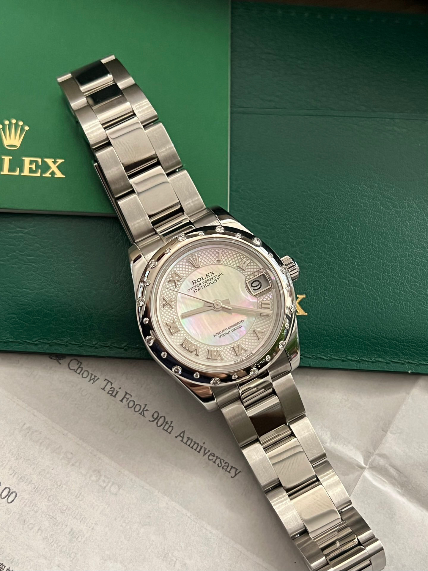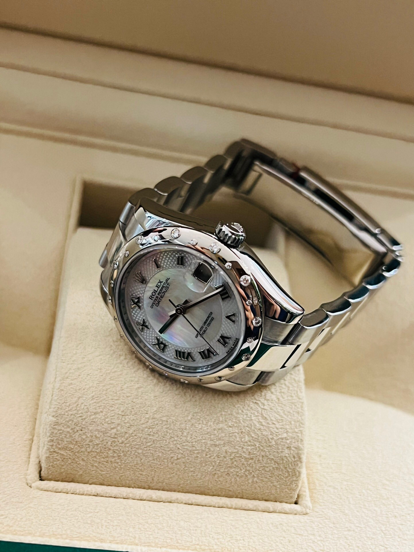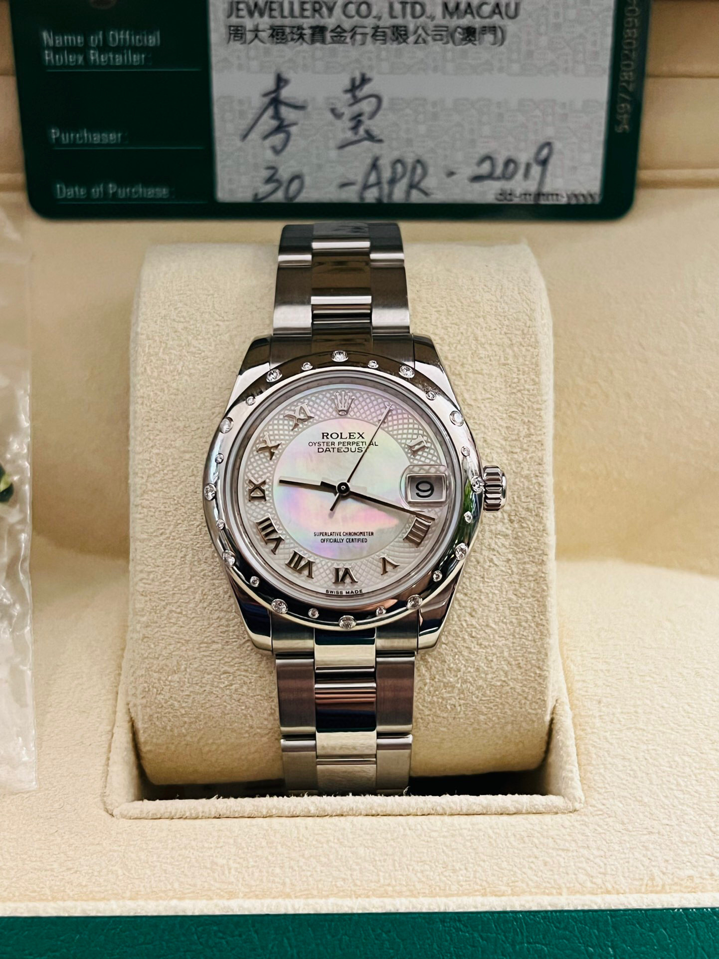劳力士稀有贝母镶钻日志型系列型号:178344自动机械女士腕表,31毫米表径,表圈18k白金镶钻 表盘材质:白色珍珠母镶有钻石 表带材质:不锈钢 功能:日期显示 2019年全套全长带票发票价格93050,参考普通贝母面公价120500元,这款特殊盘面公价更高