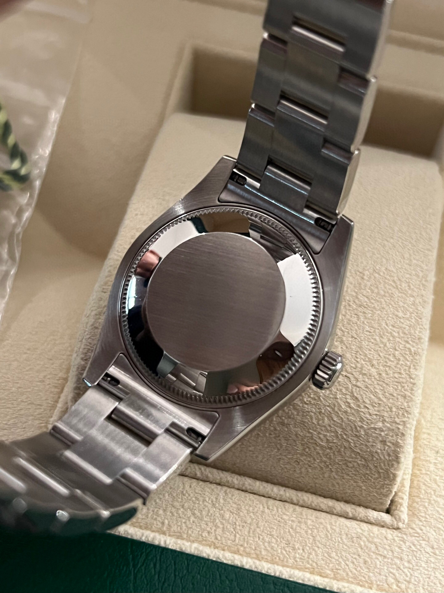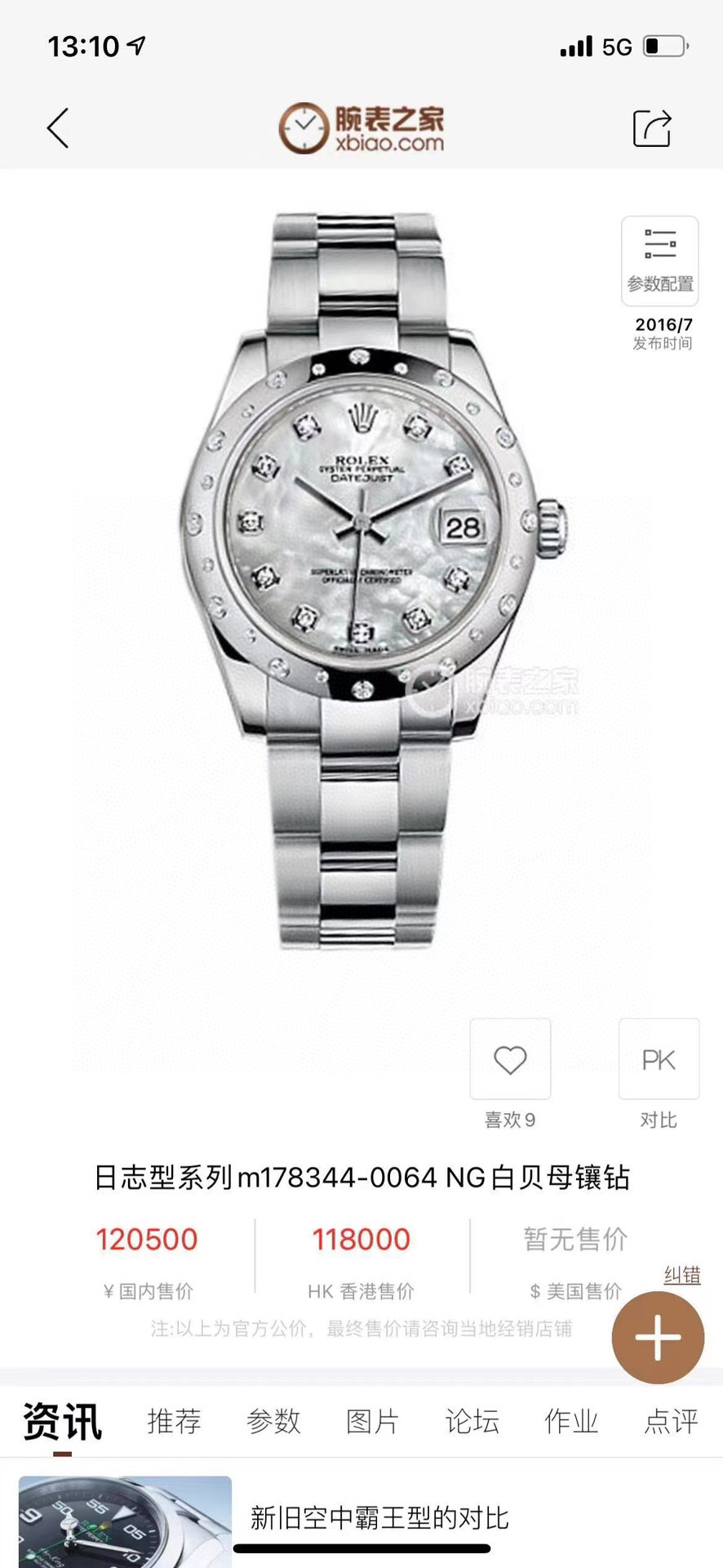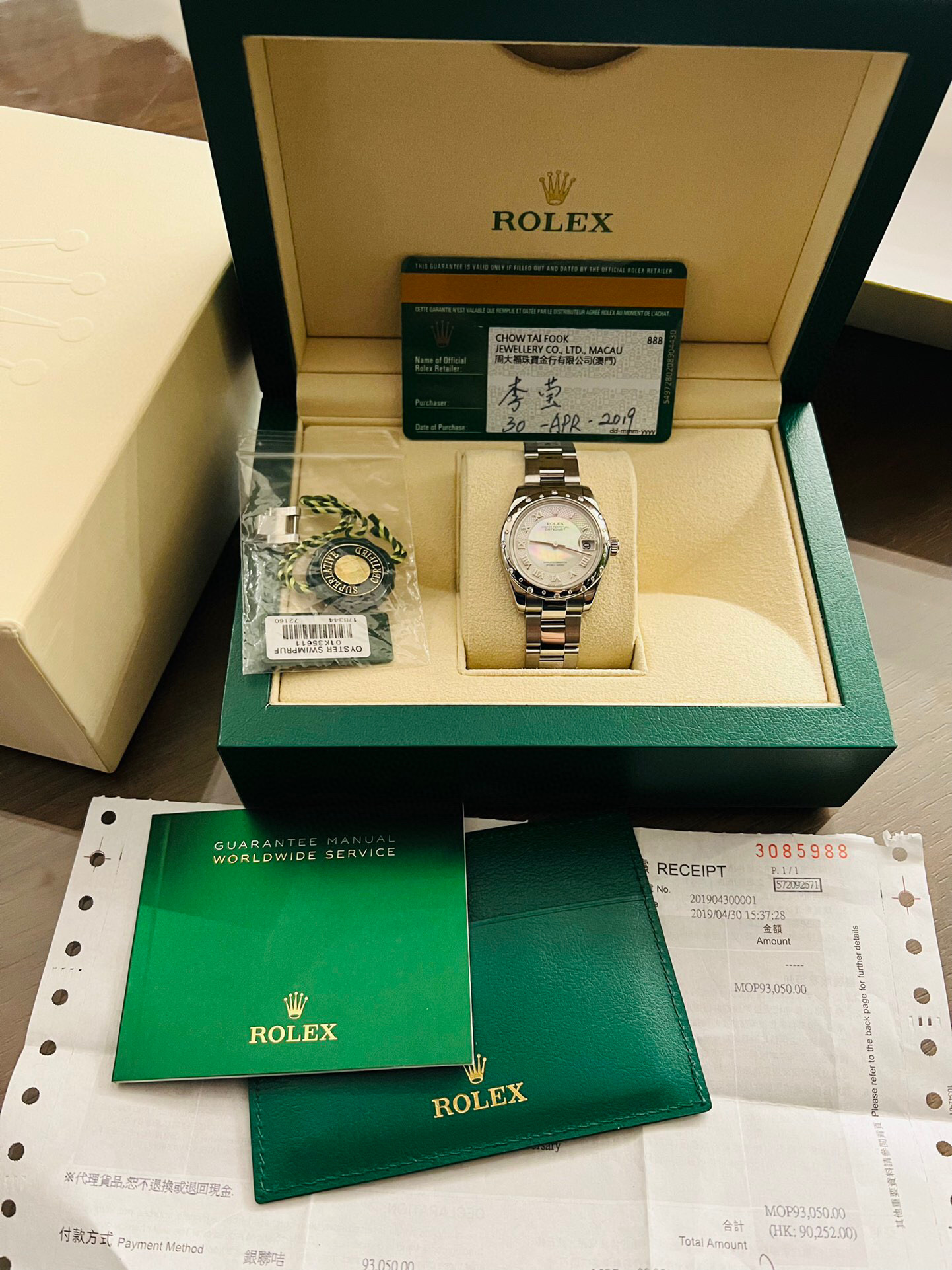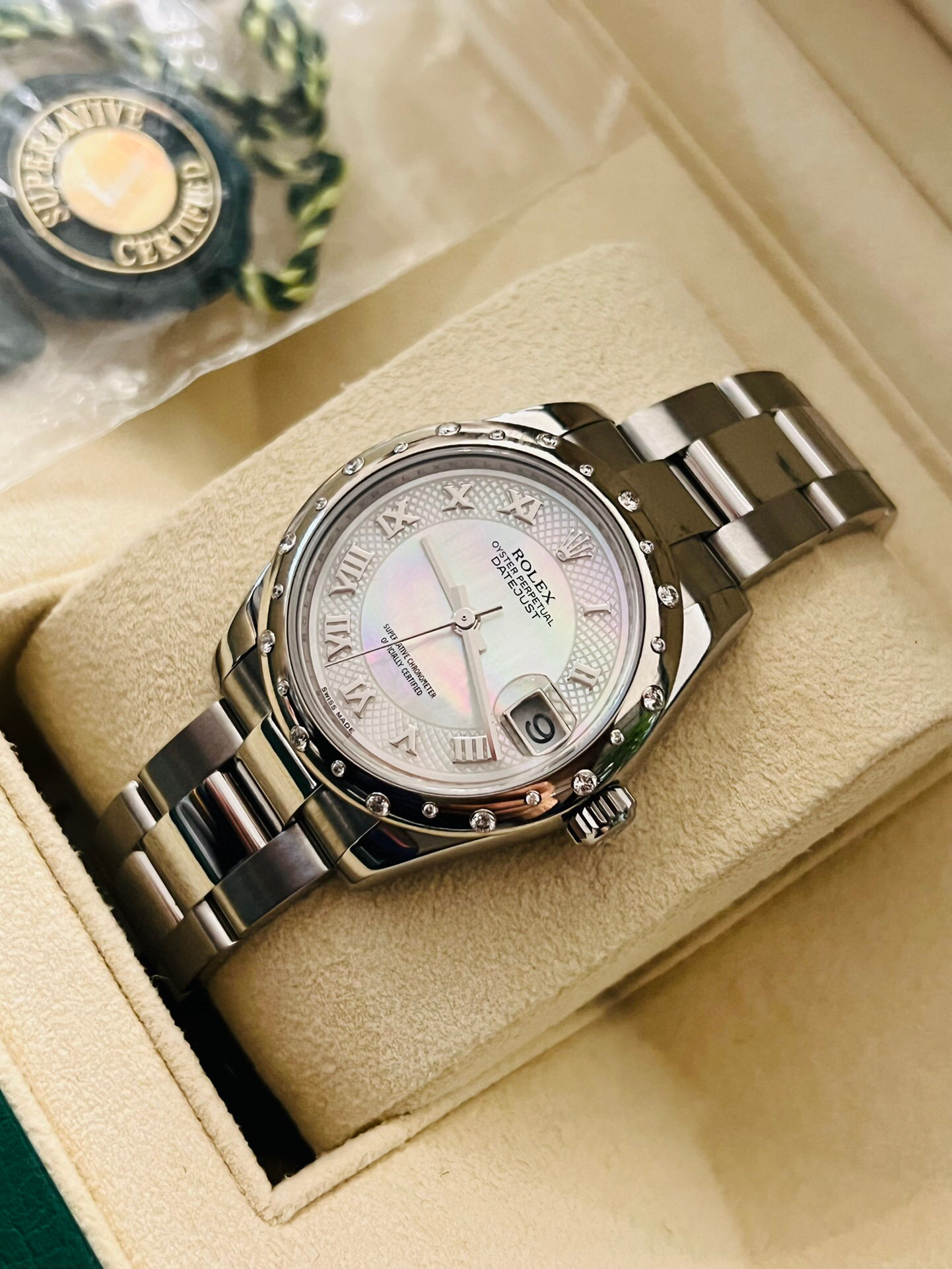 劳力士稀有贝母镶钻日志型系列型号:178344自动机械女士腕表,31毫米表径,表圈18k白金镶钻 表盘材质:白色珍珠母镶有钻石 表带材质:不锈钢 功能:日期显示 2019年全套全长带票发票价格93050,参考普通贝母面公价120500元,这款特殊盘面公价更高