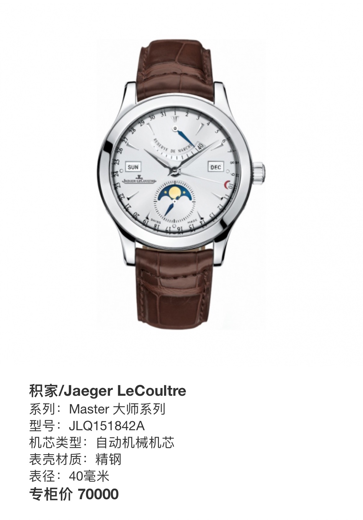 积家/Jaeger LeCoultre Master 大师系列 JLQ151842A 自动机械机芯 精钢 40毫米 专柜价 70000