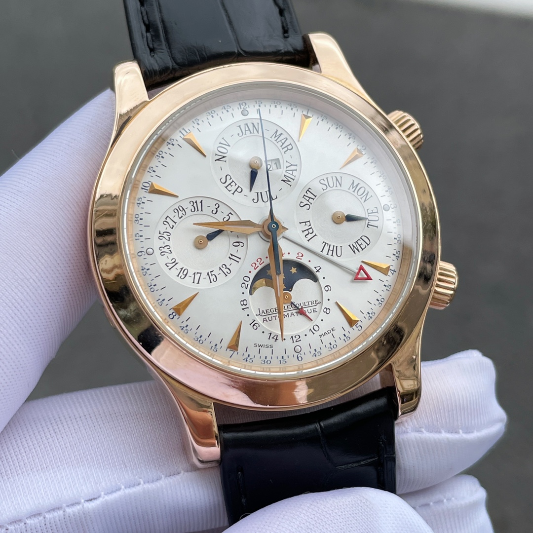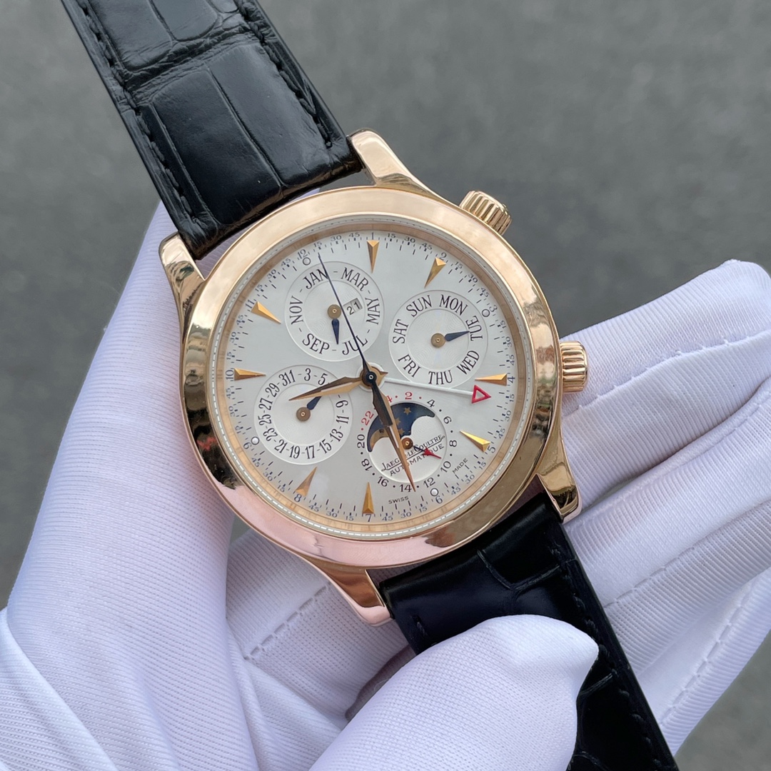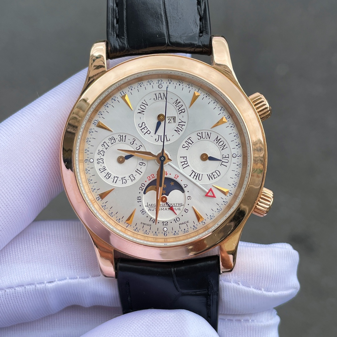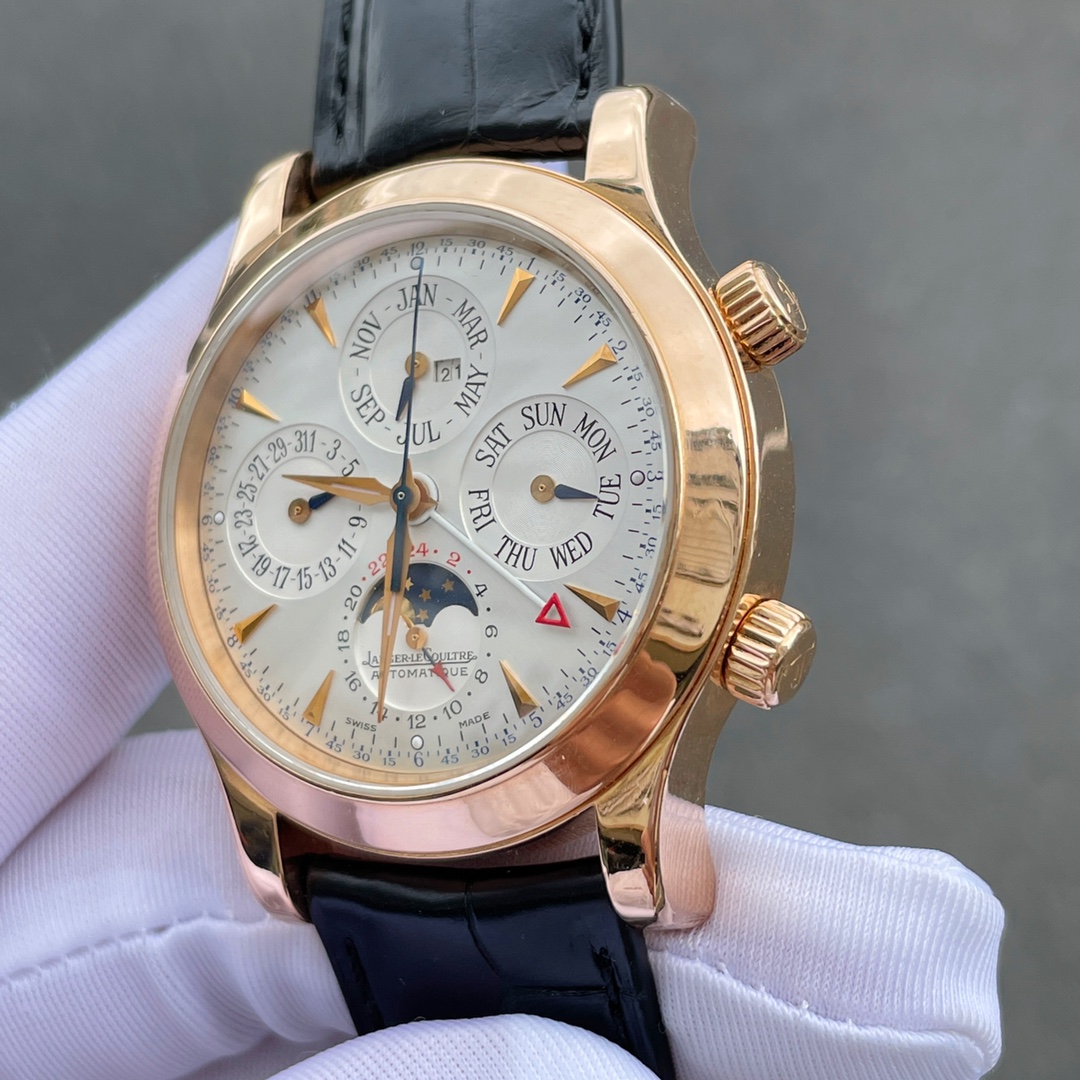 积家传统大师系列Q146242a,18K玫瑰金材质,42mm表径,万年历功能,月相功能,闹铃功能,金折叠扣,专柜售价445000,二手单表好价分享