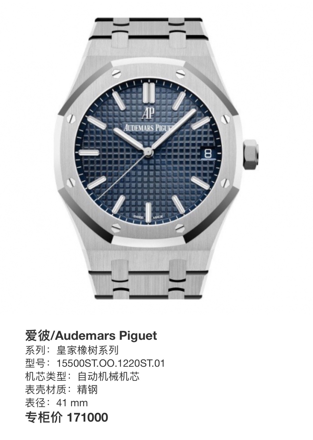 爱彼/Audemars Piguet 皇家橡树系列 15500ST.OO.1220ST.01 自动机械机芯 精钢 41 mm 21年未使用全套 专柜价 171000元 现特价