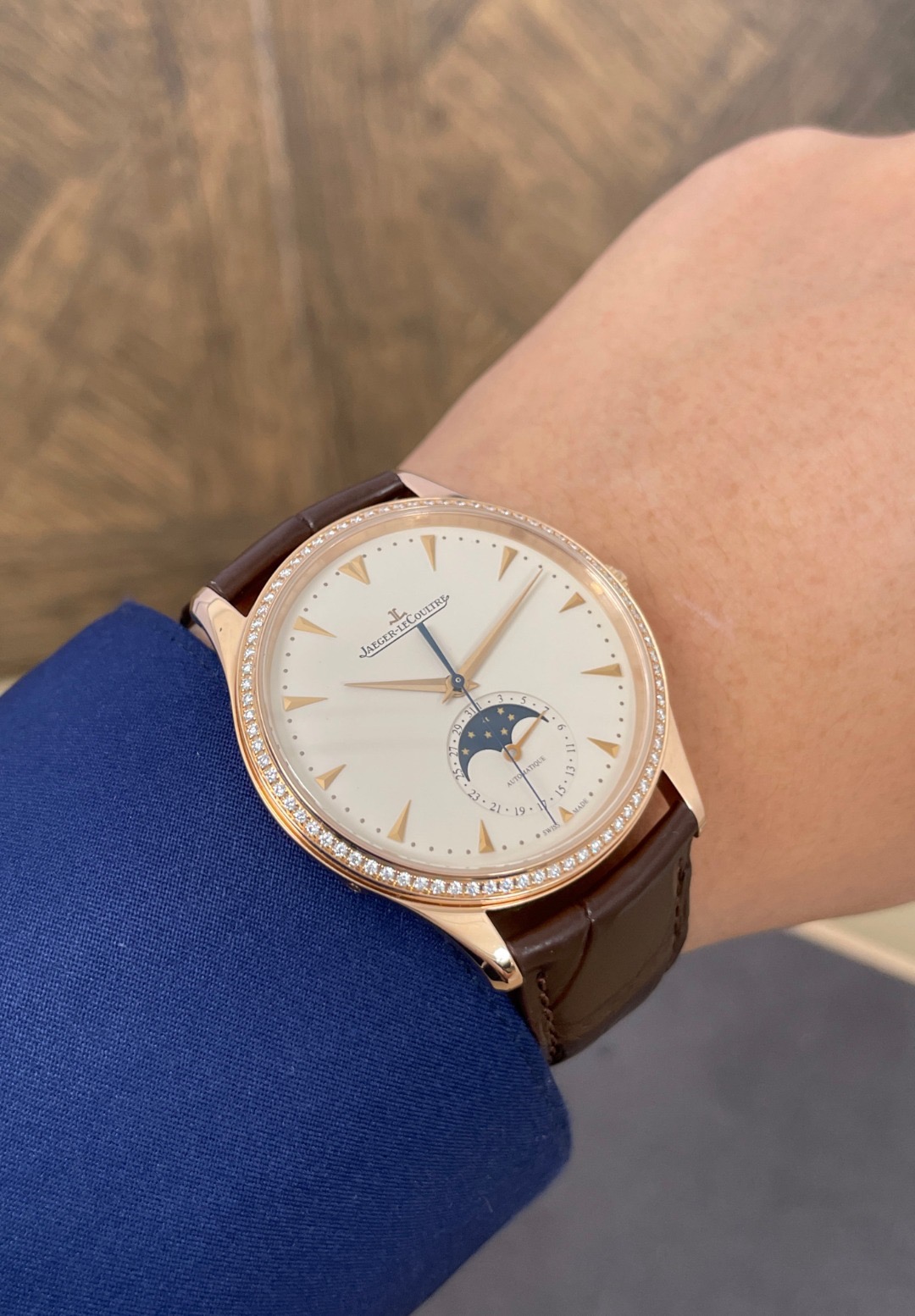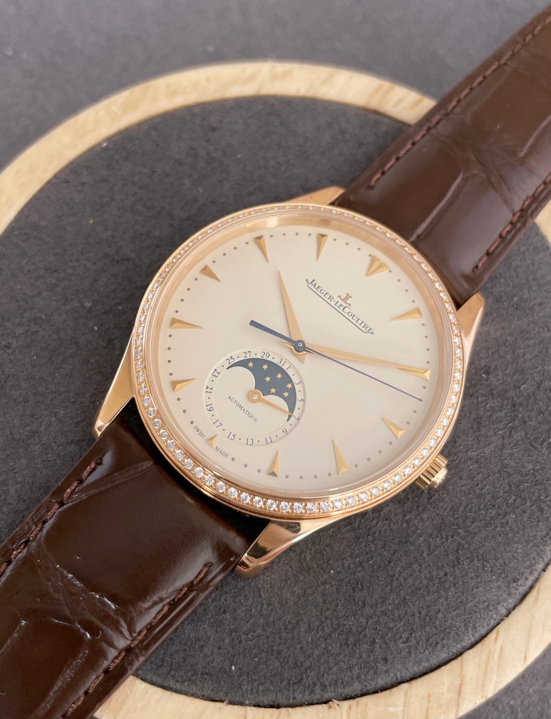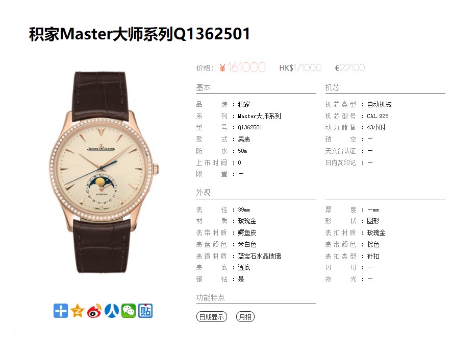 积家Master大师系列18K玫瑰金原镶钻自动机械男表】 型号:Q1362501 表径:39mm 功能:日期显示; 月相; ----专柜价:161000