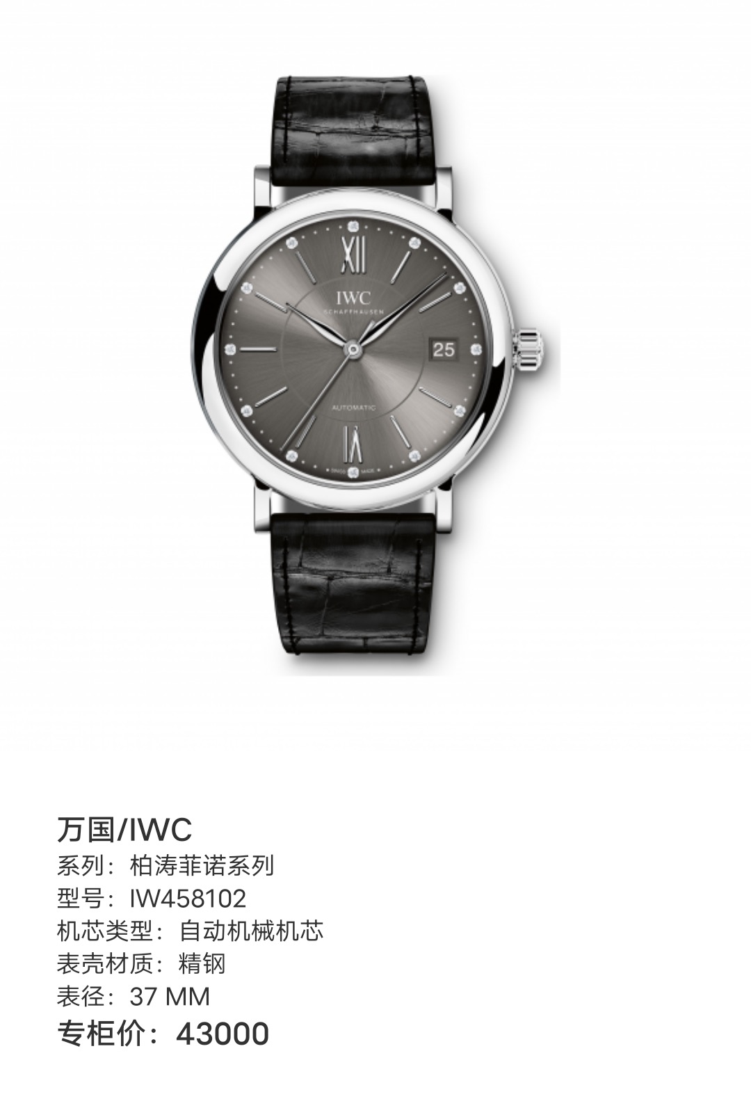 万国/IWC 柏涛菲诺系列 IW458102 自动机械机芯 精钢 37 MM 专柜价43000 店内现货好价 空白保卡